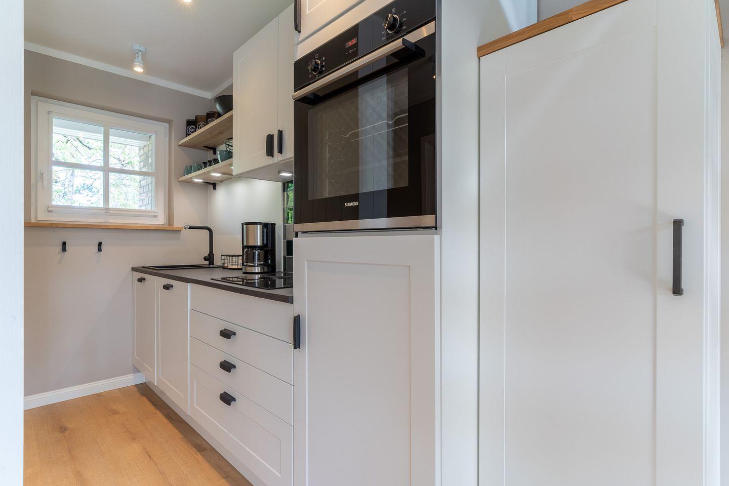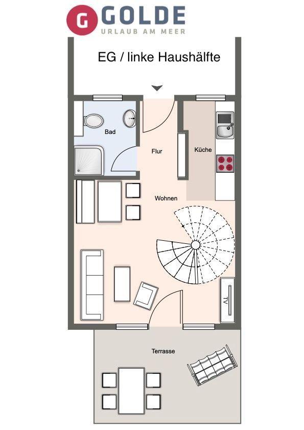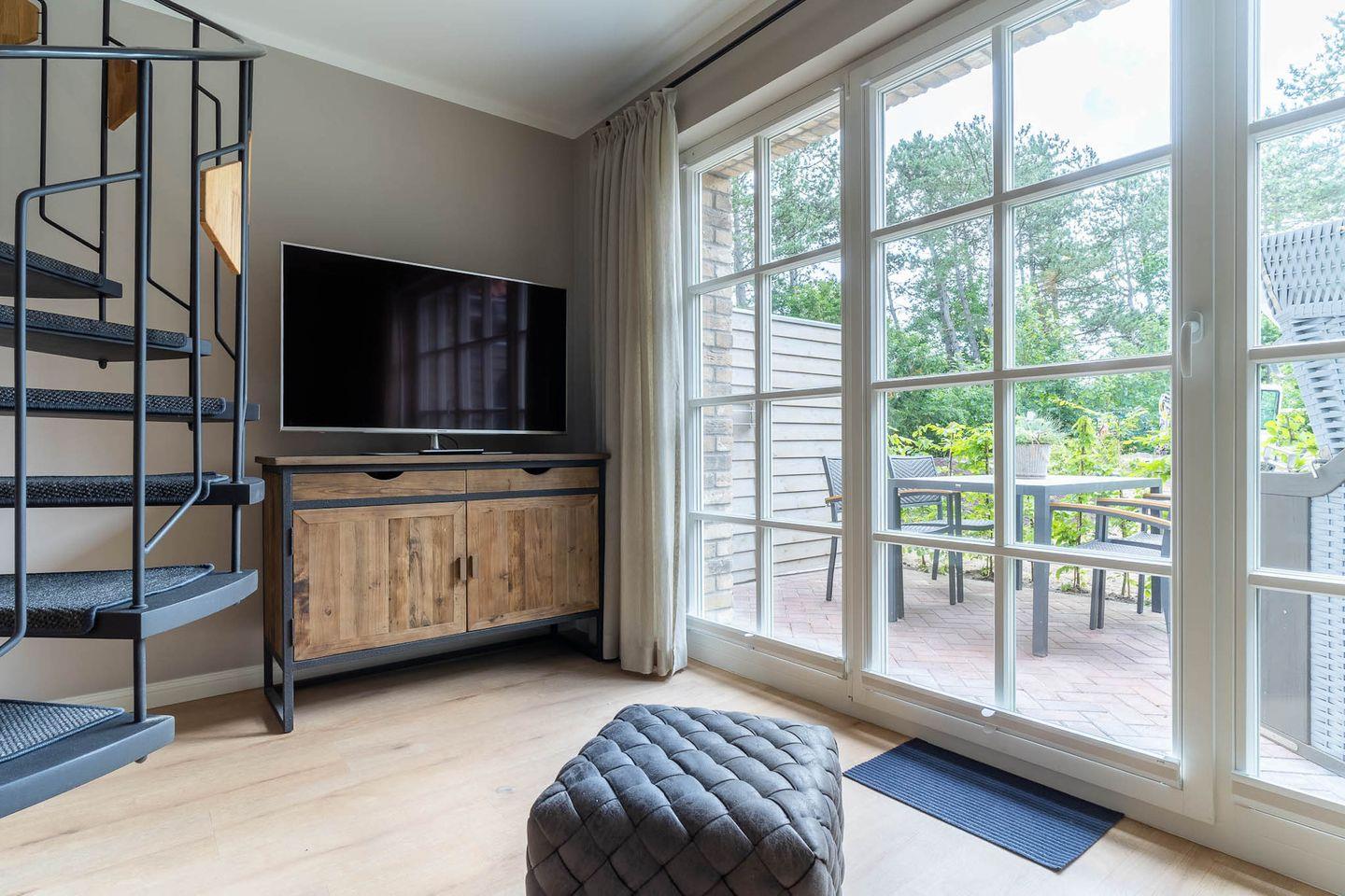 Im Erdgeschoss befindet sich ein großzügiger Wohnraum mit TV und einer modernen Wohnküche. Die Küche ist voll ausgestattet und verfügt über hochwertige Elektrogeräte.
