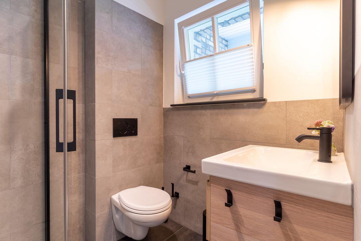 Vom Wohnzimmer gelangen Sie auf eine gemütliche, sonnige Süd Terrasse mit stylischen Gartenmöbeln. An dem Wohnflur mit Garderobe schließt sich ein Duschbad an.