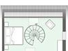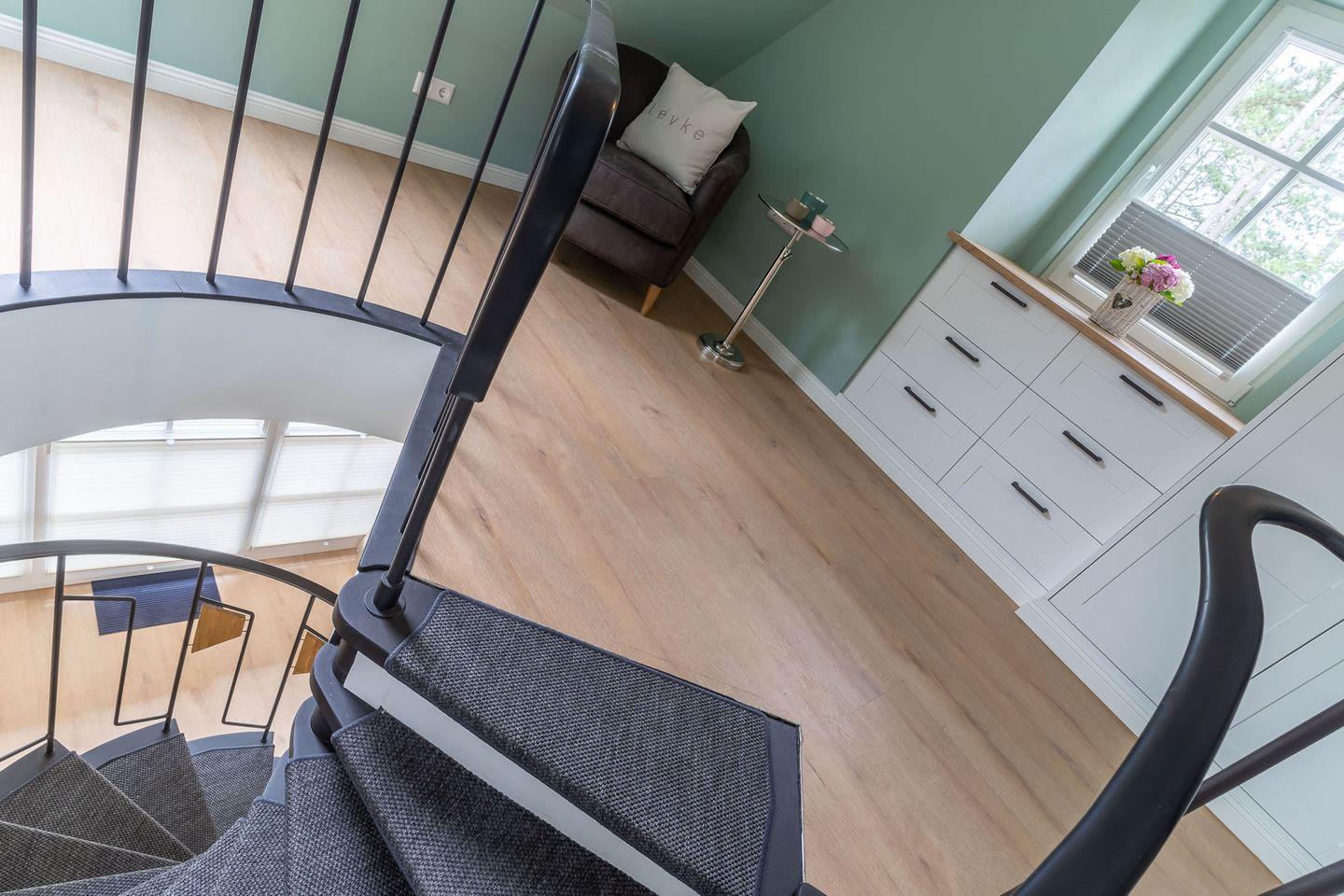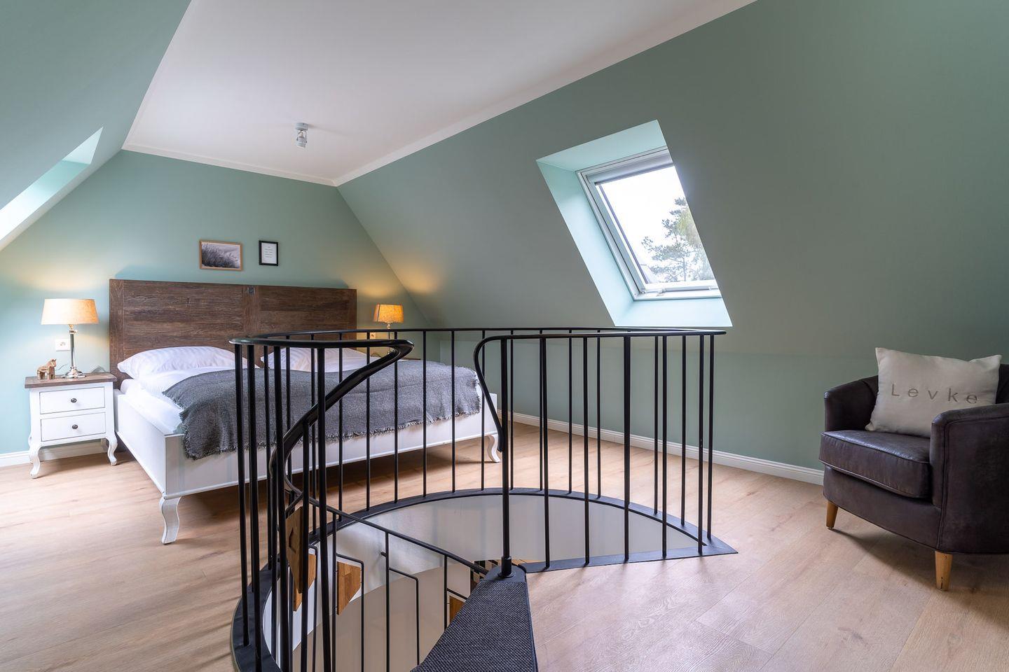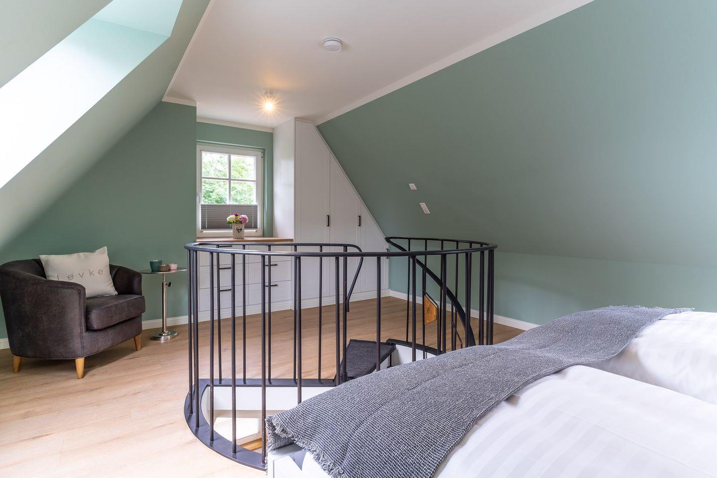 Über eine Wendeltreppe aus dem Wohnraum gelangt man in das Obergeschoss. Hier befindet sich das gemütliche Schlafzimmer, mit einem Doppelbett.