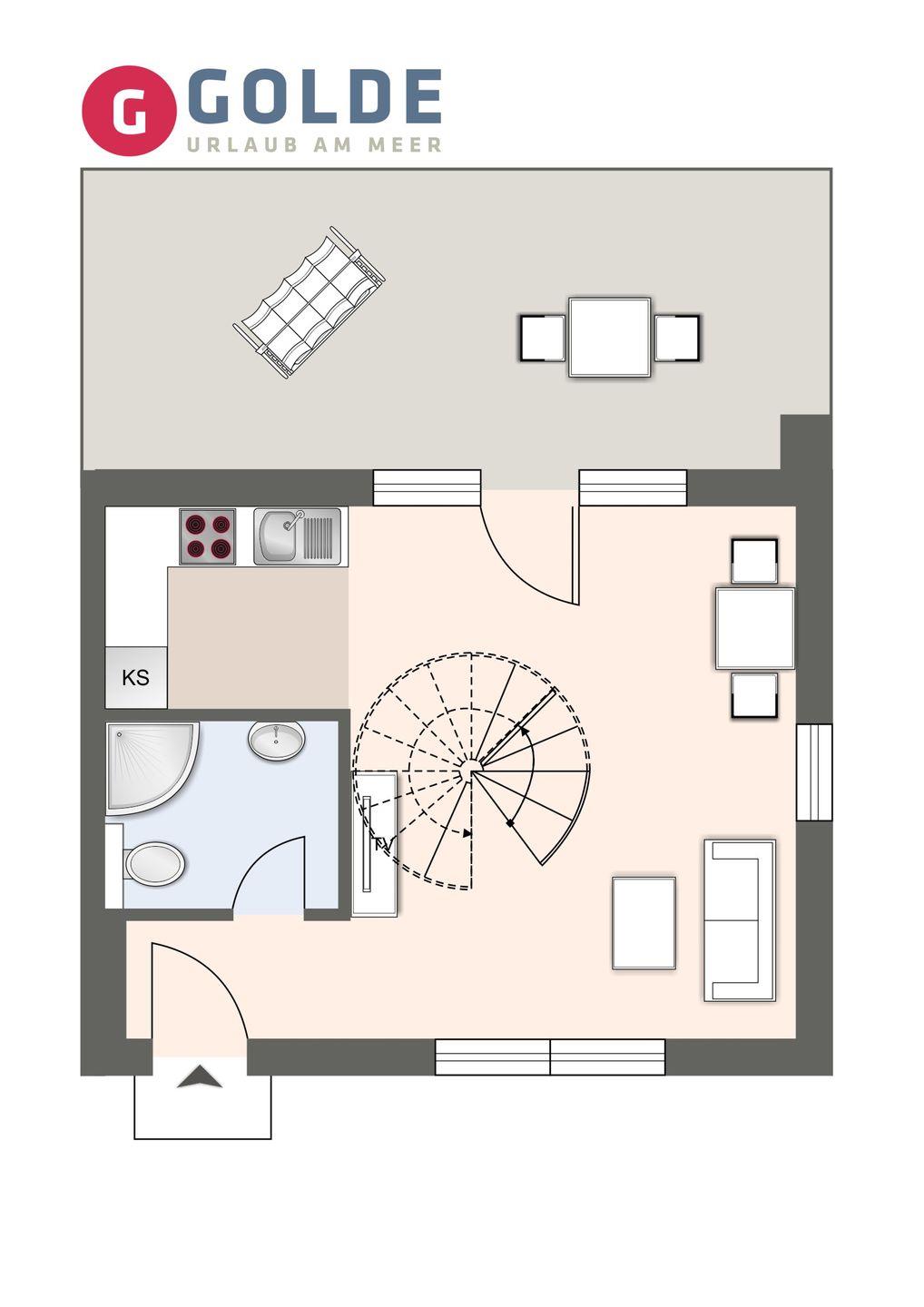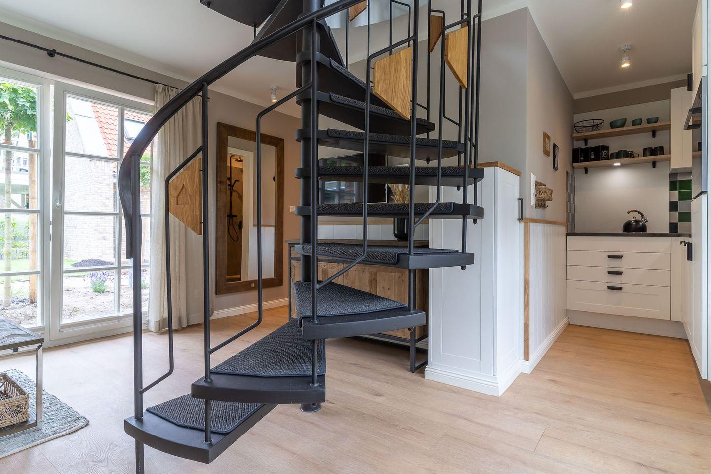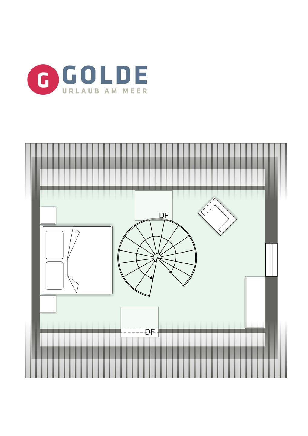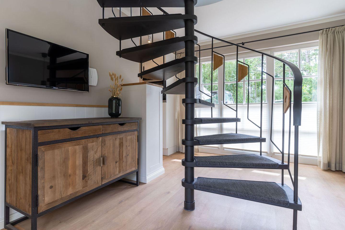 Über eine Wendeltreppe aus dem Wohnraum gelangt man in das Obergeschoss. Hier befindet sich das gemütliche Schlafzimmer, mit einem Doppelbett.