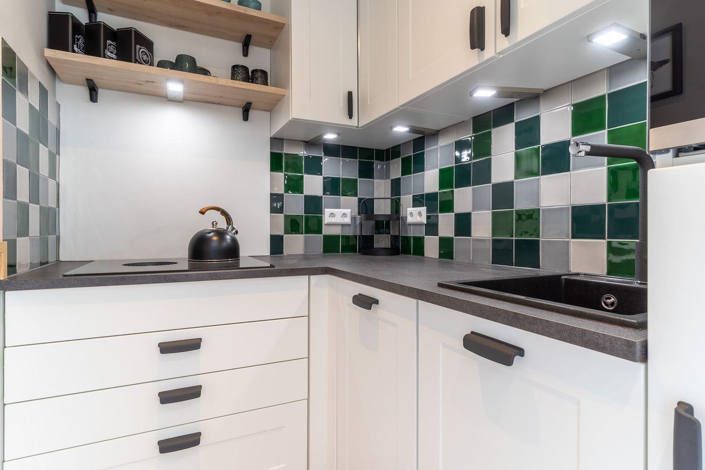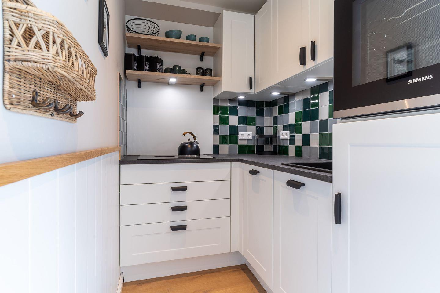 Im Erdgeschoss befindet sich ein großzügiger Wohnraum mit TV und einer modernen Wohnküche. Die Küche ist voll ausgestattet und verfügt über hochwertige Elektrogeräte.