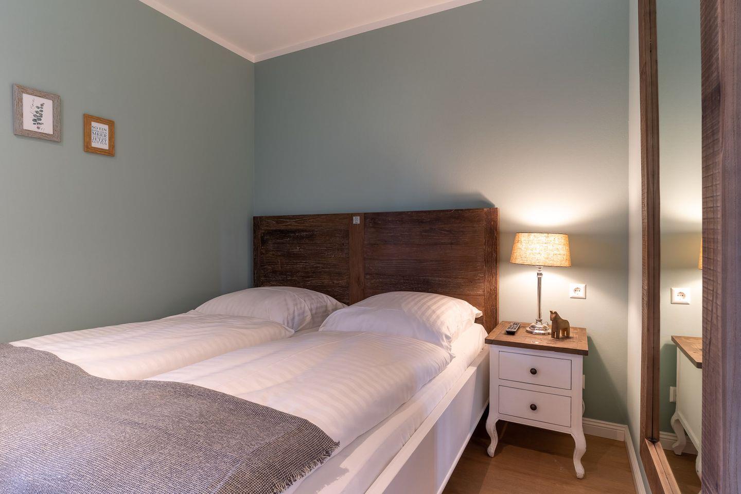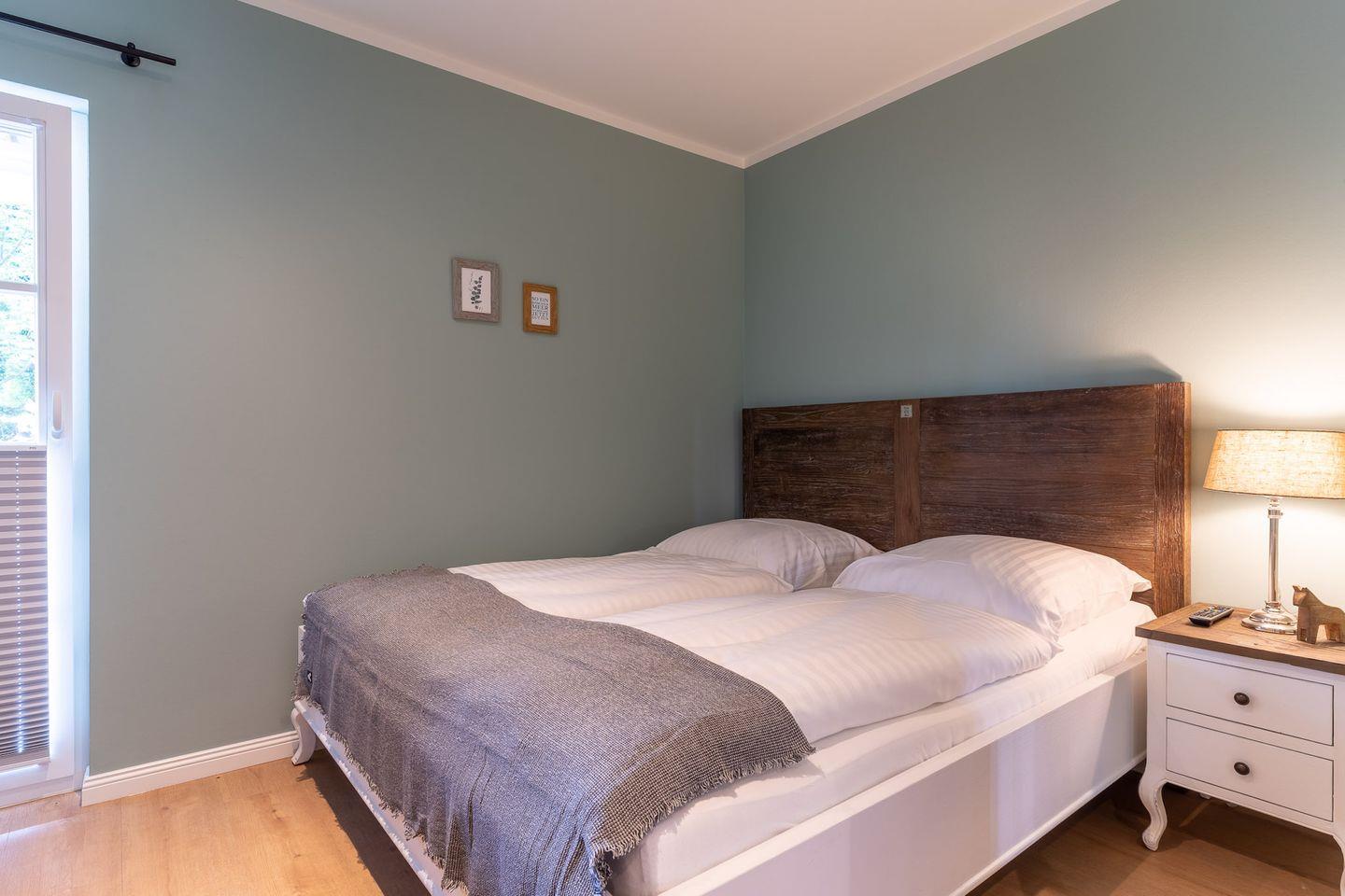 Das gemütliche Schlafzimmer ist mit einem Doppelbett ausgestattet und gewährt Ihnen einen direkten Zugang zur Terrasse.