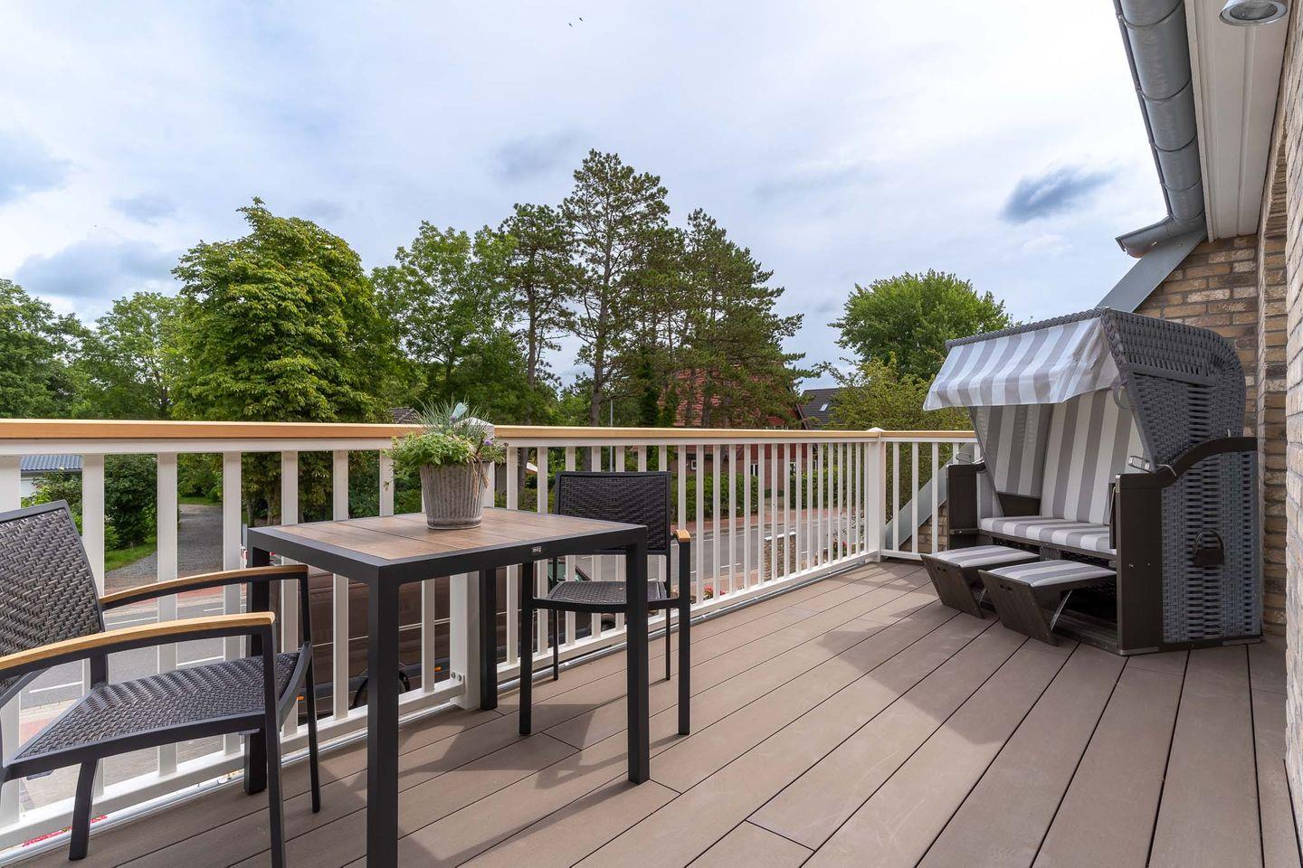 Vom Wohnzimmer gelangen Sie auf den gemütlichen Nord/Ost-Balkon mit stylischen Gartenmöbeln. An den Wohnraum schließt sich ein Duschbad an.