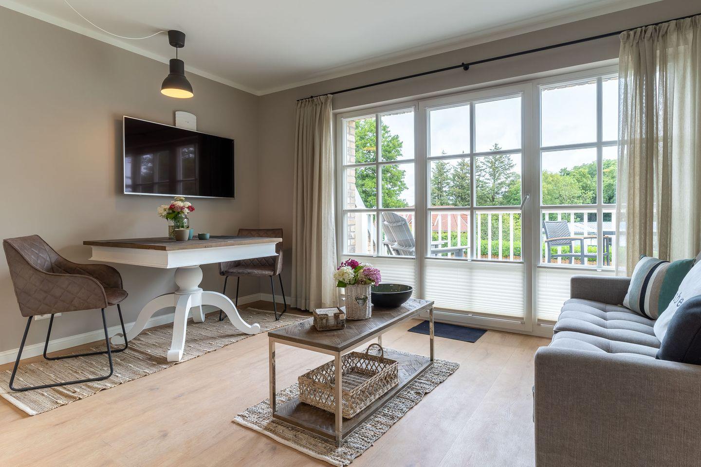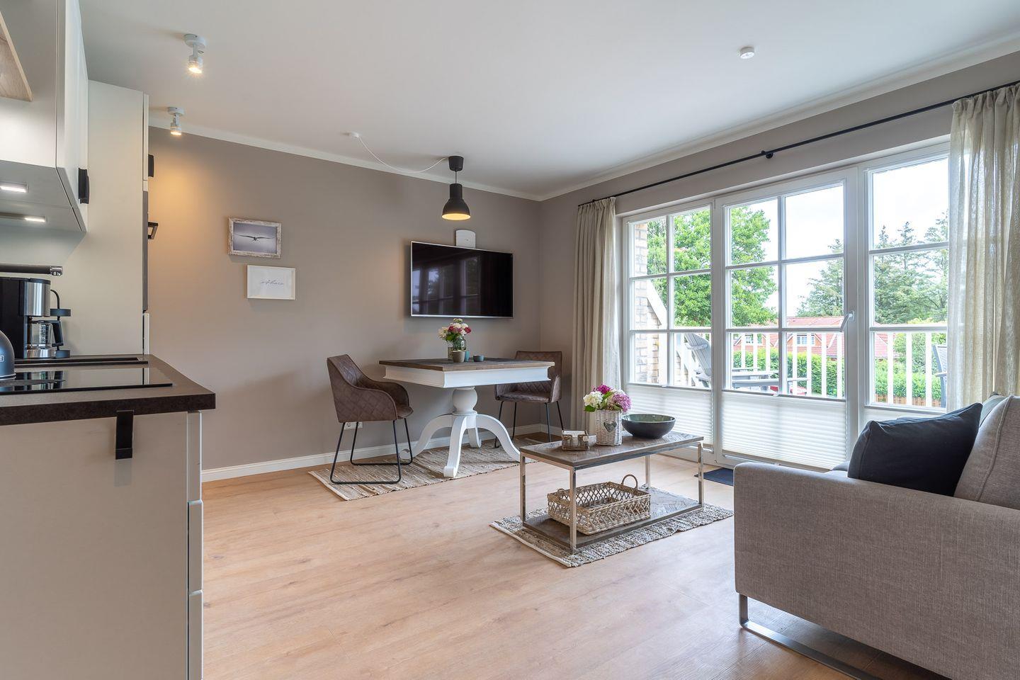 Der lichtdurchflutete Wohnraum mit einer offenen Wohnküche und einem gemütlichen Essbereich bietet jeden Komfort. Die Küche ist voll ausgestattet und verfügt über hochwertige Elektrogeräte.
