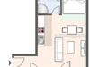 An den Wohnbereich schließt sich ein Duschbad an. Der Schlafbereich ist mit einem Doppelbett ausgestattet.
