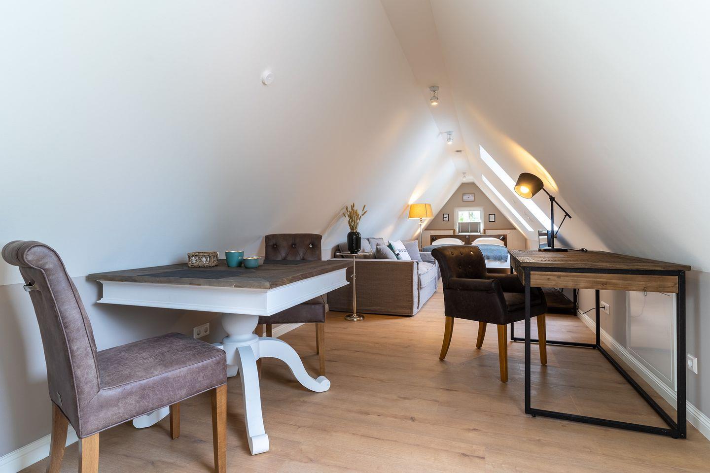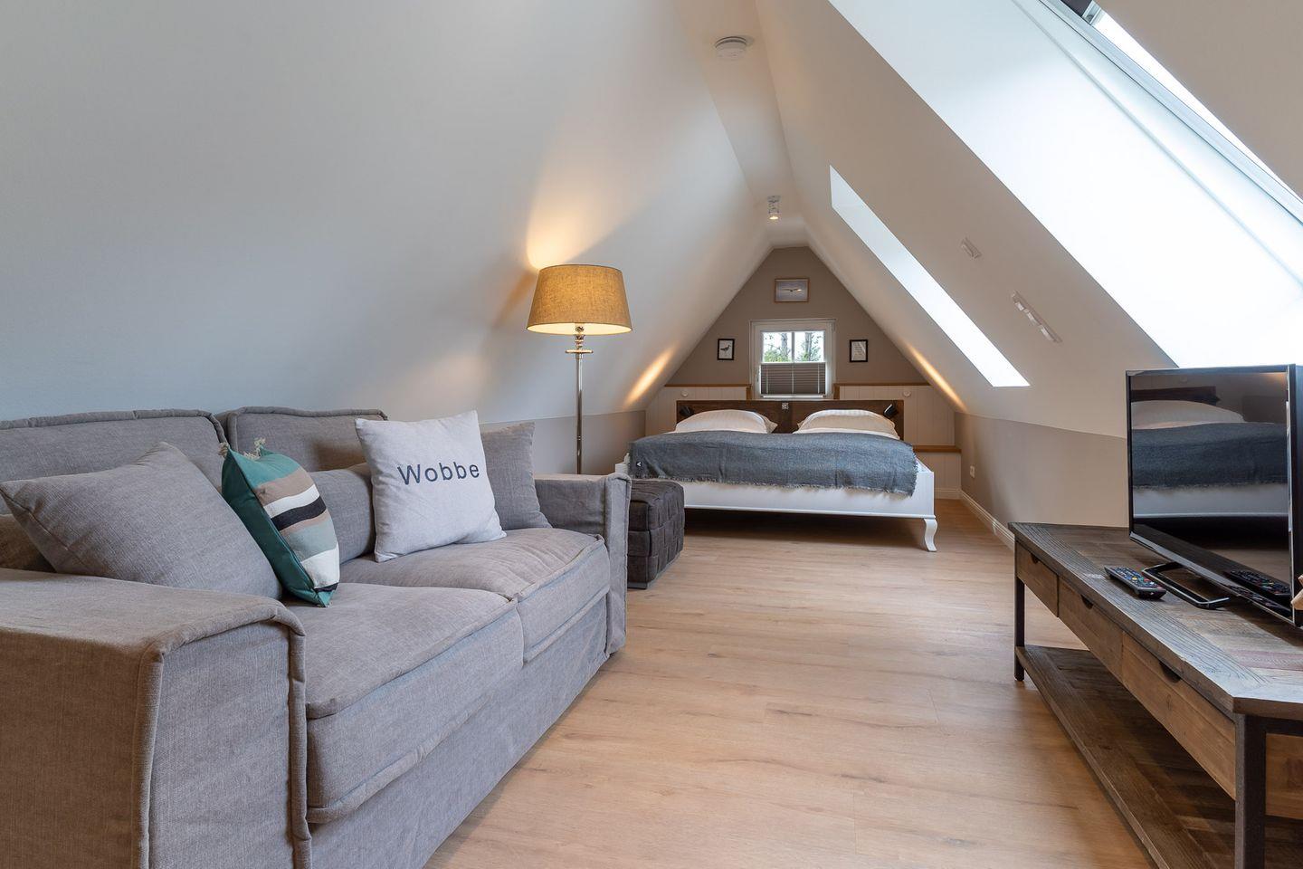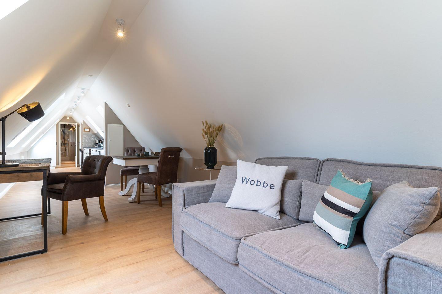 Das luxuriöse Loft Appartement "Wobbe" in dem "Haus Böhl" liegt im Dachgeschoss und verfügt über ca. 40m² Wohnfläche. Es bietet Platz für 1-2 Personen.