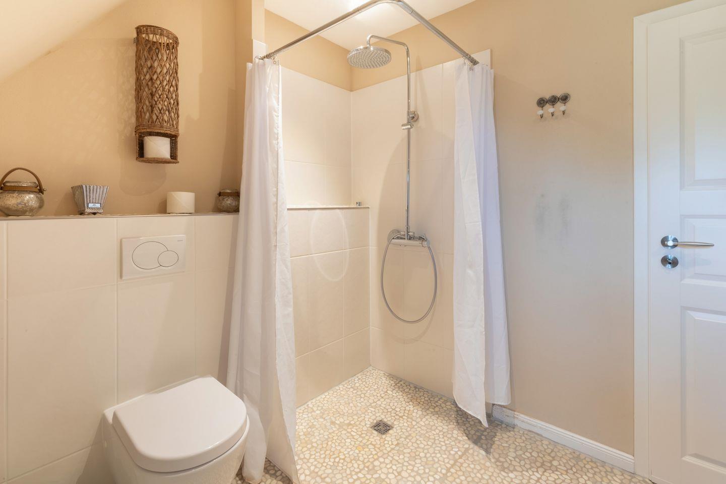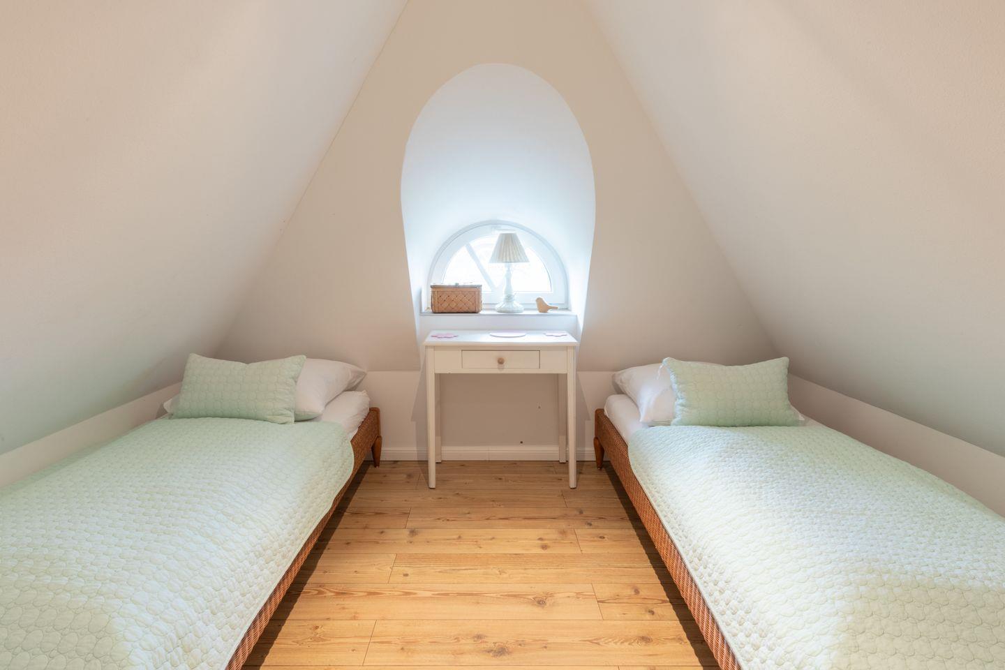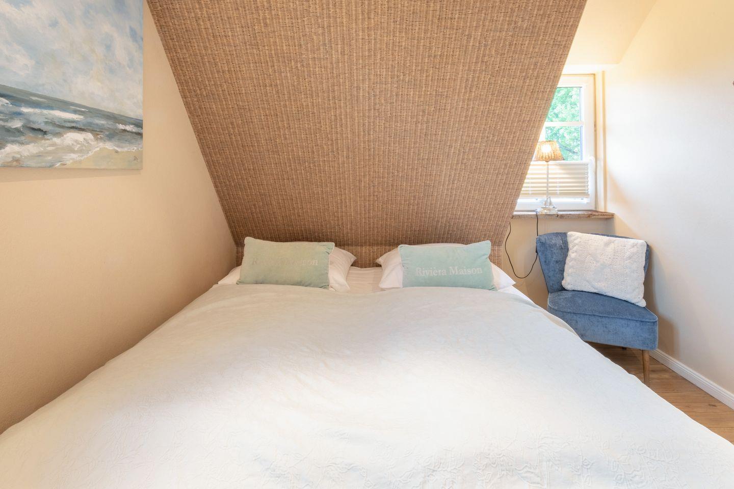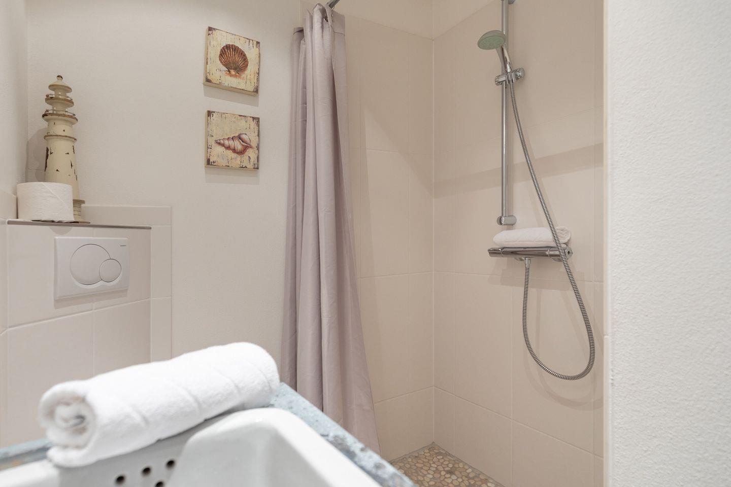 Im Obergeschoss befinden sich zwei Schlafzimmer mit je einem Doppelbett (180x200cm, durchgehende Matratze) und einer großen Schrankwand. Im Dachgeschoss finden Sie ein weiteres Schlafzimmer mit zwei Einzelbetten (90x200cm) vor. Hier schlafen Sie bei ausreichender Deckenhöhe unter Dachschrägen im Spitzboden mit klassisch friesischem Rundbogenfenster. Das moderne Badezimmer ist sowohl mit einer Badewanne als auch mit einer ebenerdigen Regendusche ausgestattet. Ein weiteres Bad im Erdgeschoss verfügt über eine ebenerdige Dusche sowie Gäste WC. Im Hauswirtschaftsraum unter der Treppe steht für Sie zur kostenlosen Nutzung eine Waschmaschine bereit. Für Ihr Auto befindet sich ein Stellplatz am Haus.