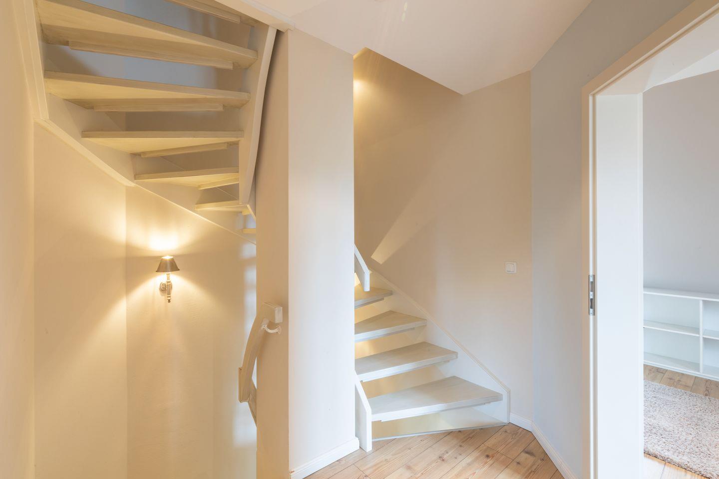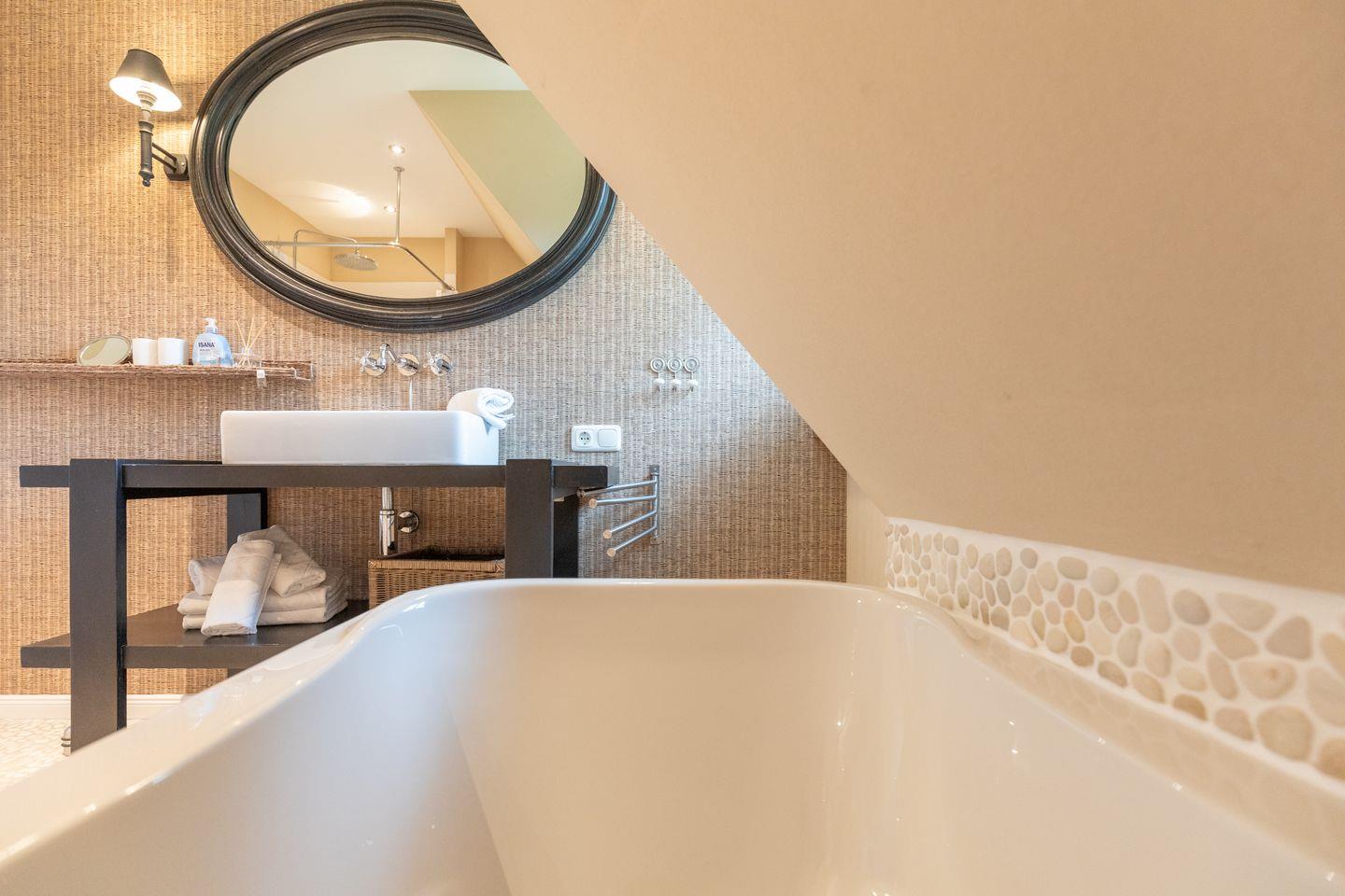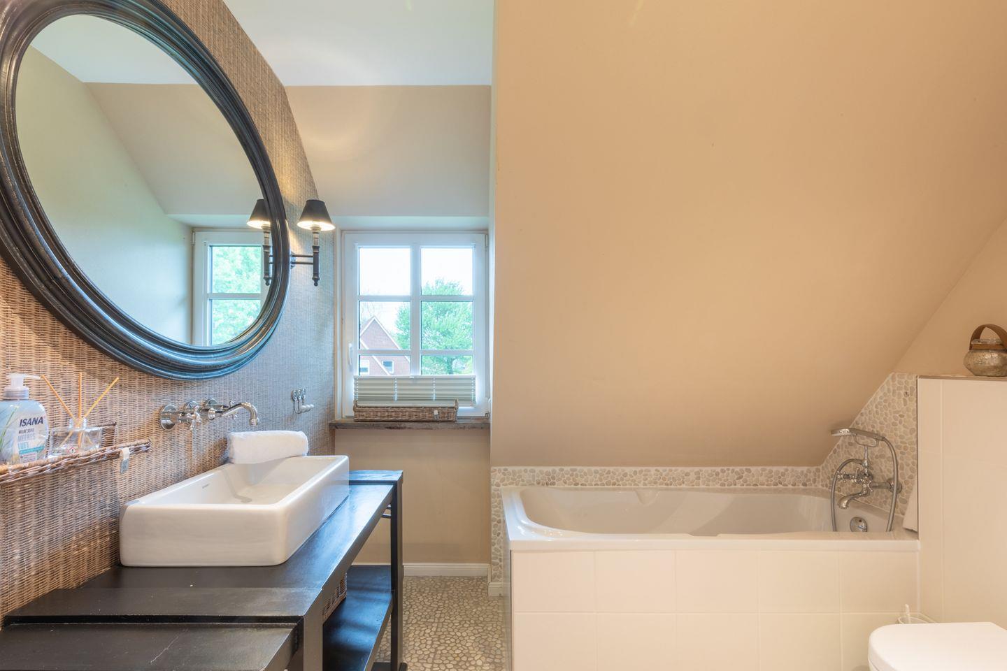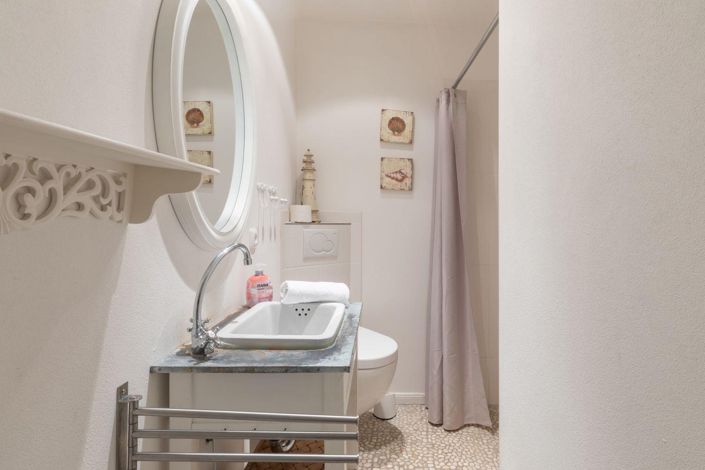 Im Obergeschoss befinden sich zwei Schlafzimmer mit je einem Doppelbett (180x200cm, durchgehende Matratze) und einer großen Schrankwand. Im Dachgeschoss finden Sie ein weiteres Schlafzimmer mit zwei Einzelbetten (90x200cm) vor. Hier schlafen Sie bei ausreichender Deckenhöhe unter Dachschrägen im Spitzboden mit klassisch friesischem Rundbogenfenster. Das moderne Badezimmer ist sowohl mit einer Badewanne als auch mit einer ebenerdigen Regendusche ausgestattet. Ein weiteres Bad im Erdgeschoss verfügt über eine ebenerdige Dusche sowie Gäste WC. Im Hauswirtschaftsraum unter der Treppe steht für Sie zur kostenlosen Nutzung eine Waschmaschine bereit. Für Ihr Auto befindet sich ein Stellplatz am Haus.