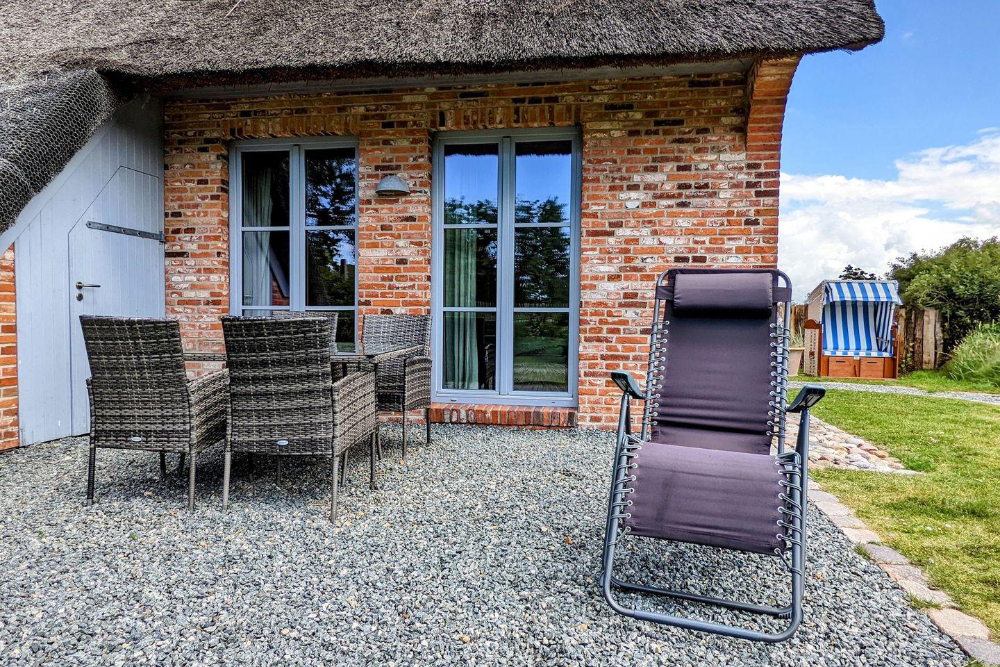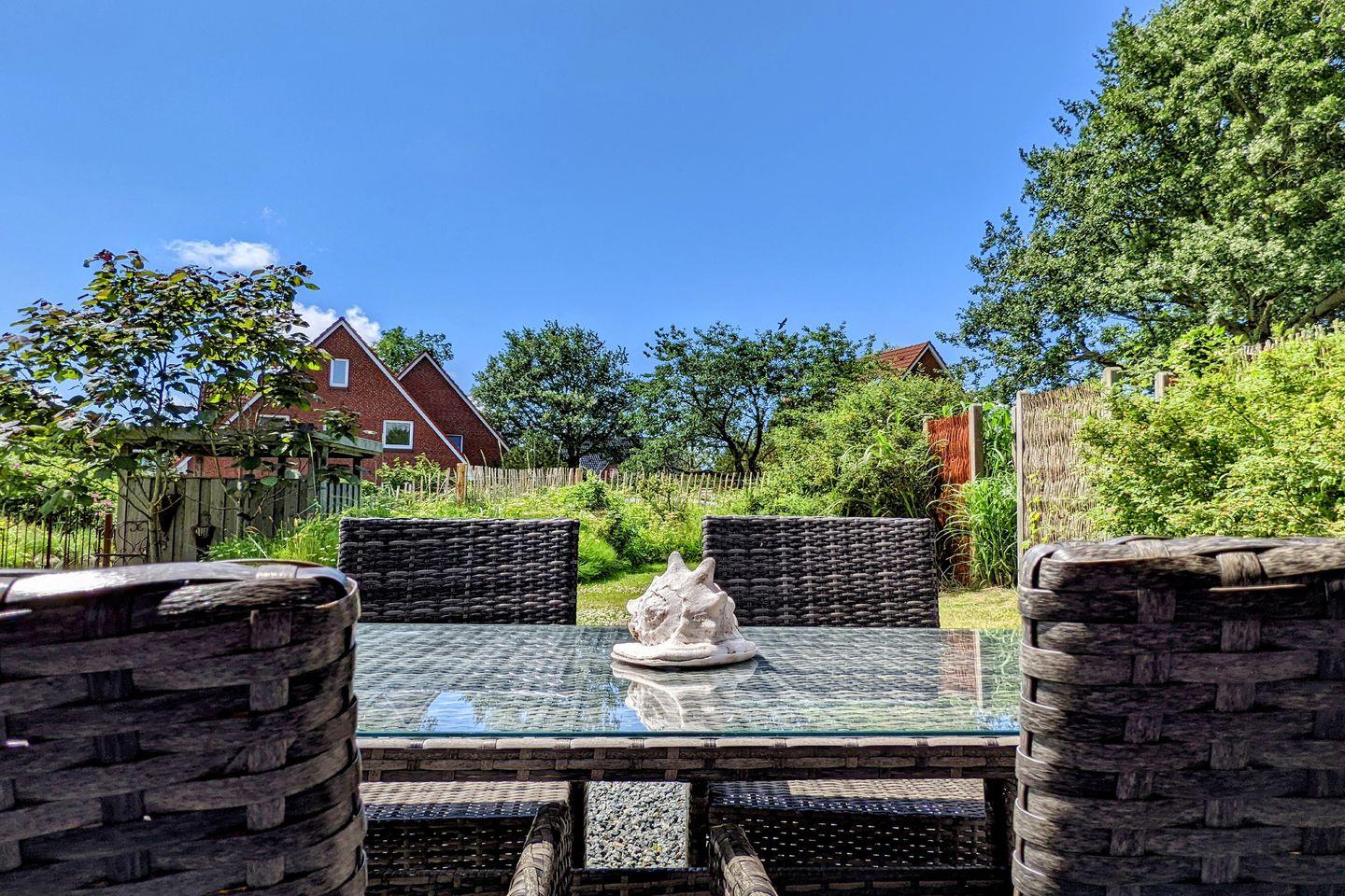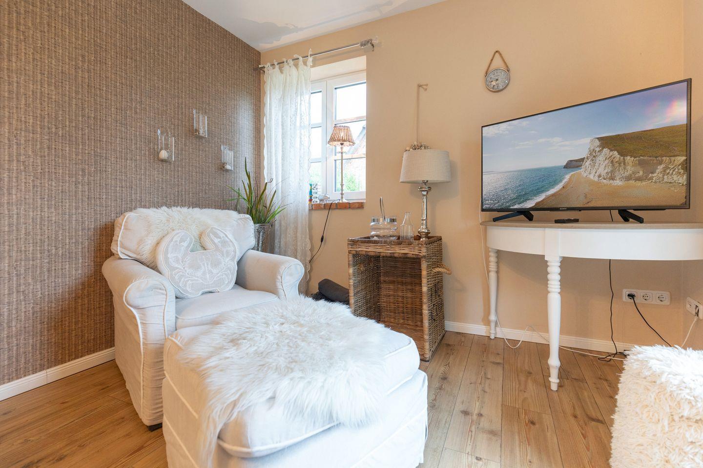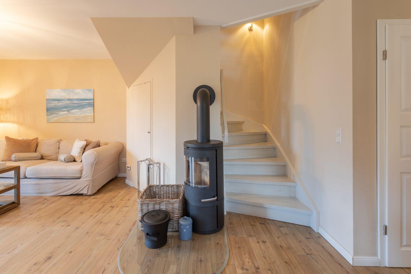 Über den einladend gestalteten Eingangsbereich mit Garderobe gelangen Sie in einen Wohn-Essbereich mit offener Küche. Letztere punktet mit einer überaus vollständigen Ausstattung, die ein gemeinsames Zubereiten von Speisen möglich macht. Der Esstisch mit Plätzen für 4 Personen steht nahe bei und lädt ein zu einem geselligen Miteinander. Im gemütlichen Fernsehbereich finden Sie Entspannung bei einem Film oder wärmen sich in der kühlen Jahreszeit nach einem langen Strandspaziergang am Kaminofen auf. Vom Wohnbereich aus betreten Sie die möblierte Terrasse. Der angrenzende Garten ist umzäunt und mit weiteren Sitzgelegenheiten u.a. einem Strandkorb ausgestattet.