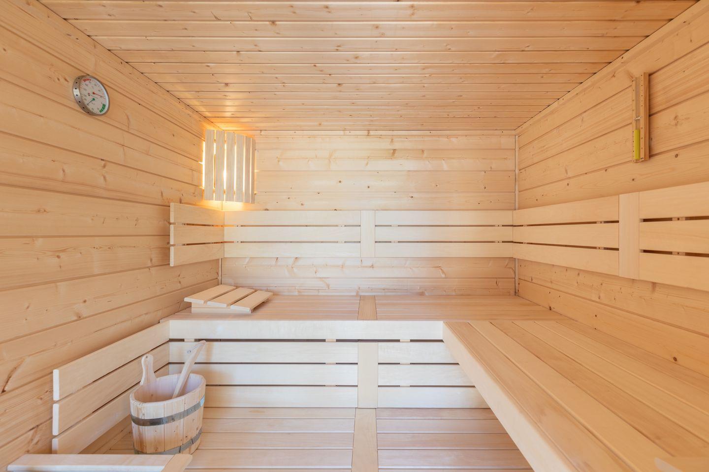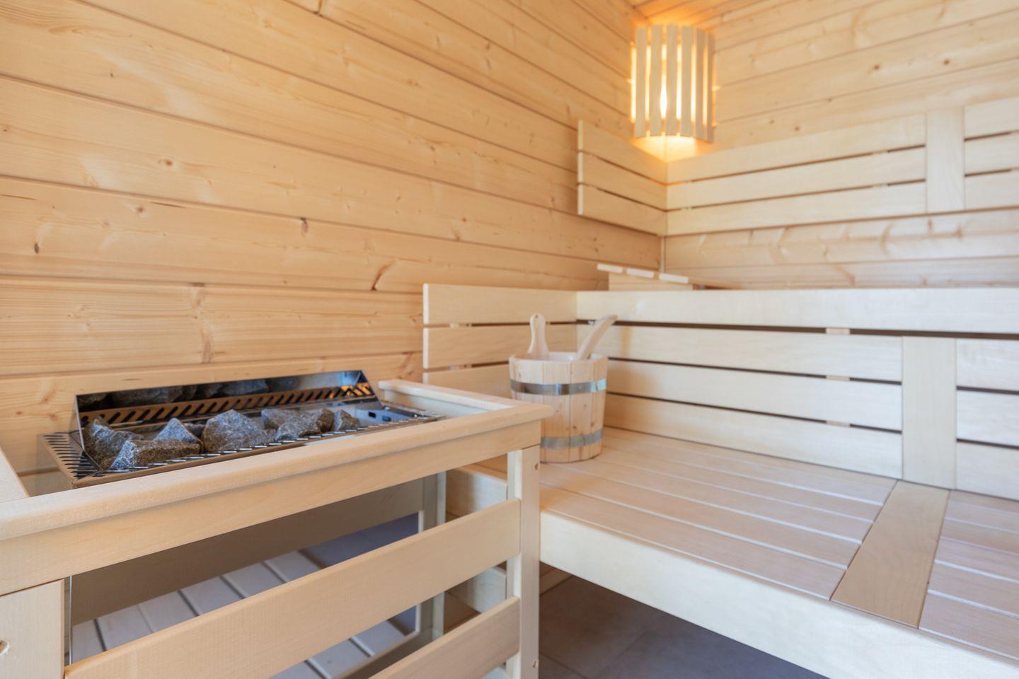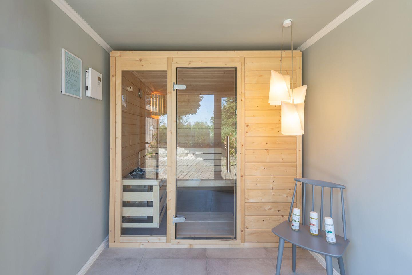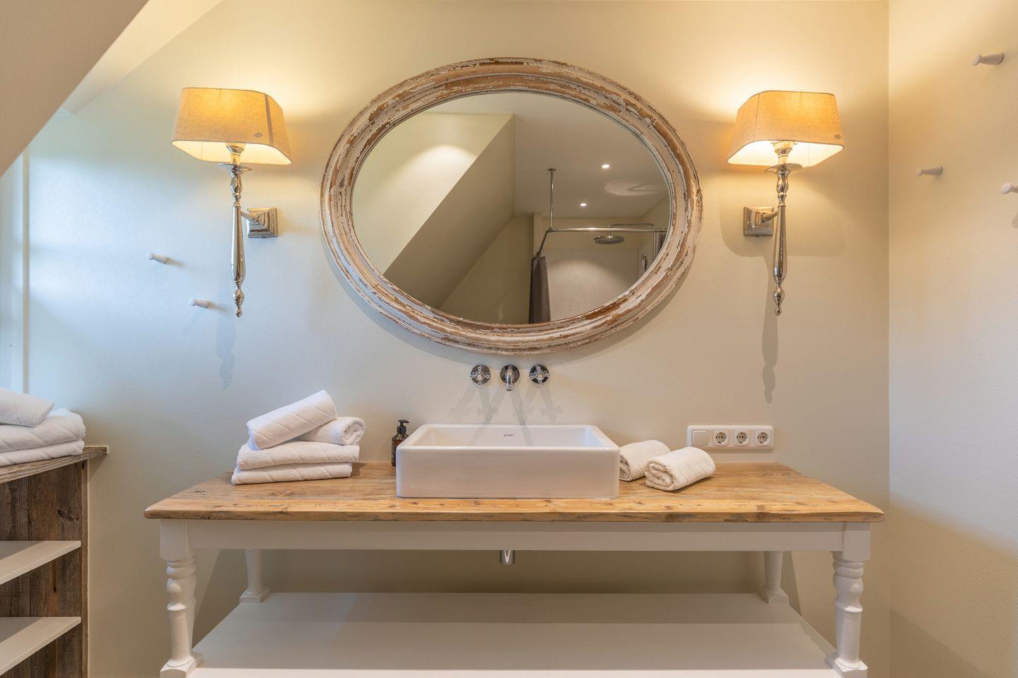 Das große Badezimmer ist sowohl mit einer Badewanne als auch einer ebenerdigen Regendusche ausgestattet. Ein weiteres Bad mit Fenster und ebenerdiger Regendusche sowie Gäste WC befindet sich im Erdgeschoss. Im Hauswirtschaftsraum unter der Treppe stehen zur kostenlosen Nutzung eine Waschmaschine und ein Wäschetrockner bereit. Fahrräder können in einem abschließbaren Schuppen untergebracht werden. In dem Holzhäuschen daneben befindet sich die Sauna. Auf dem Grundstück befinden sich zudem ein Carport sowie ein weiterer PKW Stellplatz.