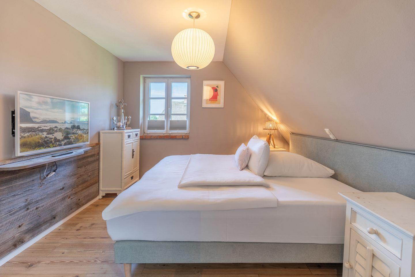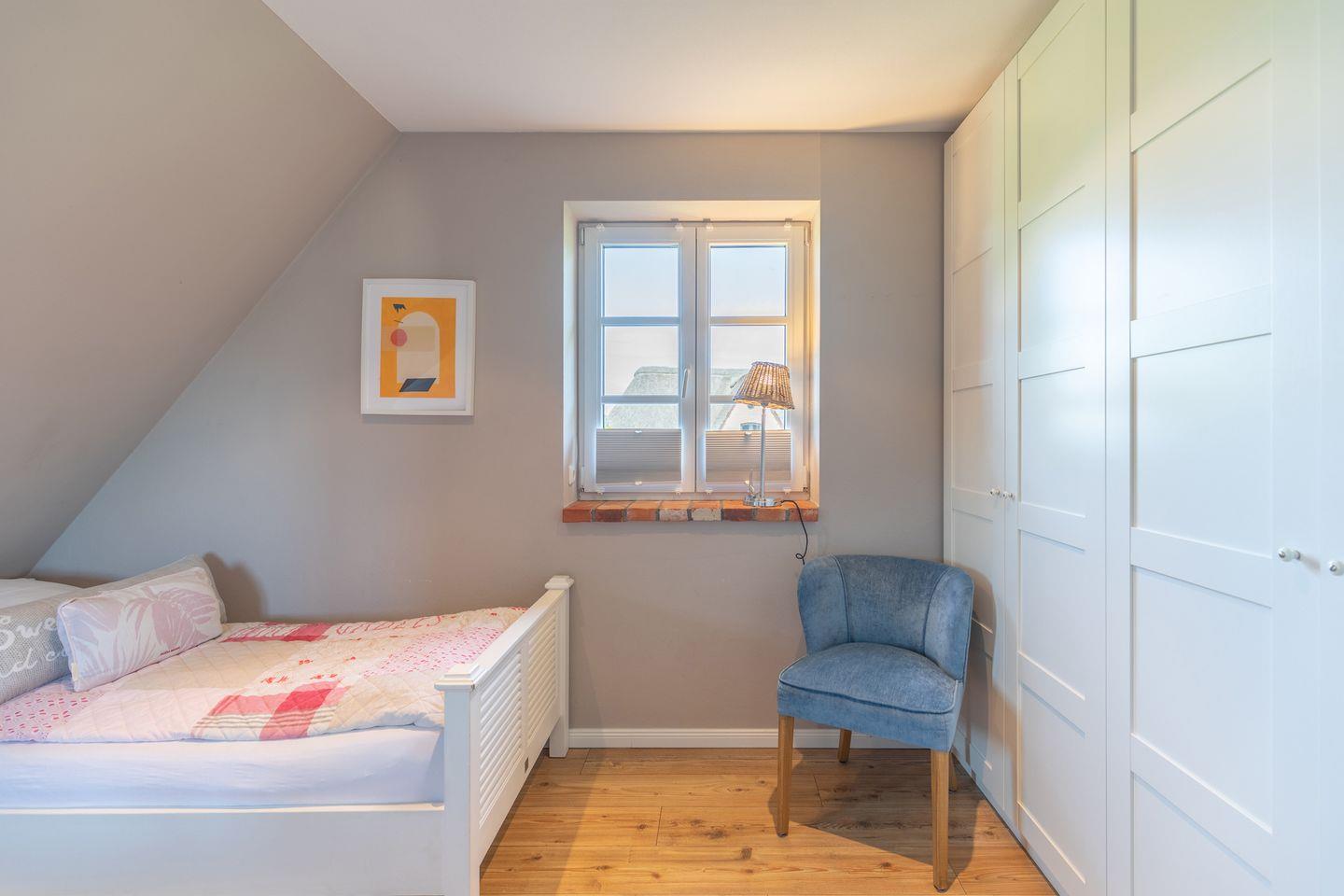 Im ersten Obergeschoss finden Sie ein Schlafzimmer mit Doppelbett (180x200cm, durchgehende Matratze) vor. Zusätzlich gibt es ein weiteres Schlafzimmer mit zwei Einzelbetten (80x190cm). Auf dieser Ebene gelangen Sie auf die Dachterrasse des Hauses, von der aus sich neben romantischen Sonnenuntergängen auch das heimische Wild beobachten lässt. Im zweiten Obergeschoss liegt bei ausreichender Höhe gemütlich im Spitzboden mit Rundbogenfenster das dritte Schlafzimmer mit Doppelbett (160x200cm, durchgehende Matratze).
