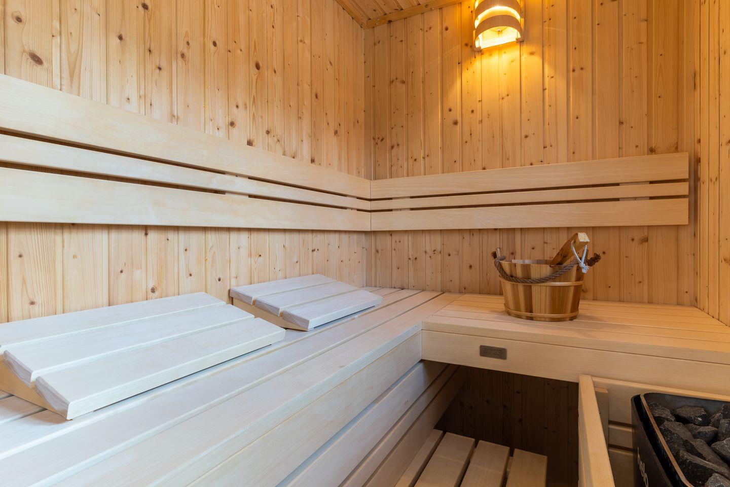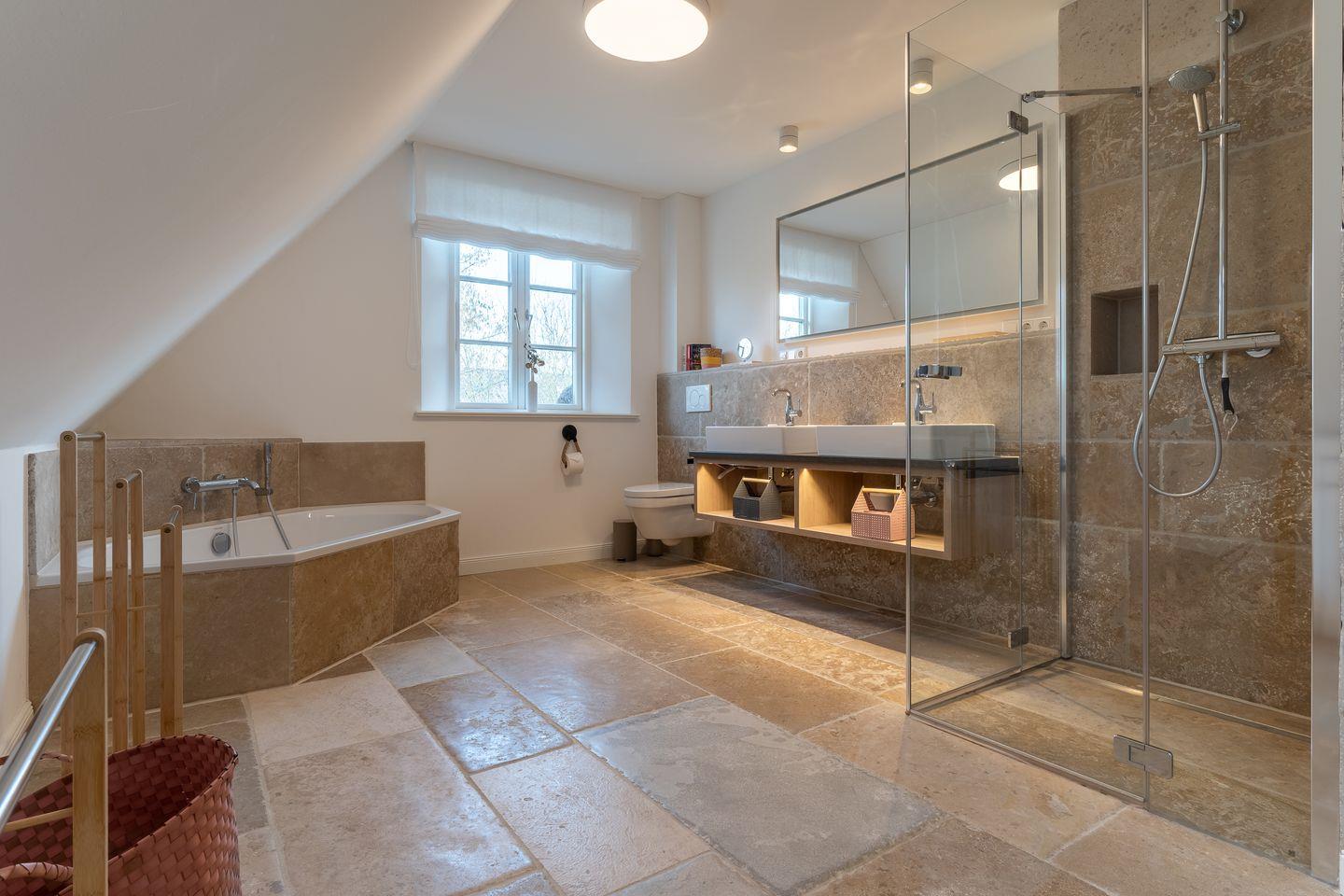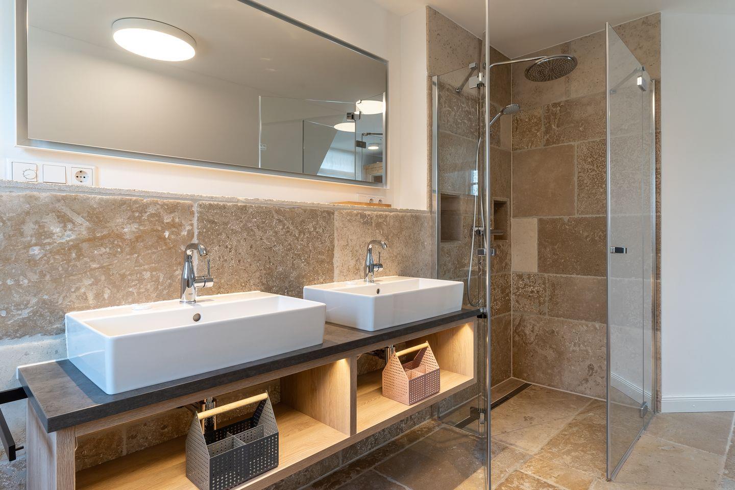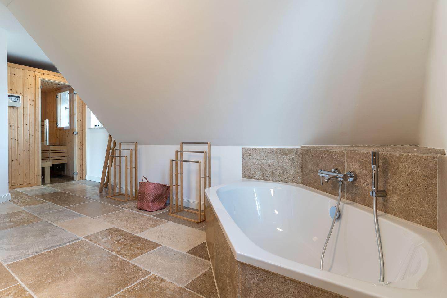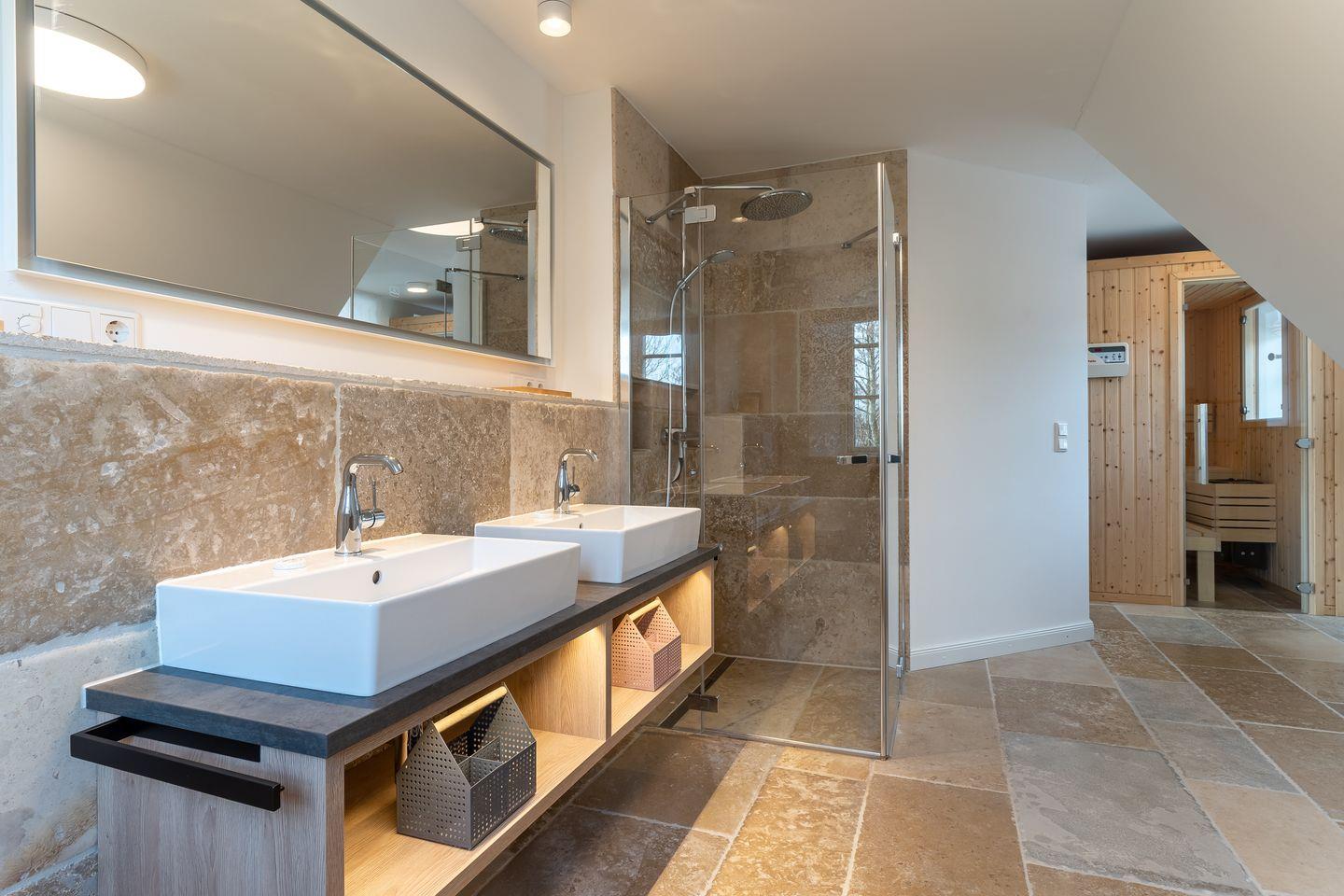 Zudem stehen Ihnen gleich zwei Bäder zur Verfügung. Ein Vollbad im Obergeschoss mit ebenerdiger Regendusche und Innensauna sowie ein weiteres Bad mit ebenerdiger Dusche im Erdgeschoss.