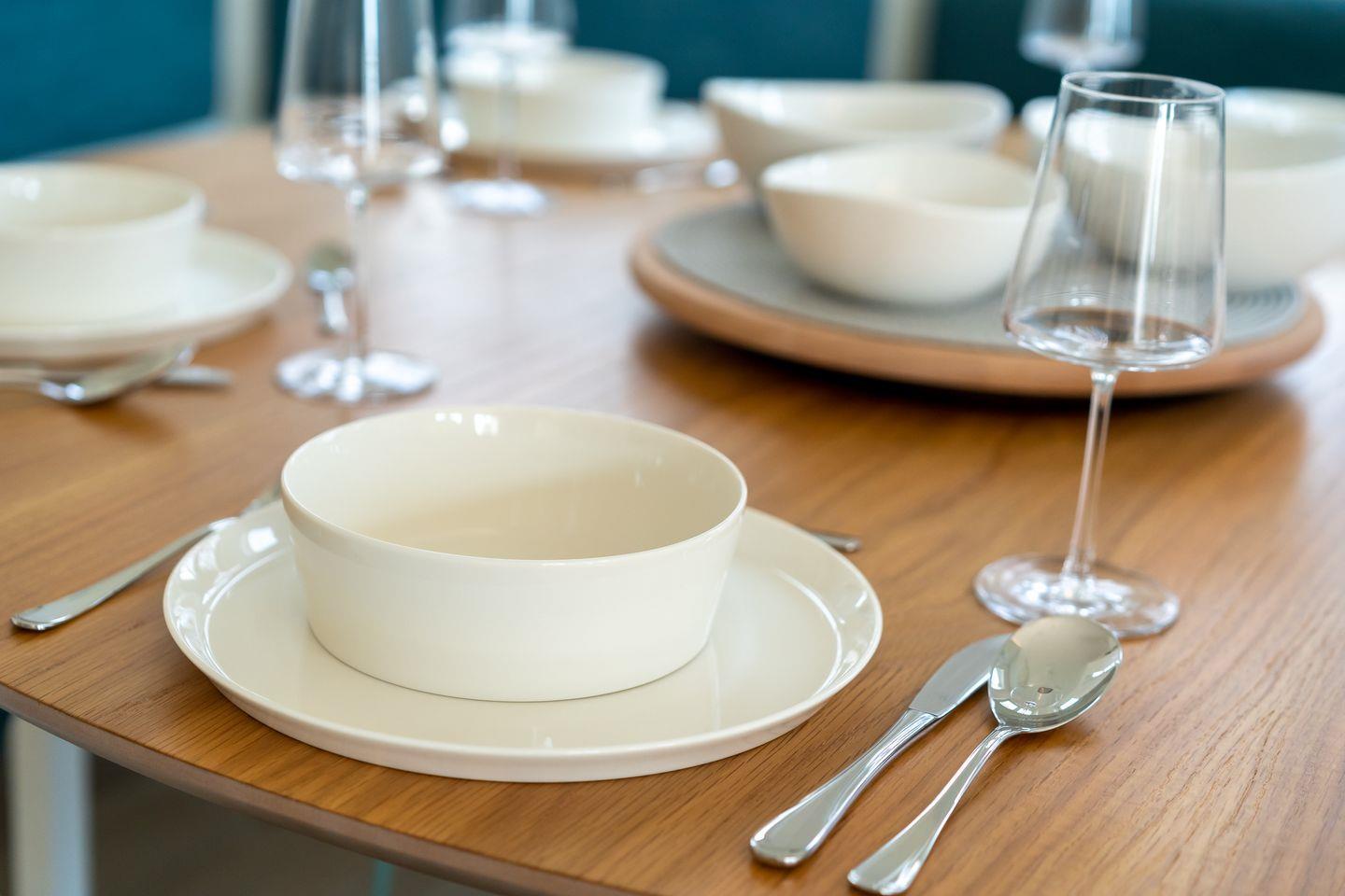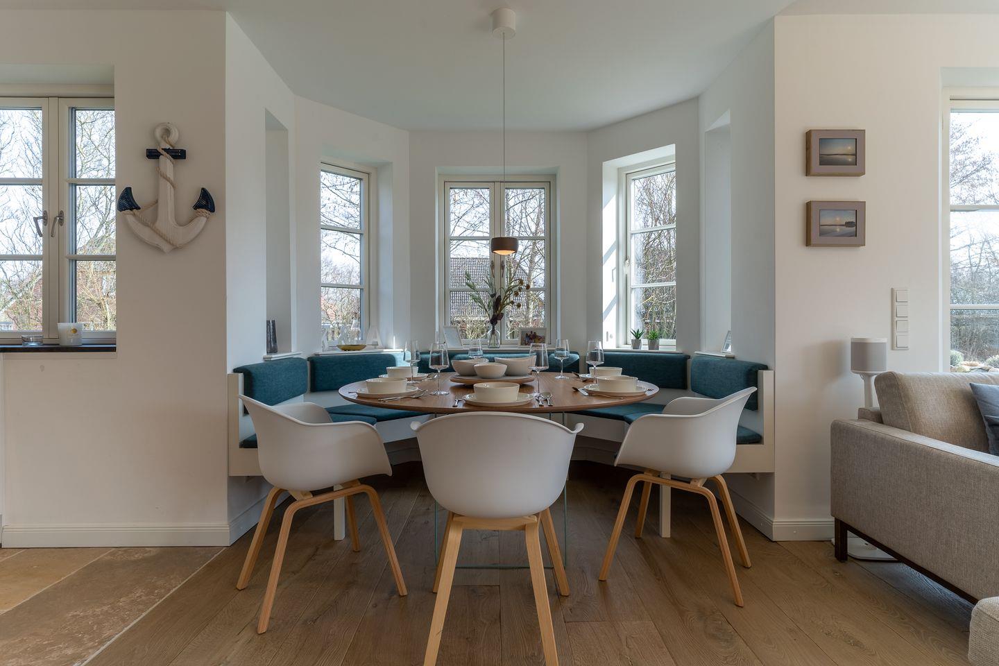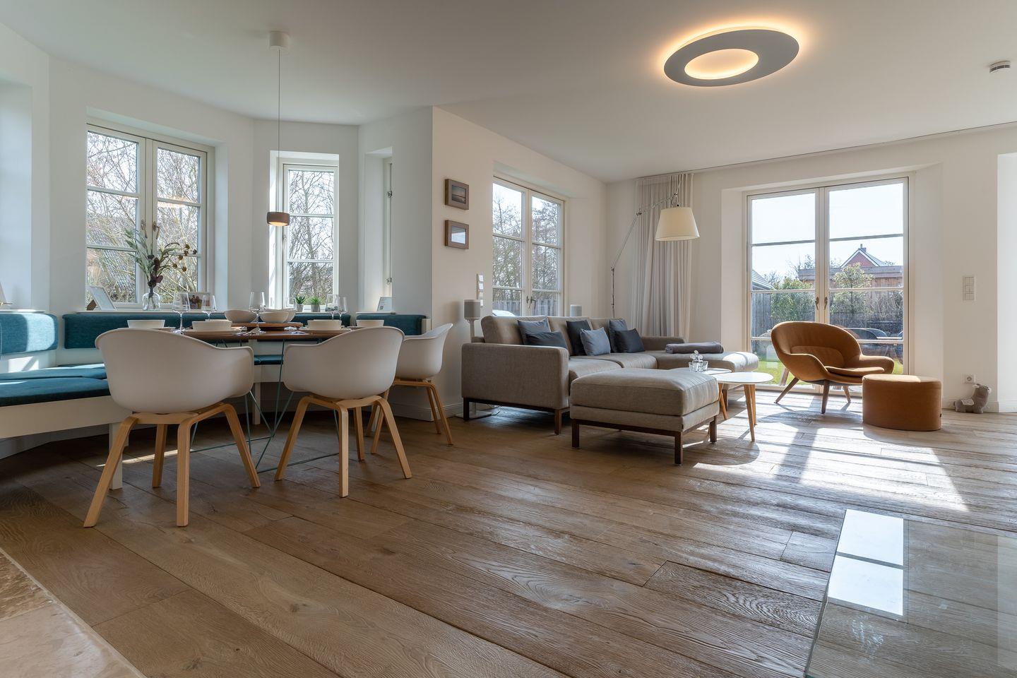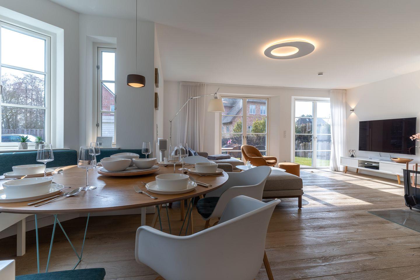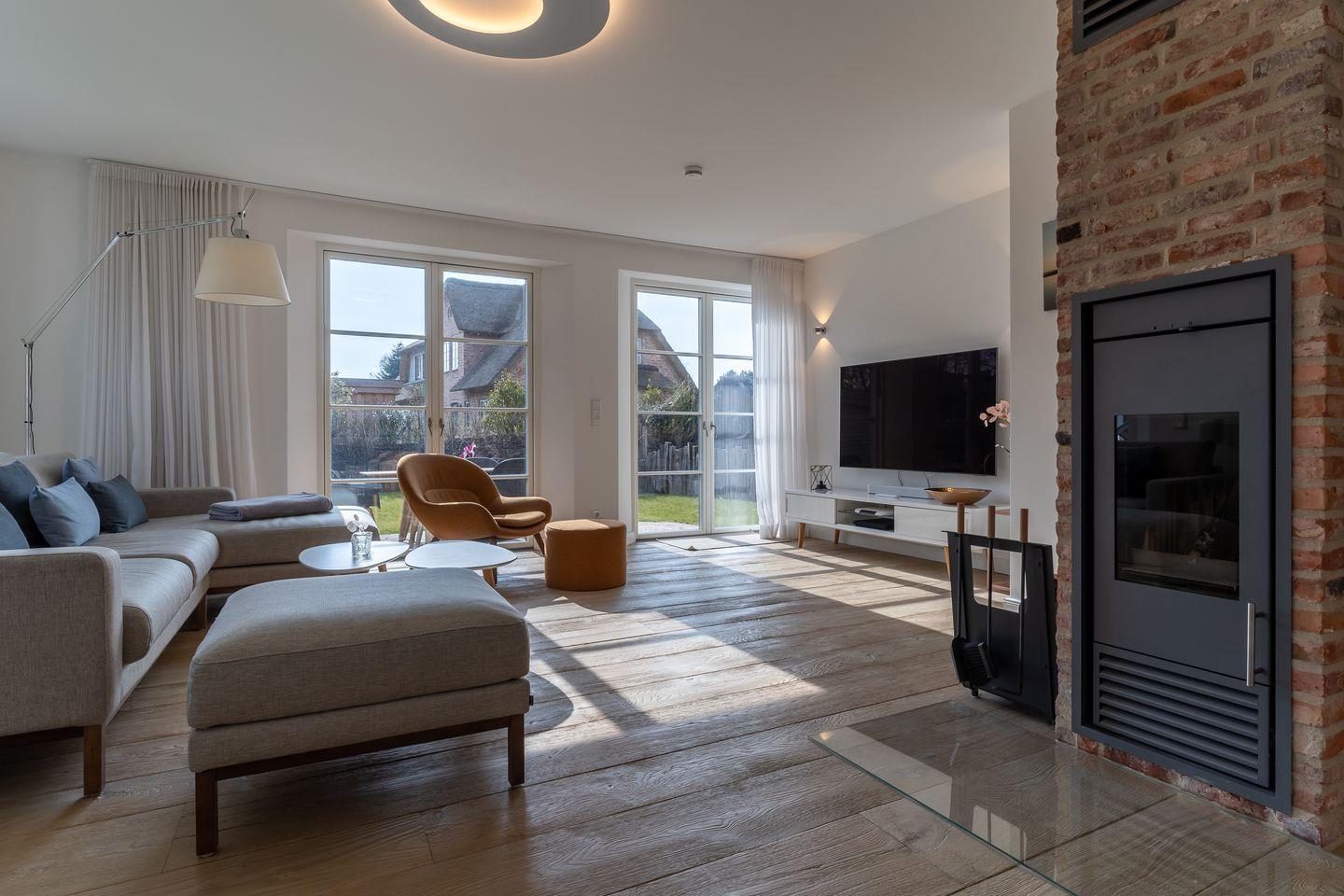 Im Erdgeschoss befindet sich der lichtdurchflutete Wohnraum mit TV, Kamin, einer offenen Küche sowie einem stilvollen Essbereich. Die Küche verfügt über hochwertige Elektrogeräte.
