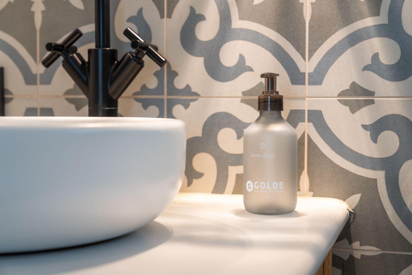Das geräumige Badezimmer der Wohnung beeindruckt mit einer bodengleichen Regendusche. Auf der möblierten Terrasse mit einem Strandkorb können Sie den Tag stilvoll ausklingen lassen.