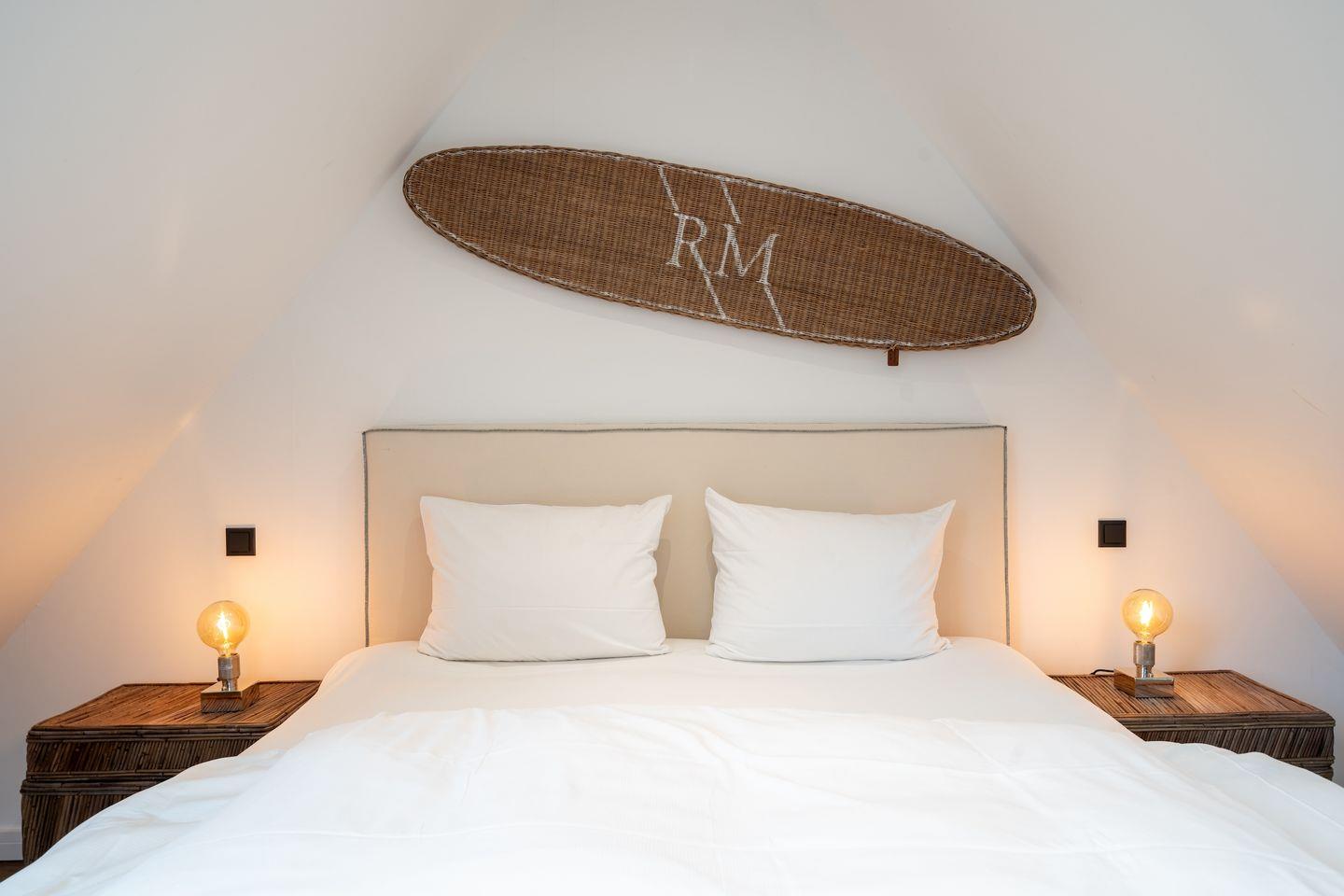 Über eine charmante Holztreppe gelangen Sie in das gemütliche Schlafzimmer mit einem Kingsize-Bett (180x200) und schrägen Dachfenstern, die eine behagliche Atmosphäre schaffen.