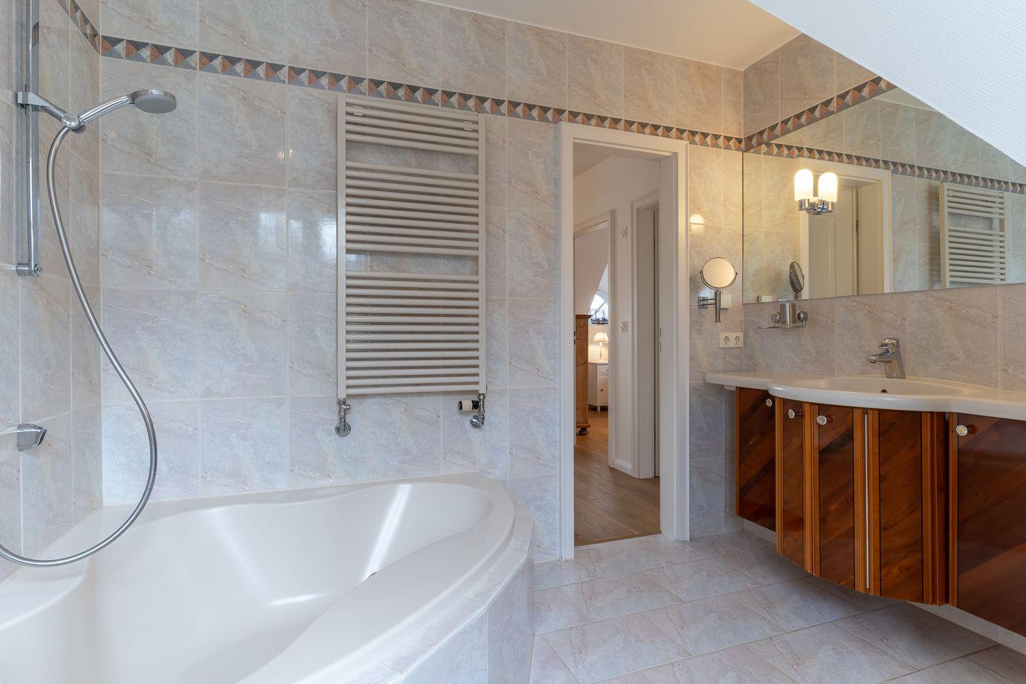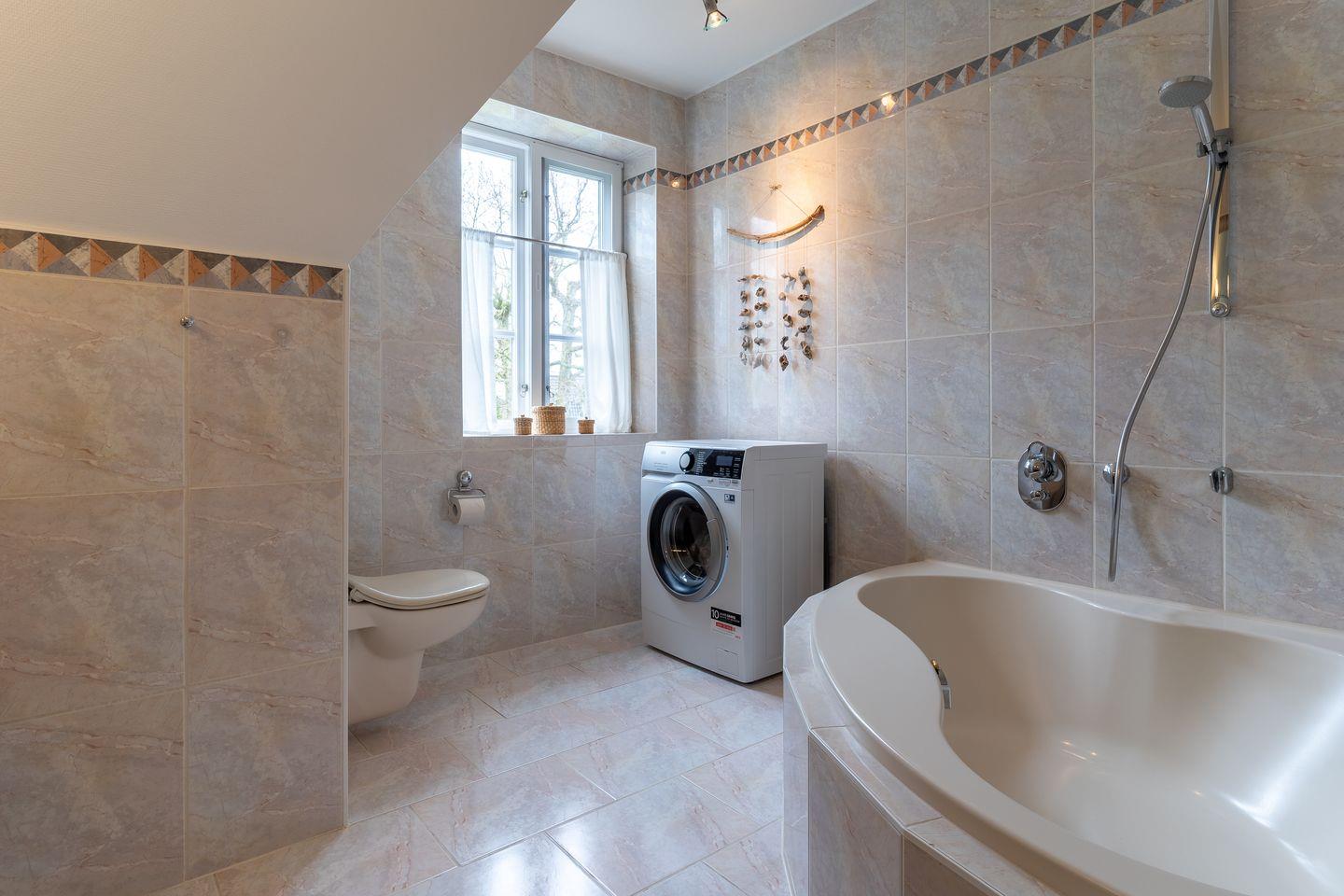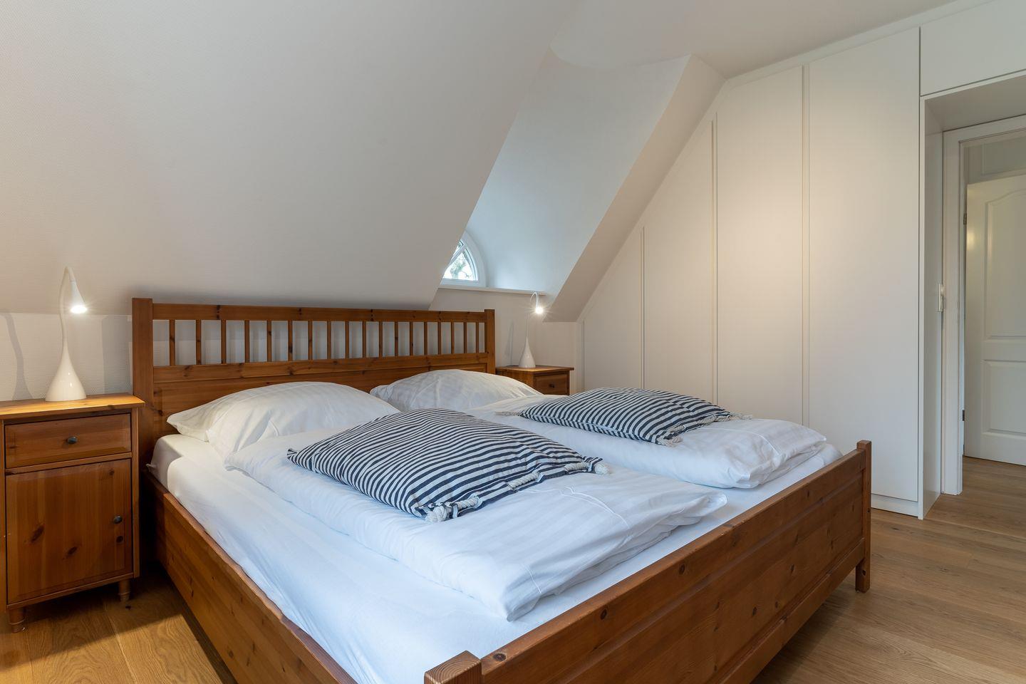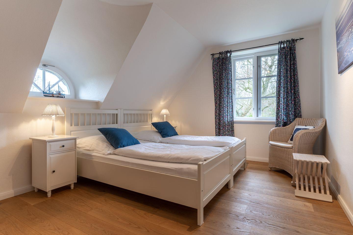 Obergeschoss: zwei gemütliche Schlafzimmer (1 x Doppelbett 180 x 200 cm, 2x Einzelbetten 90 x 200 cm), geräumiges Badezimmer mit Eckbadewanne und Handtuchtrockner.