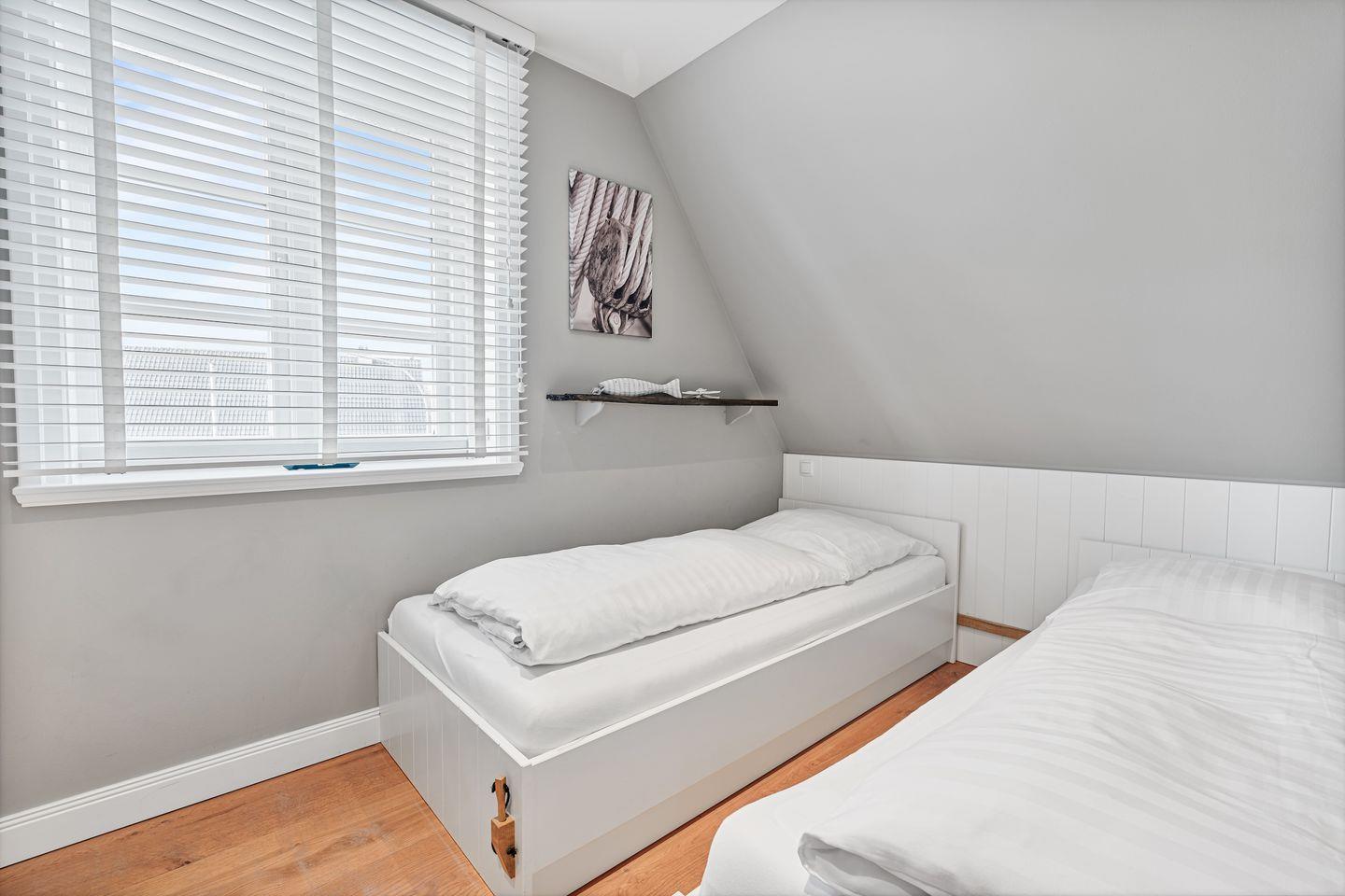 Über eine Holztreppe gelangt man in das mit Parkett ausgelegte Obergeschoss. Dieses verfügt ebenfalls über eine Fußbodenheizung. Ebenfalls drei Schlafzimmer, Schlafzimmer I mit einem Doppelbett 1,80 x 2,00 m, Schlafzimmer II mit 2 Einzelbetten und Schlafzimmer 3 mit 2 Einzelbetten die zu einem Doppelbett zusammengeschoben werden können, jeweils mit TV ausgestattet. Einbauschränke gewähren Ihnen hinreichend Ablageflächen. Darüber hinaus befindet sich im Obergeschoss ein weiteres Bad mit Dusche. Vom Obergeschoss führt die Holztreppe hinauf in das Dachgeschoss. Hier befindet sich eine sehr große Sauna mit Entspannungsbereich. Dieses wunderschöne Haus lässt keine Wünsche offen und bringt Sie sofort in Urlaubsstimmung.