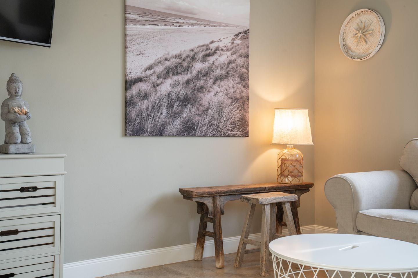 Die luxuriöse Haushälfte unter Reet verfügt über ca. 105 m² Wohnfläche und bietet Platz für 6 Personen. Im Erdgeschoss befindet sich der lichtdurchflutete Wohnraum mit TV, Kamin, einer offenen Küche sowie einem stilvollen Essbereich. Die Wohnräume sind mit wunderschönen Möbeln ausgestattet. Die Küche verfügt über hochwertige Elektrogeräte. An den Wohnbereich schließen sich ein Flur mit ein Hauswirtschaftsraum und ein Duschbad an. Das gesamte Erdgeschoss verfügt über geschmackvolle Natursteinfliesen, die über eine Fußbodenheizung beheizt werden können.
