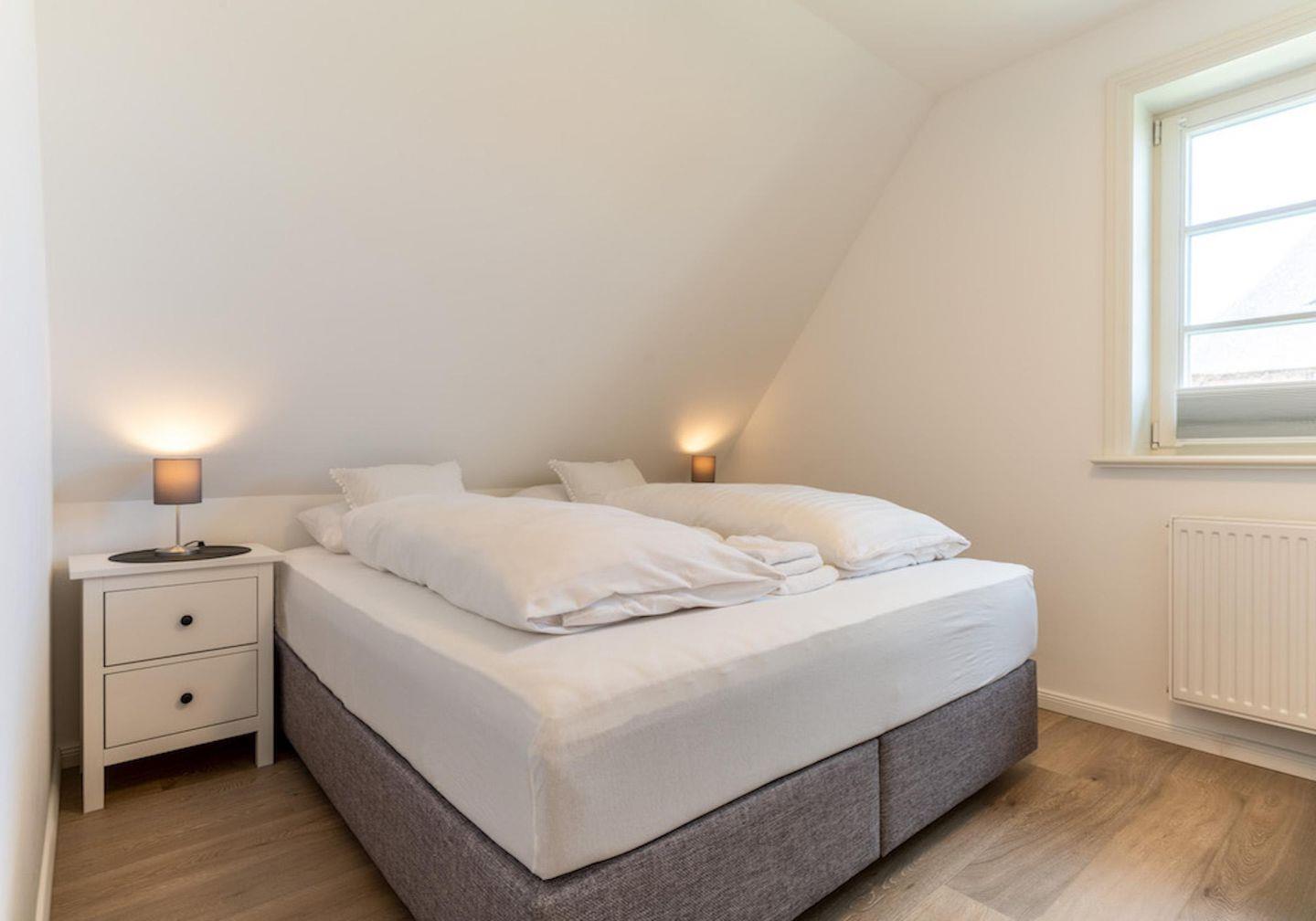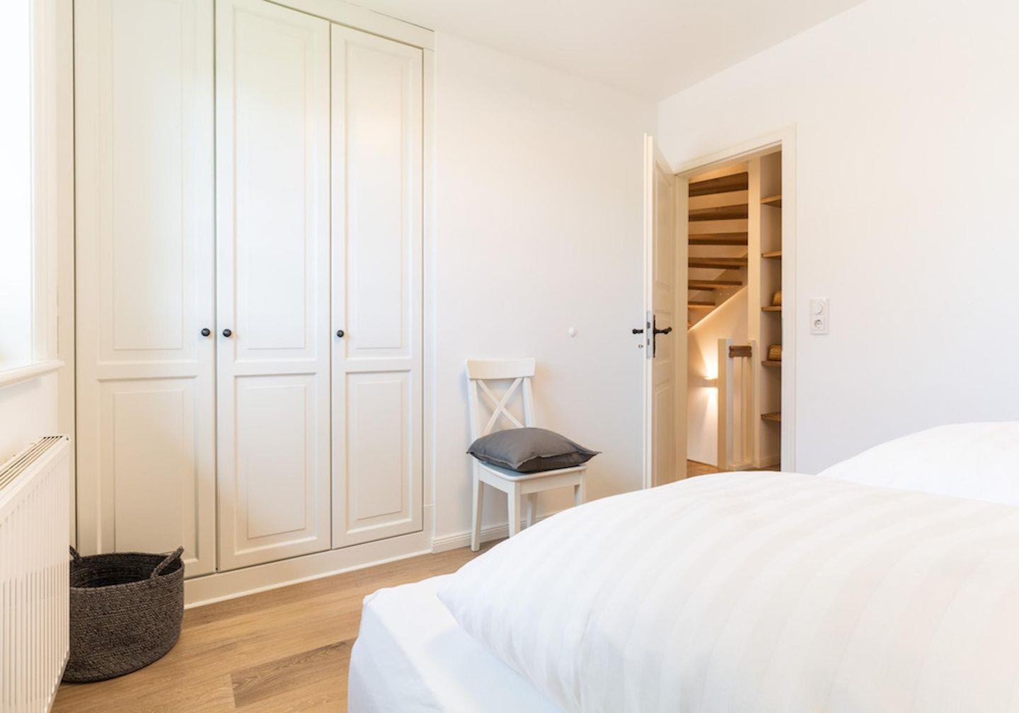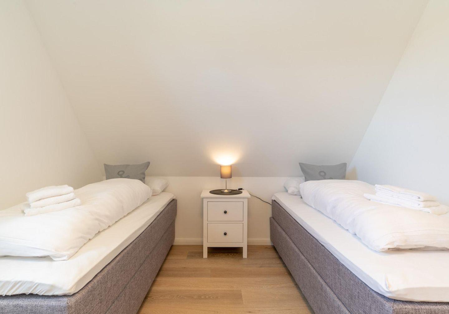 Über eine Holztreppe gelangt man in das ebenso mit Parkett ausgelegte Obergeschoss. Die beiden Schlafzimmer, eines mit einem Doppelboxspringbett und ein weiteres mit 2 Einzelboxspringbetten sorgen für ruhevolle Erholung.