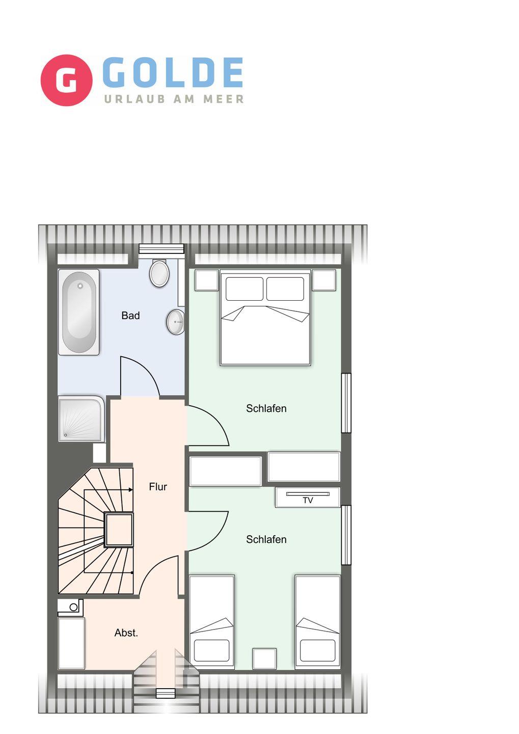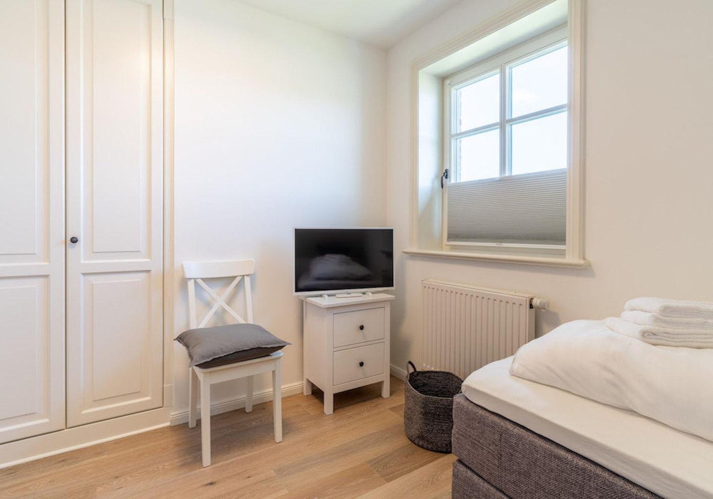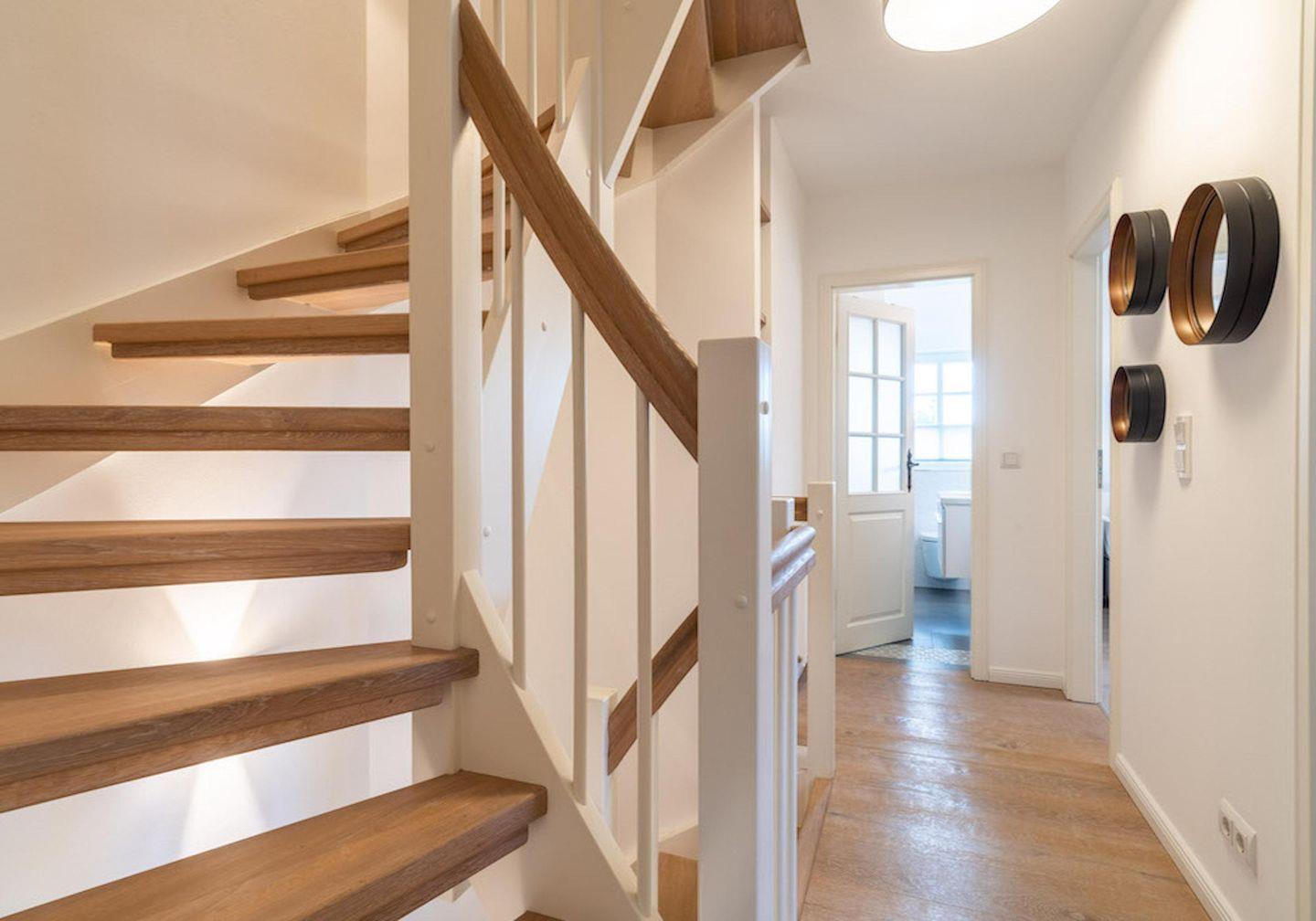 Über eine Holztreppe gelangt man in das ebenso mit Parkett ausgelegte Obergeschoss. Die beiden Schlafzimmer, eines mit einem Doppelboxspringbett und ein weiteres mit 2 Einzelboxspringbetten sorgen für ruhevolle Erholung.