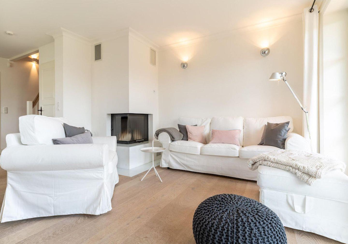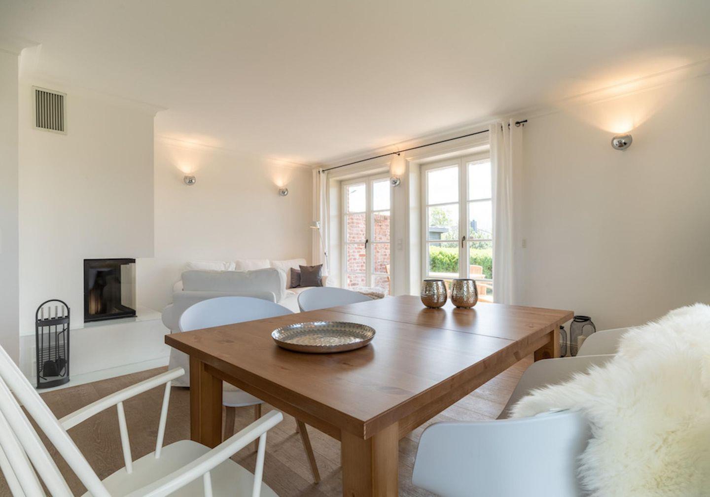 Im Erdgeschoss befindet sich der lichtdurchflutete Wohnraum mit TV, einer offenen Küche sowie einem stilvollen Essbereich. Der Wohnraum ist mit stylischen Möbeln, Kamin und hochwertigem Parkett ausgestattet.