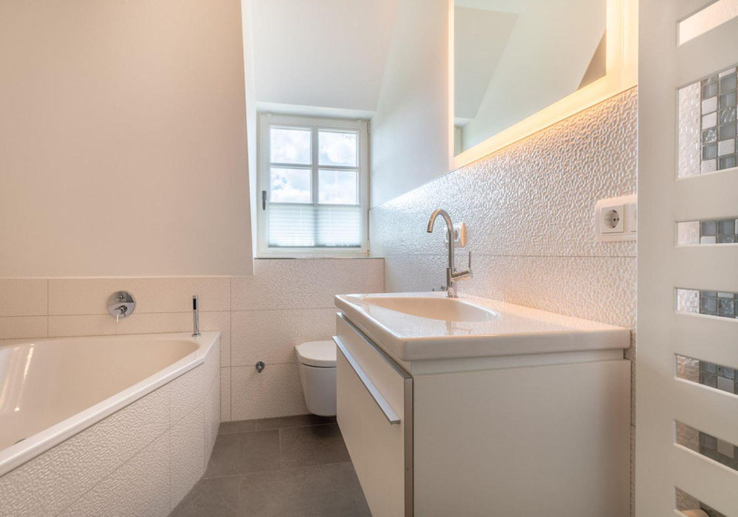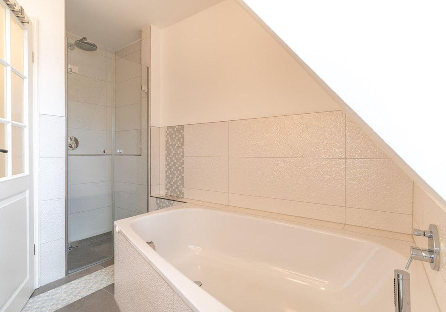 Einbauschränke gewähren Ihnen hinreichend Ablageflächen. Darüber hinaus befindet sich im Obergeschoss ein weiteres, geräumiges Bad mit Dusche und großer Eckbadewanne.