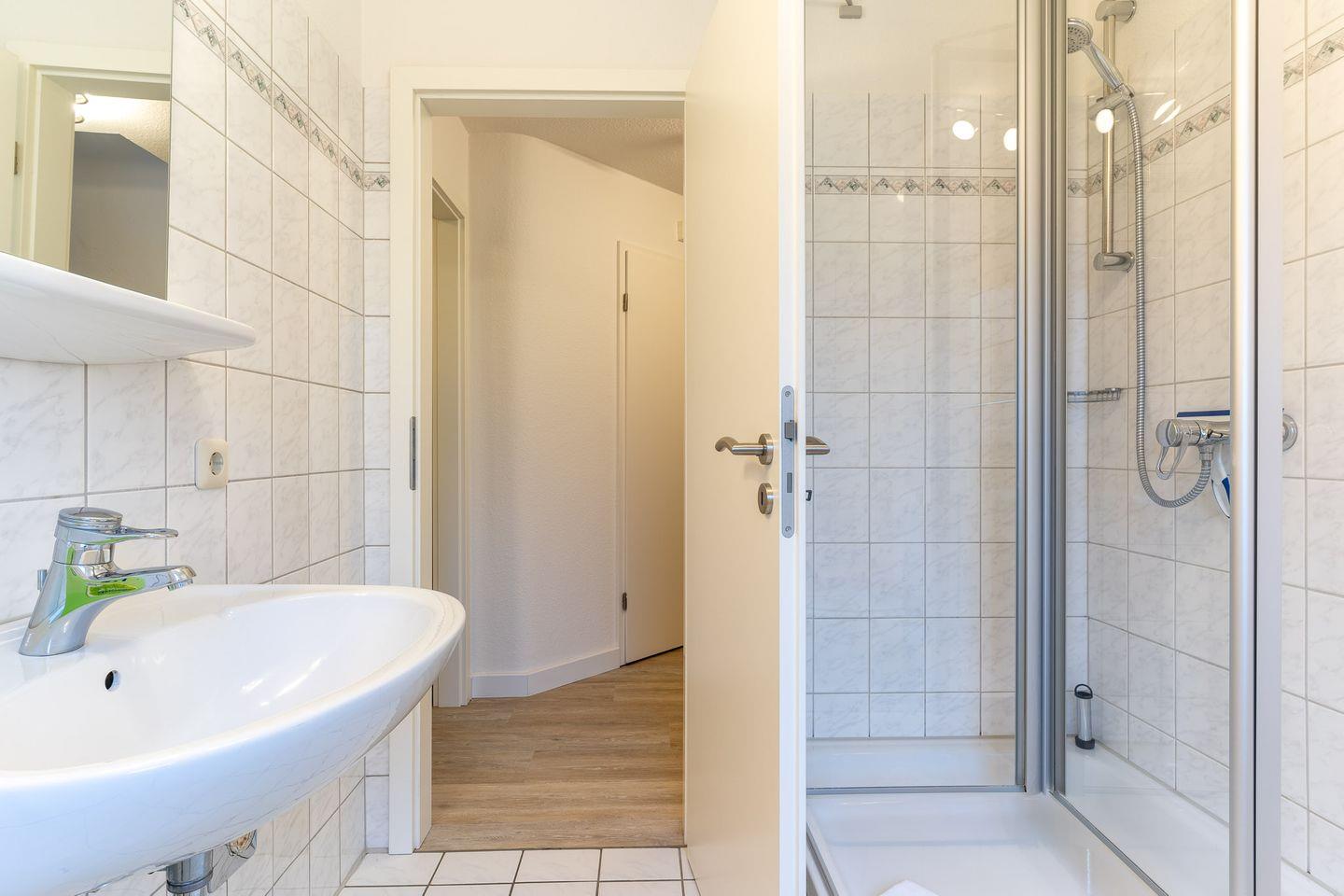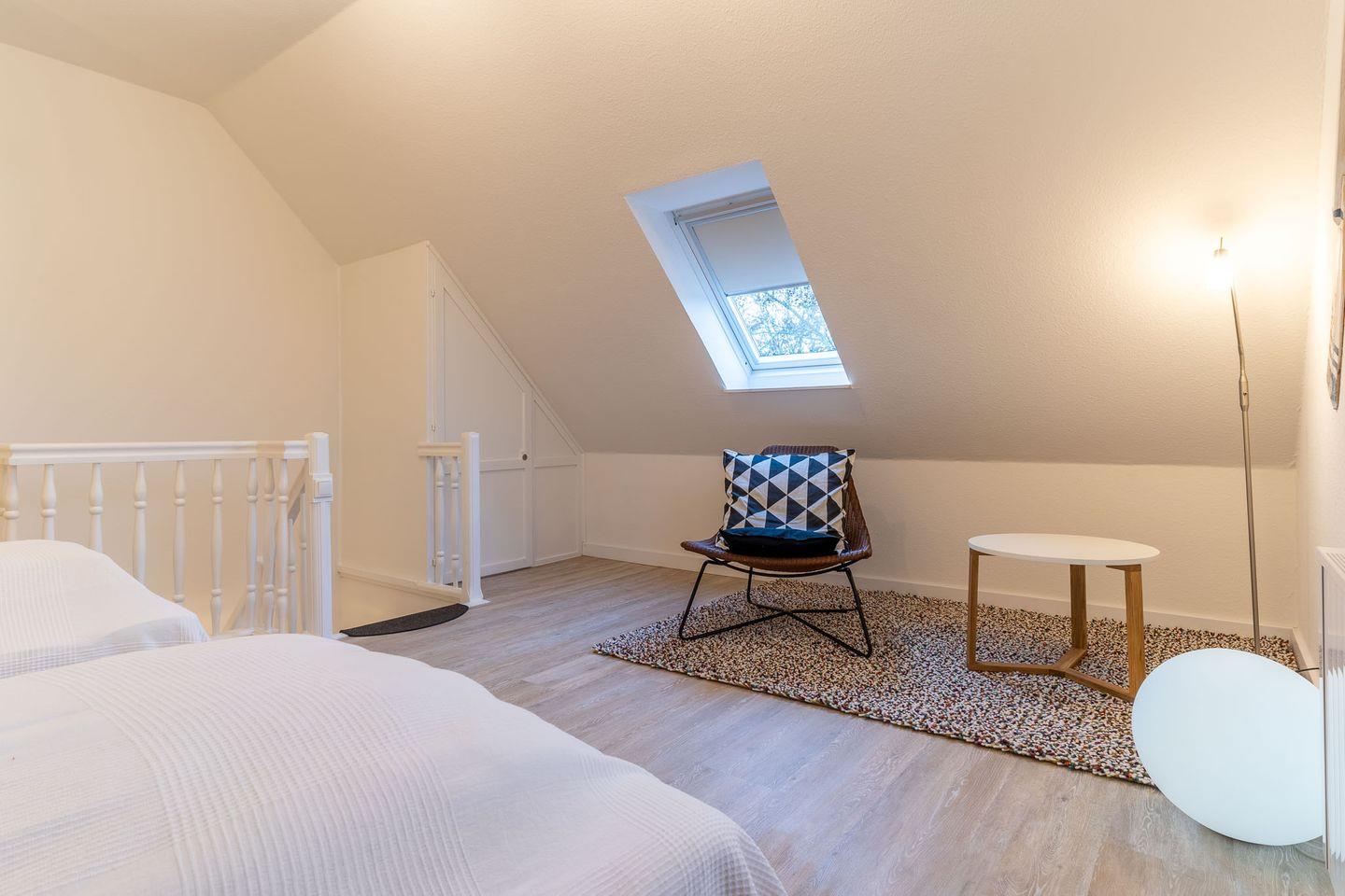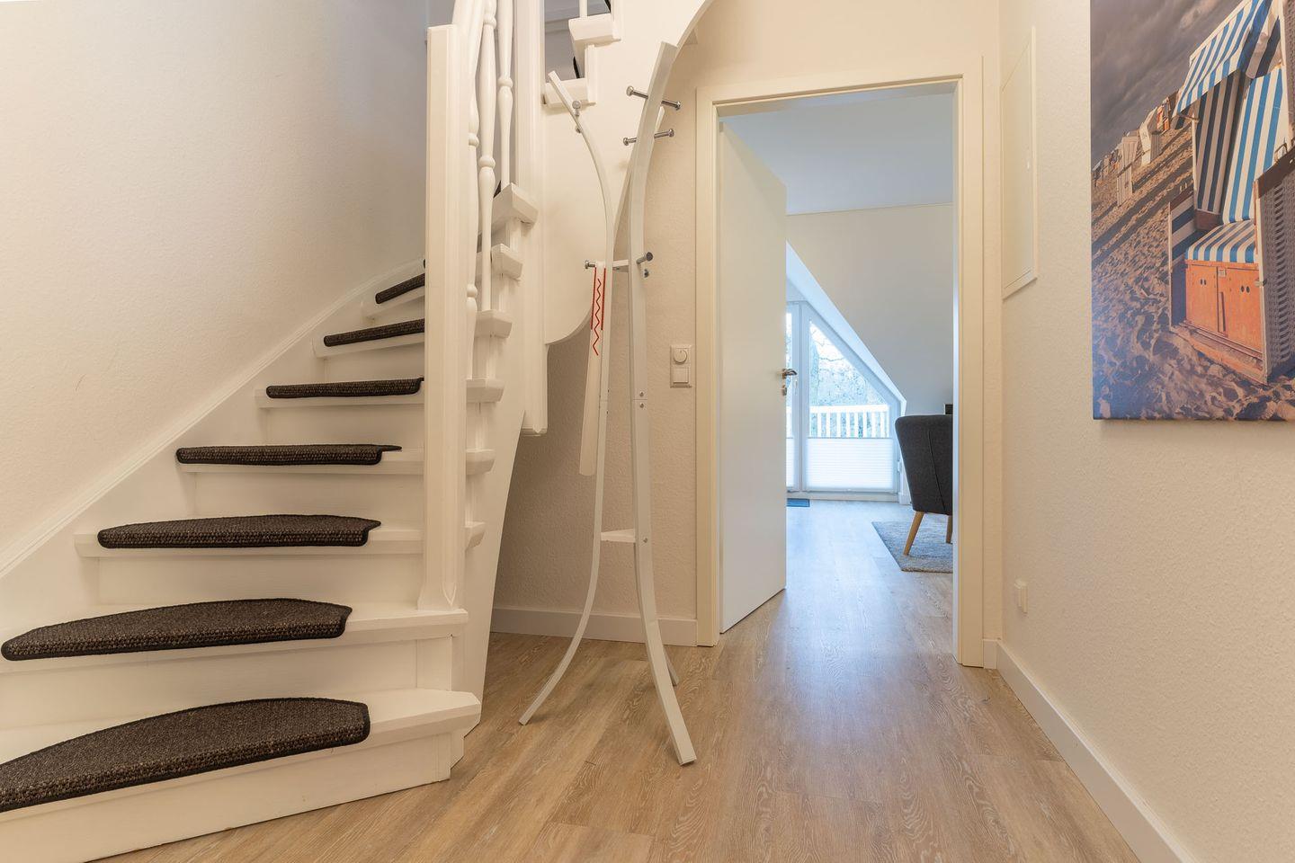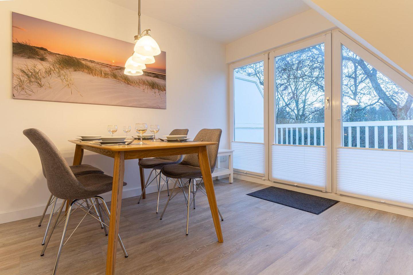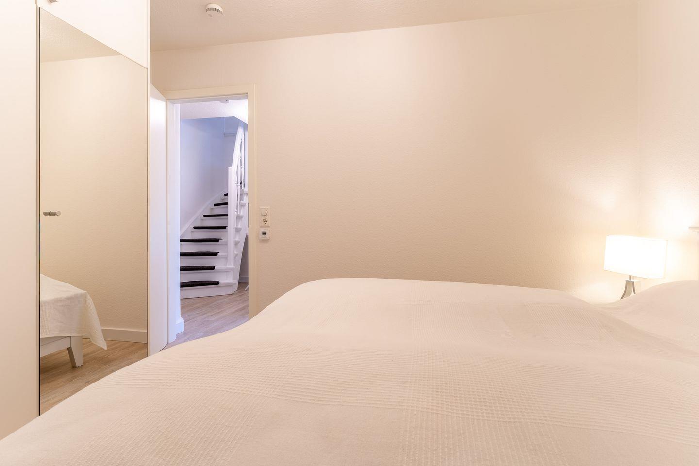 In der geräumigen Wohnküche können Sie sich selbst versorgen und haben dabei den neuesten technischen Standard zur Verfügung, inklusive Backofen, Mikrowelle und Kühl-/Gefrierkombi. Von hier aus gelangen Sie auch auf den Balkon, wo Sie die frische Nordseeluft genießen und die Seele baumeln lassen können. Das untere Schlafzimmer verfügt über ein bequemes Doppelbett und ausreichend Stauraum in den Einbauschränken. Über eine Treppe vom Flur aus gelangen Sie in das obere Schlafzimmer, das durch seine lichtdurchflutete und großzügige Bauweise besticht. Hier stehen Ihnen zwei Einzelbetten, eine Sitzecke und weitere Einbauschränke zur Verfügung.