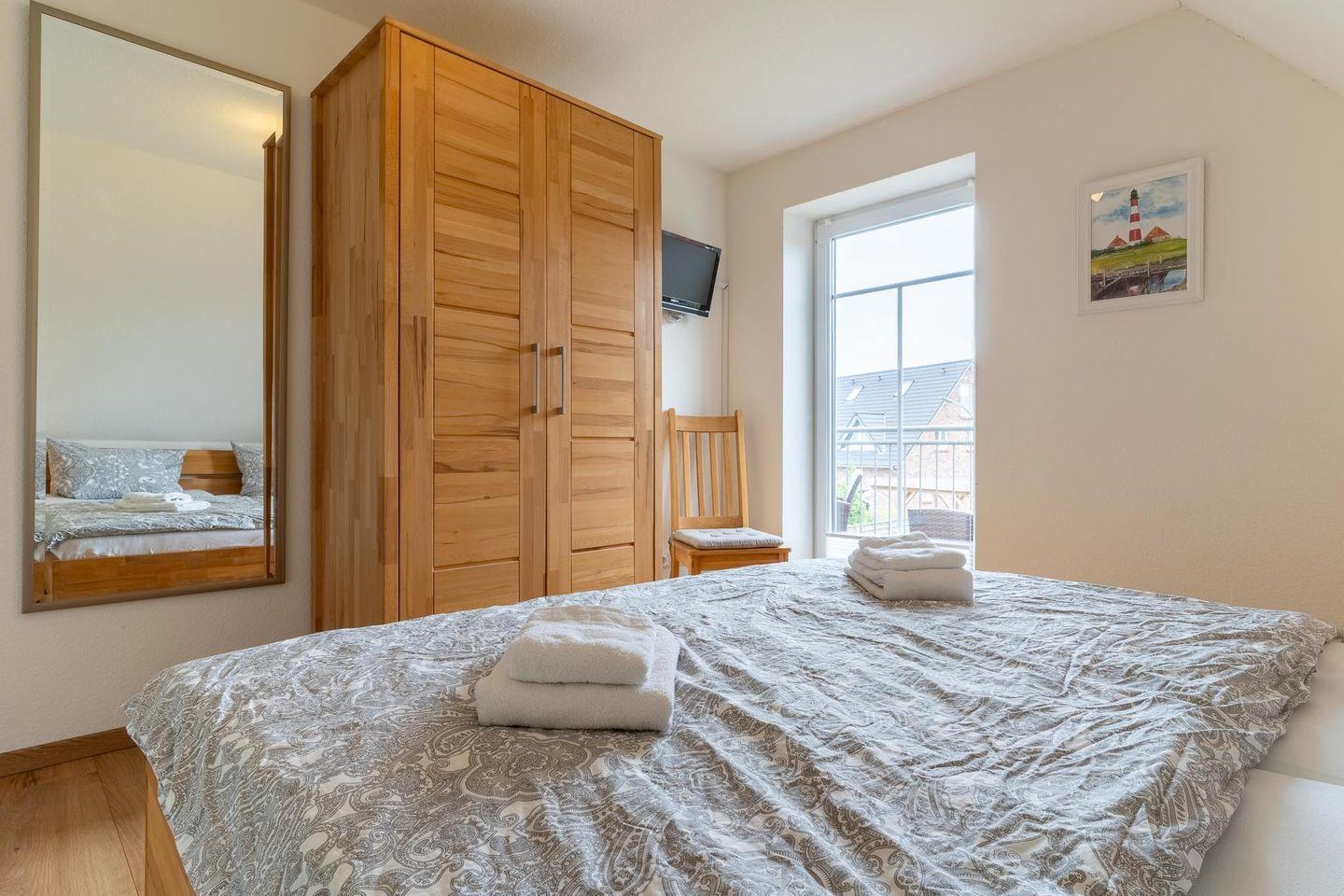 Willkommen in der geräumigen und liebevoll eingerichteten 3-Zimmer-Wohnung "Flut", die im 1. Obergeschoss im Ortsteil Bad liegt und bis zu 4 Personen Platz bietet. Die Wohnung verfügt über zwei Schlafzimmer - das erste mit zwei gemütlichen Einzelbetten und das zweite mit einem komfortablen Doppelbett. Im Schlafzimmer mit dem Doppelbett steht Ihnen auch ein Fernseher zur Verfügung, so dass Sie sich abends gemütlich ins Bett kuscheln und entspannt fernsehen können.