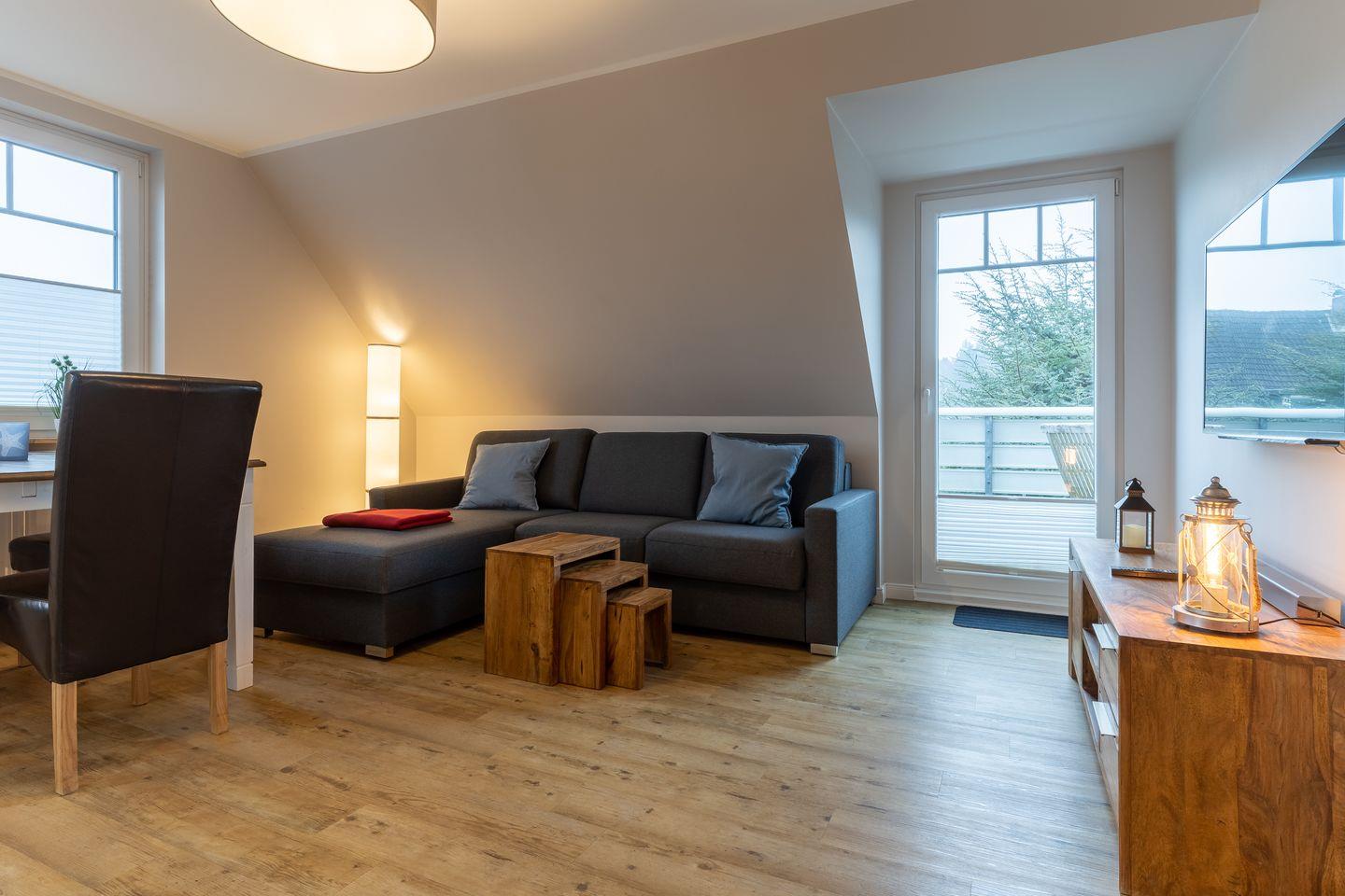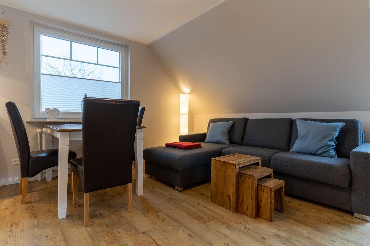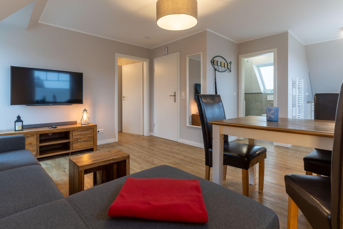 Das App. "Dorf" im Ferienhaus Rückenwind verfügt über ca. 45 m² Wohnfläche und bietet Platz für 1-3 Personen. Die Wohnung befindet sich im Obergeschoss mit einem großzügige Wohnraum mit TV und einer modernen Wohnküche. Die Wohnräume sind mit neuen und modernen Möbeln ausgestattet. An den Wohnbereich schließen sich ein Duschbad, sowie ein Schlafzimmer mit einem Doppelbett (1,80 x 2,00 m) an. Zusätzlich gibt es im Wohnzimmer ein gemütliches Schlafsofa (1,40 x 2,00 m) für eine Personen. Vom Wohnzimmer gelangen Sie auf einen gemütlichen Balkon.