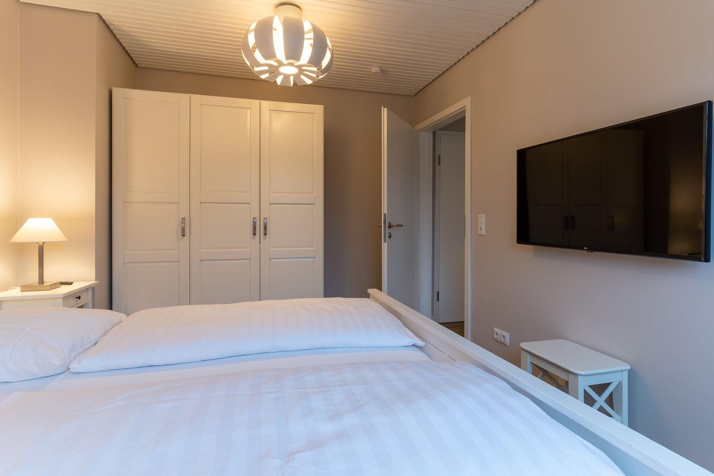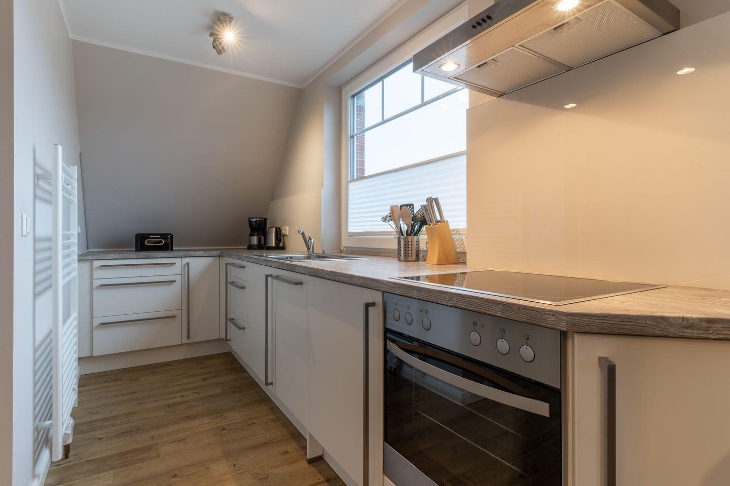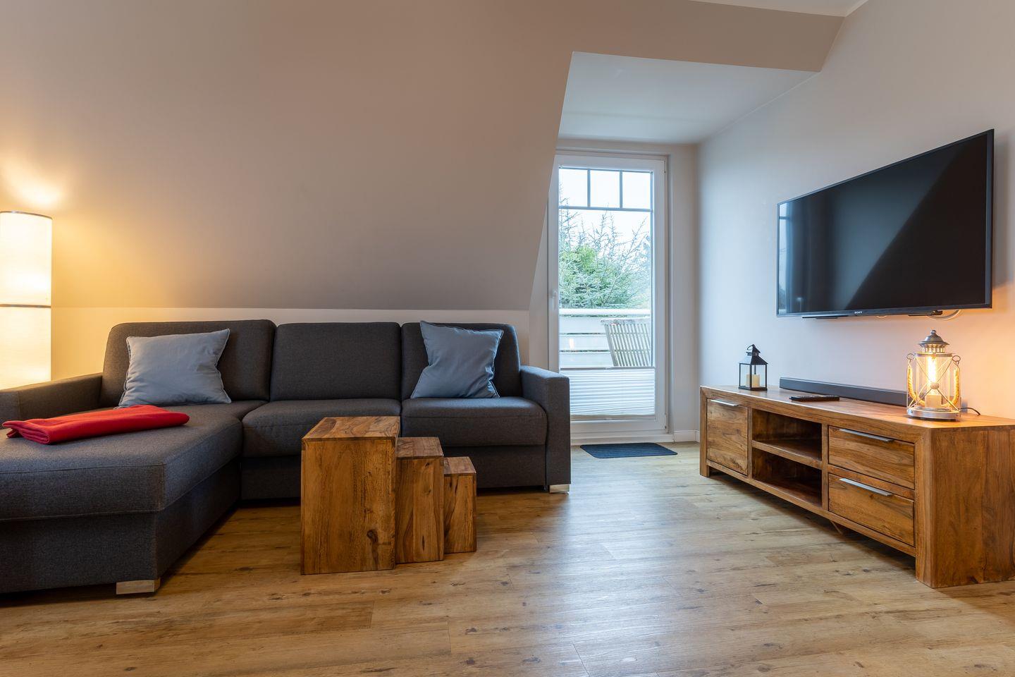 Das App. "Dorf" im Ferienhaus Rückenwind verfügt über ca. 45 m² Wohnfläche und bietet Platz für 1-3 Personen. Die Wohnung befindet sich im Obergeschoss mit einem großzügige Wohnraum mit TV und einer modernen Wohnküche. Die Wohnräume sind mit neuen und modernen Möbeln ausgestattet. An den Wohnbereich schließen sich ein Duschbad, sowie ein Schlafzimmer mit einem Doppelbett (1,80 x 2,00 m) an. Zusätzlich gibt es im Wohnzimmer ein gemütliches Schlafsofa (1,40 x 2,00 m) für eine Personen. Vom Wohnzimmer gelangen Sie auf einen gemütlichen Balkon.