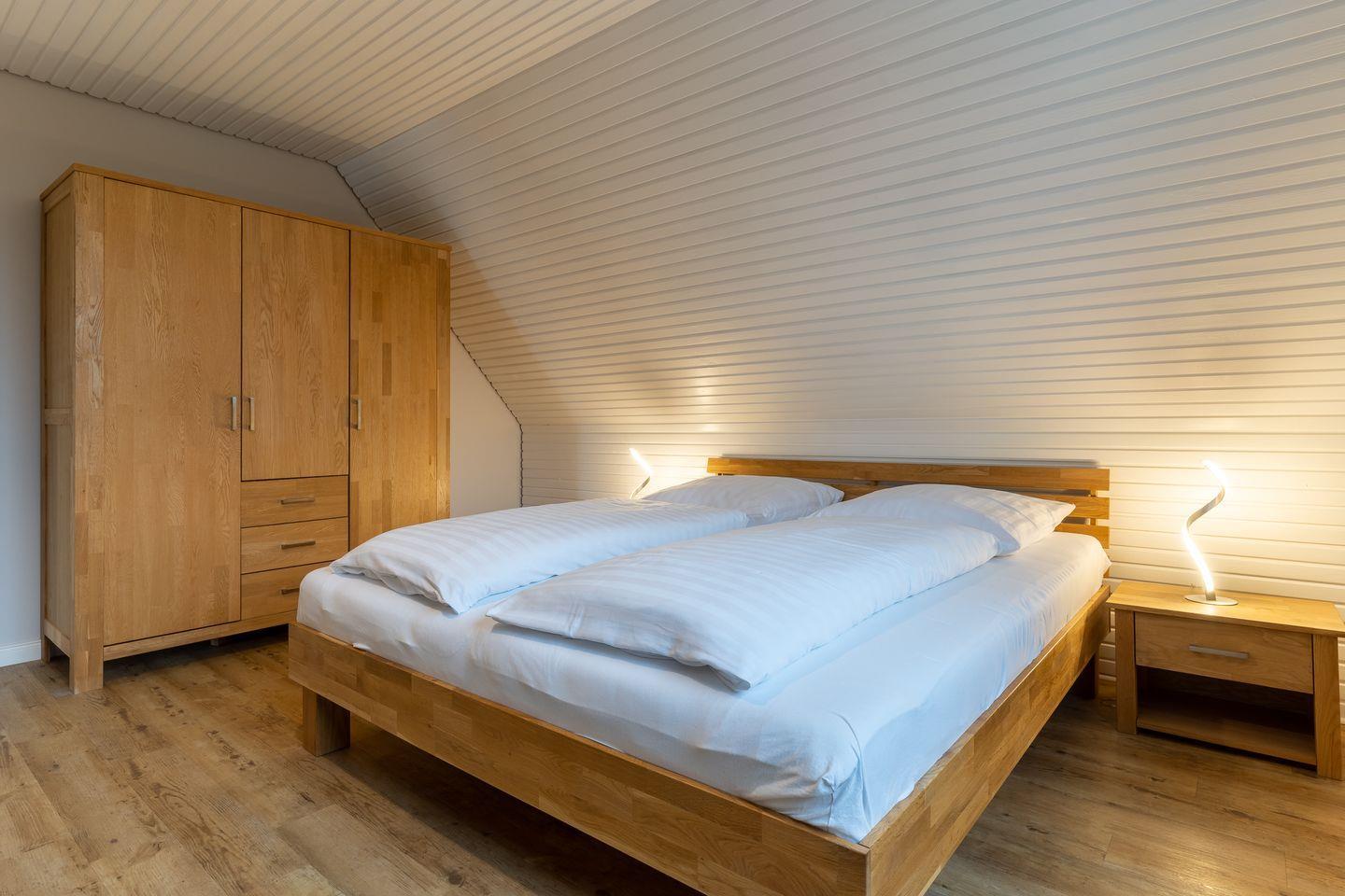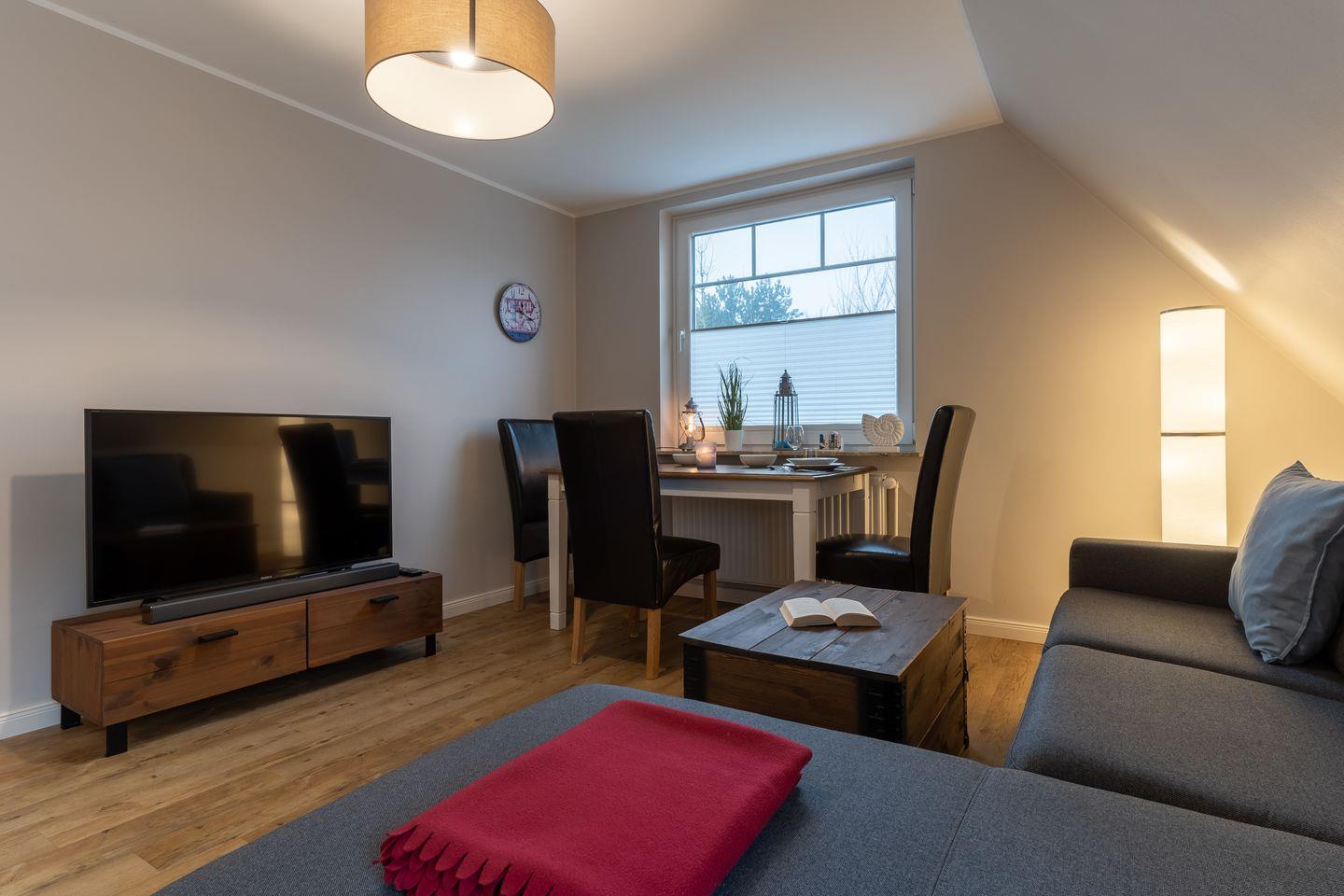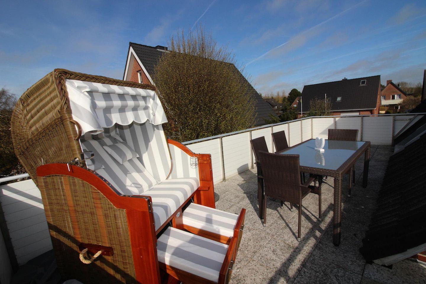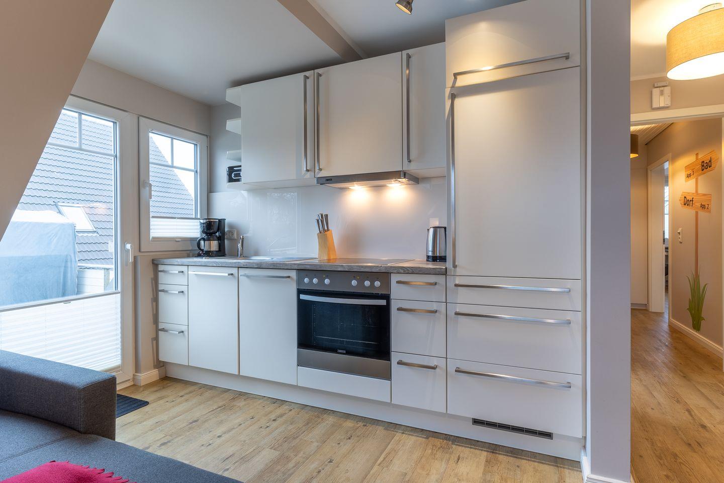 Das App. "Bad" im Ferienhaus Rückenwind verfügt über ca. 45 m² Wohnfläche und bietet Platz für 1-3 Personen. Die Wohnung befindet sich im Obergeschoss mit einem großzügige Wohnraum mit TV und einer modernen Wohnküche. Die Wohnräume sind mit neuen und modernen Möbeln ausgestattet. An den Wohnbereich schließen sich ein Duschbad, sowie ein Schlafzimmer mit einem Doppelbett (1,80 x 2,00 m) an. Zusätzlich gibt es im Wohnzimmer ein gemütliches Schlafsofa (1,40 x 2,00 m) für eine Personen. Vom Wohnzimmer gelangen Sie auf eine großzügige Dachterrasse. Hier können Sie wunderbar entspannen und die Seele baumeln lassen.