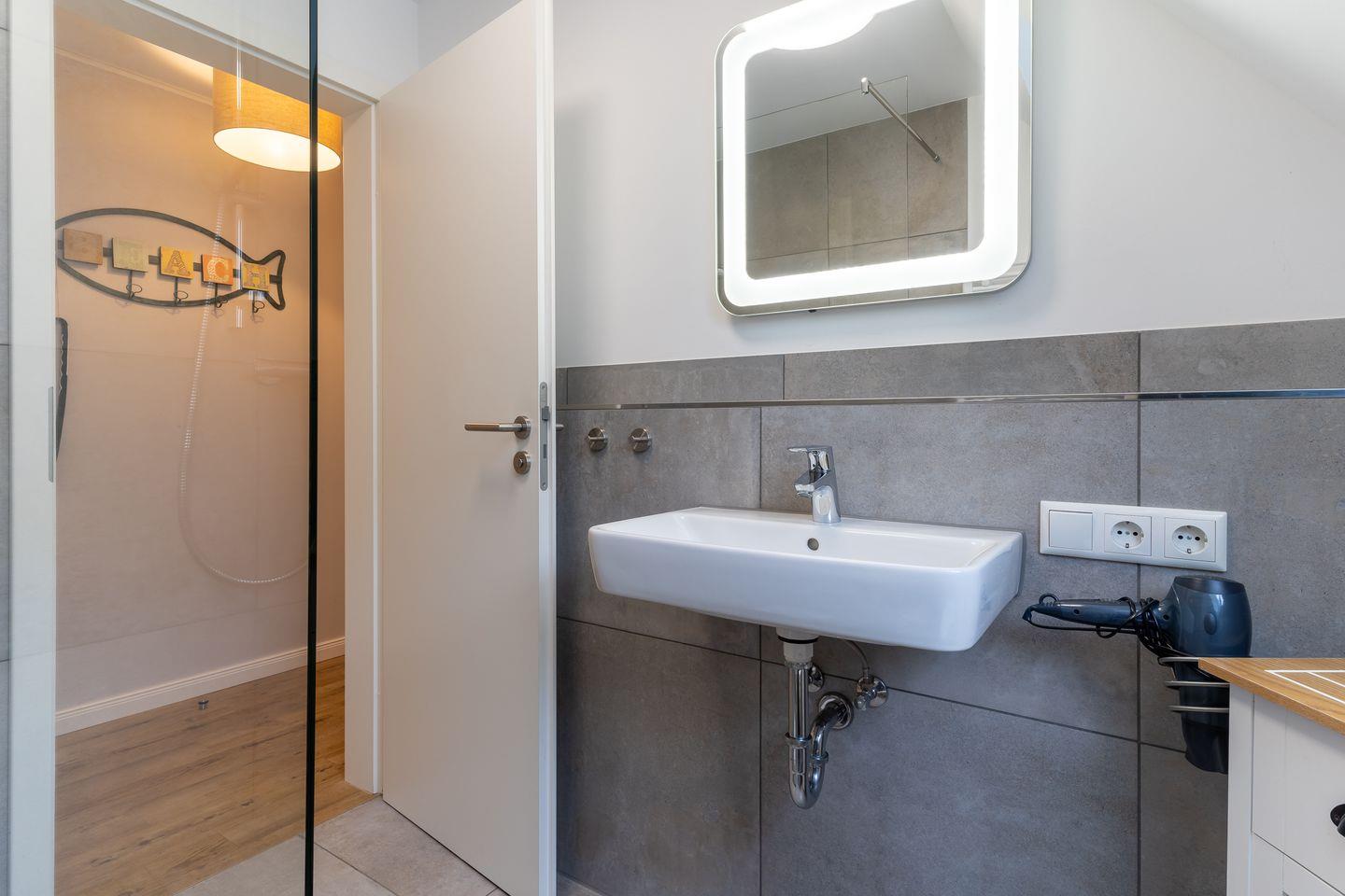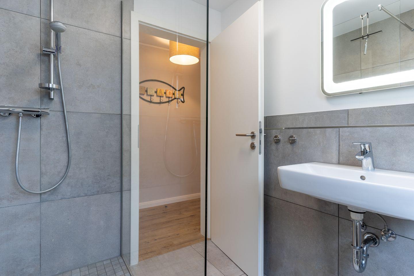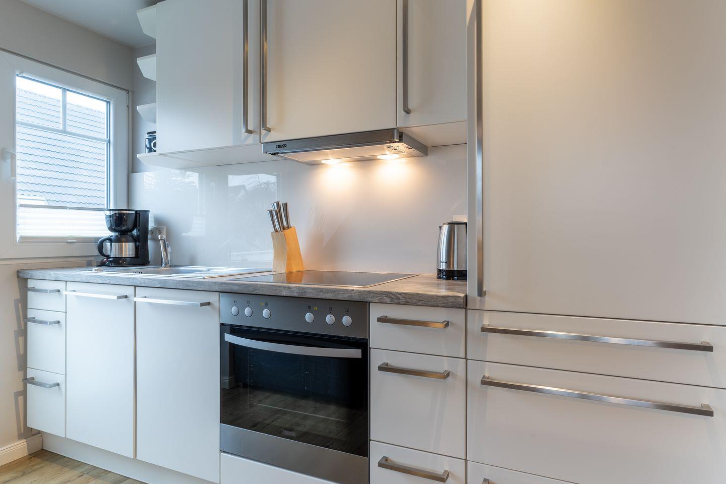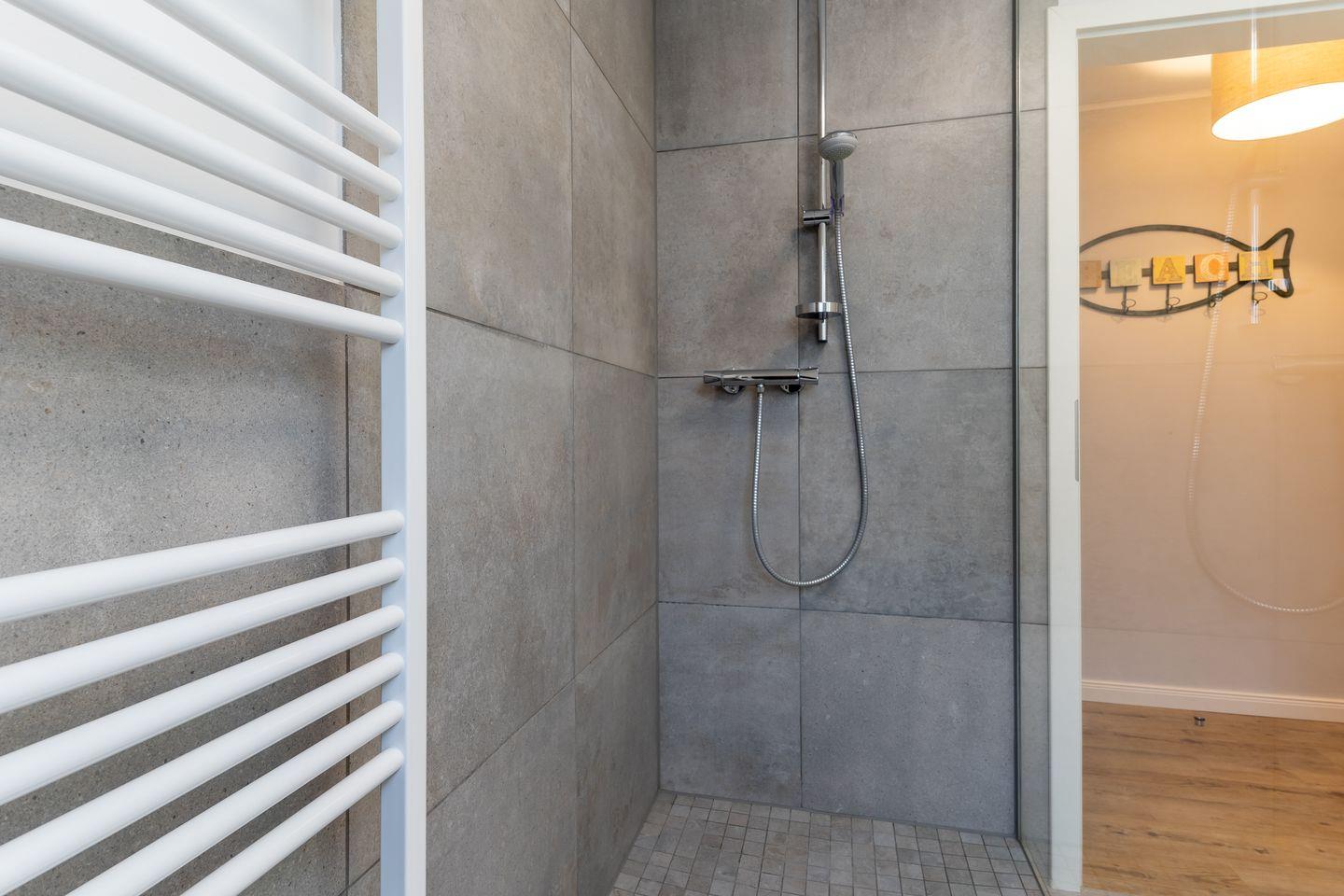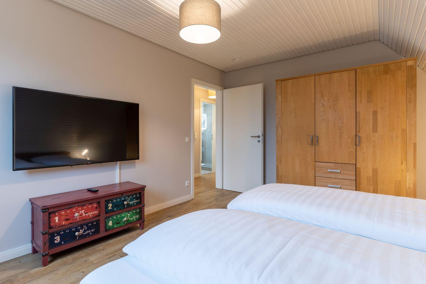 Das App. "Bad" im Ferienhaus Rückenwind verfügt über ca. 45 m² Wohnfläche und bietet Platz für 1-3 Personen. Die Wohnung befindet sich im Obergeschoss mit einem großzügige Wohnraum mit TV und einer modernen Wohnküche. Die Wohnräume sind mit neuen und modernen Möbeln ausgestattet. An den Wohnbereich schließen sich ein Duschbad, sowie ein Schlafzimmer mit einem Doppelbett (1,80 x 2,00 m) an. Zusätzlich gibt es im Wohnzimmer ein gemütliches Schlafsofa (1,40 x 2,00 m) für eine Personen. Vom Wohnzimmer gelangen Sie auf eine großzügige Dachterrasse. Hier können Sie wunderbar entspannen und die Seele baumeln lassen.