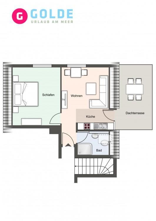 Das App. "Bad" im Ferienhaus Rückenwind verfügt über ca. 45 m² Wohnfläche. Die gemütliche Wohnung wurde mit modernen Möbeln eingerichtet und ermöglicht Ihnen einen traumhaften Urlaub in St. Peter-Ording - Bad. Es bietet Platz für 1-3 Personen im Obergeschoss.