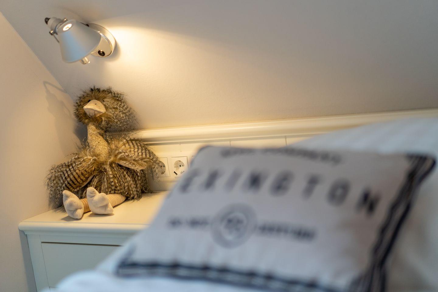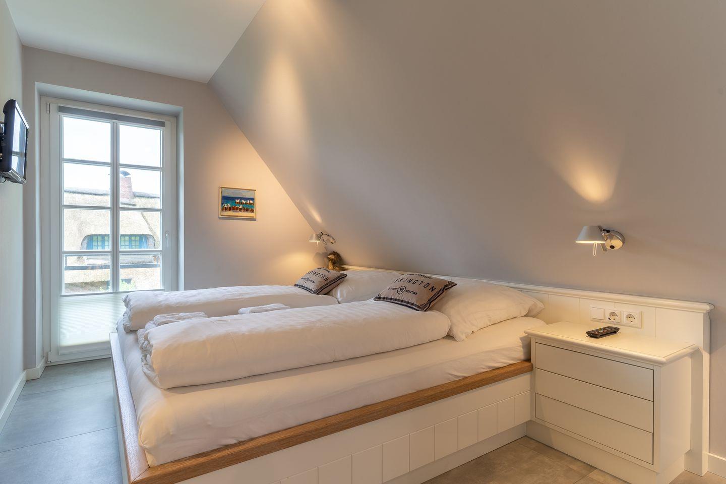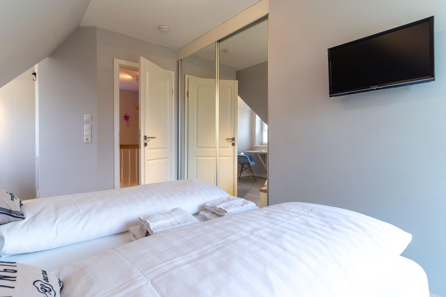 Über eine Holztreppe gelangt man in das Obergeschoss. Die beiden Schlafzimmer sind jeweils mit einem hochwertigen Doppelbett (180x200), Verdunkelung und TV Gerät ausgestattet. Im gesamten Haus sind Fliegengitter angebracht. Das Haus verfügt über eine Fußbodenheizung.