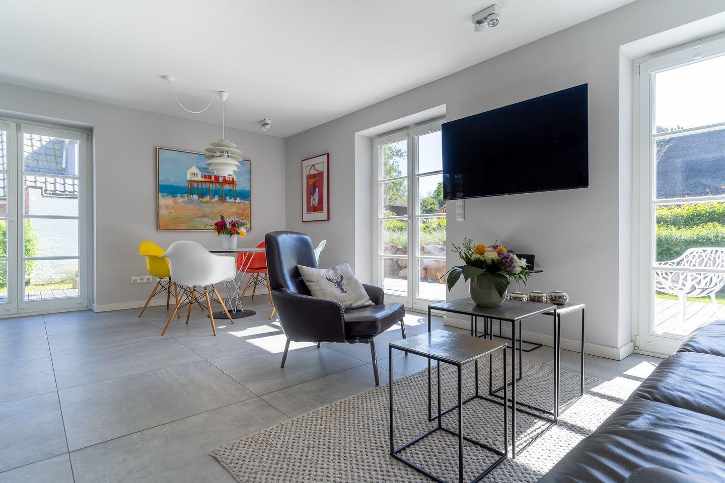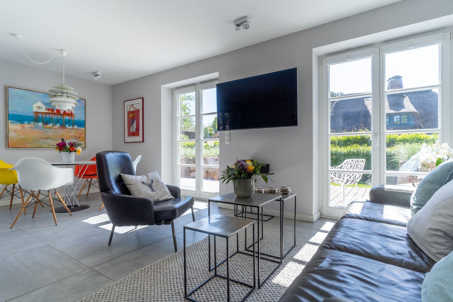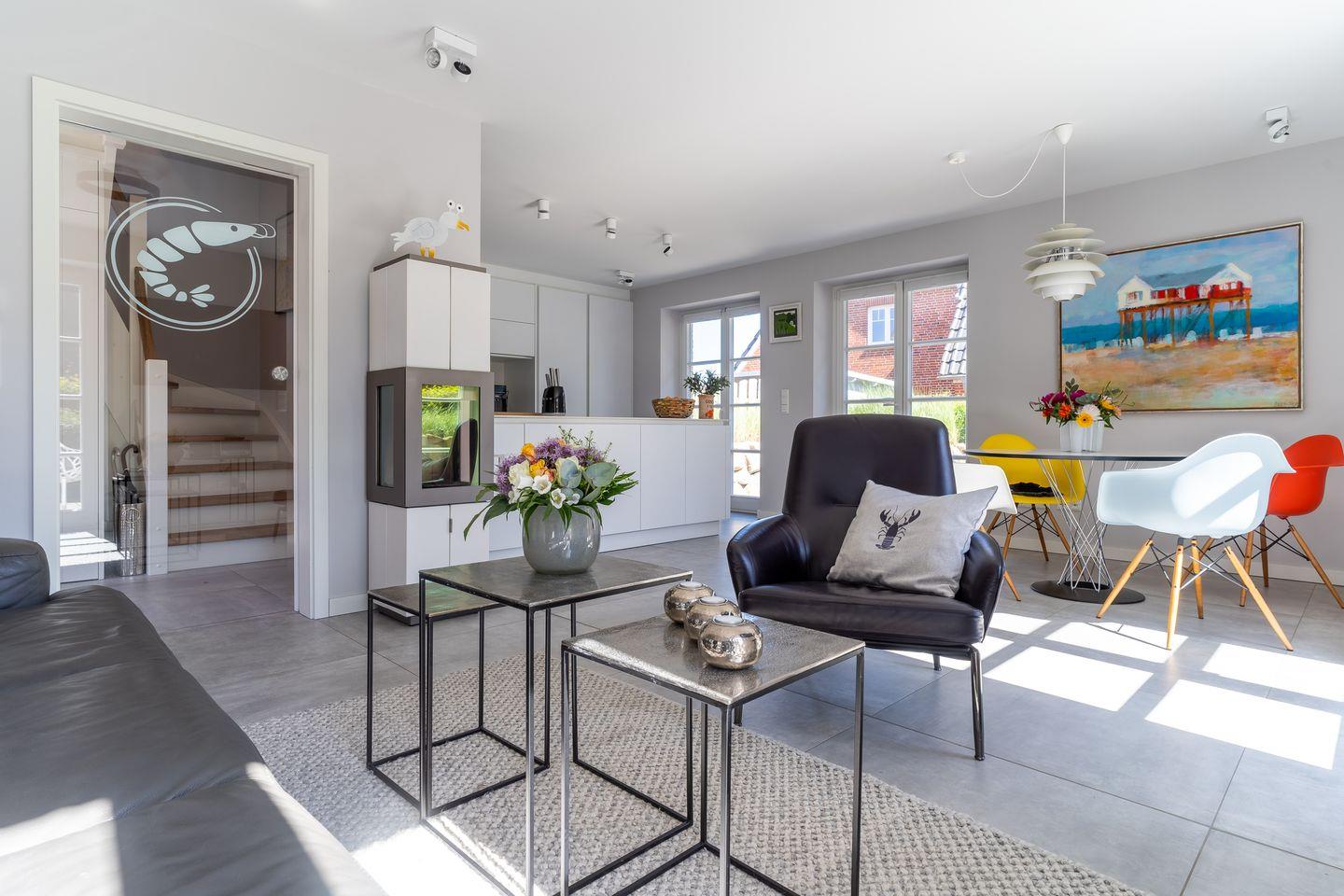 Die wunderschöne Haushälfte unter Reet verfügt über ca. 85 m² Wohnfläche und bietet Platz für 4 Personen. Im Erdgeschoss befindet sich der lichtdurchflutete Wohnraum mit TV, einer luxuriösen, offenen Küche sowie einem stilvollen Essbereich. Der Wohnraum ist mit modernen, stylischen Möbeln und einem wohligen Kamin geschmackvoll eingerichtet. Die Küche verfügt über hochwertige Elektrogeräte und ist voll ausgestattet. An den Wohnbereich schließen sich Flur, Hauswirtschaftsraum und ein Duschbad an.