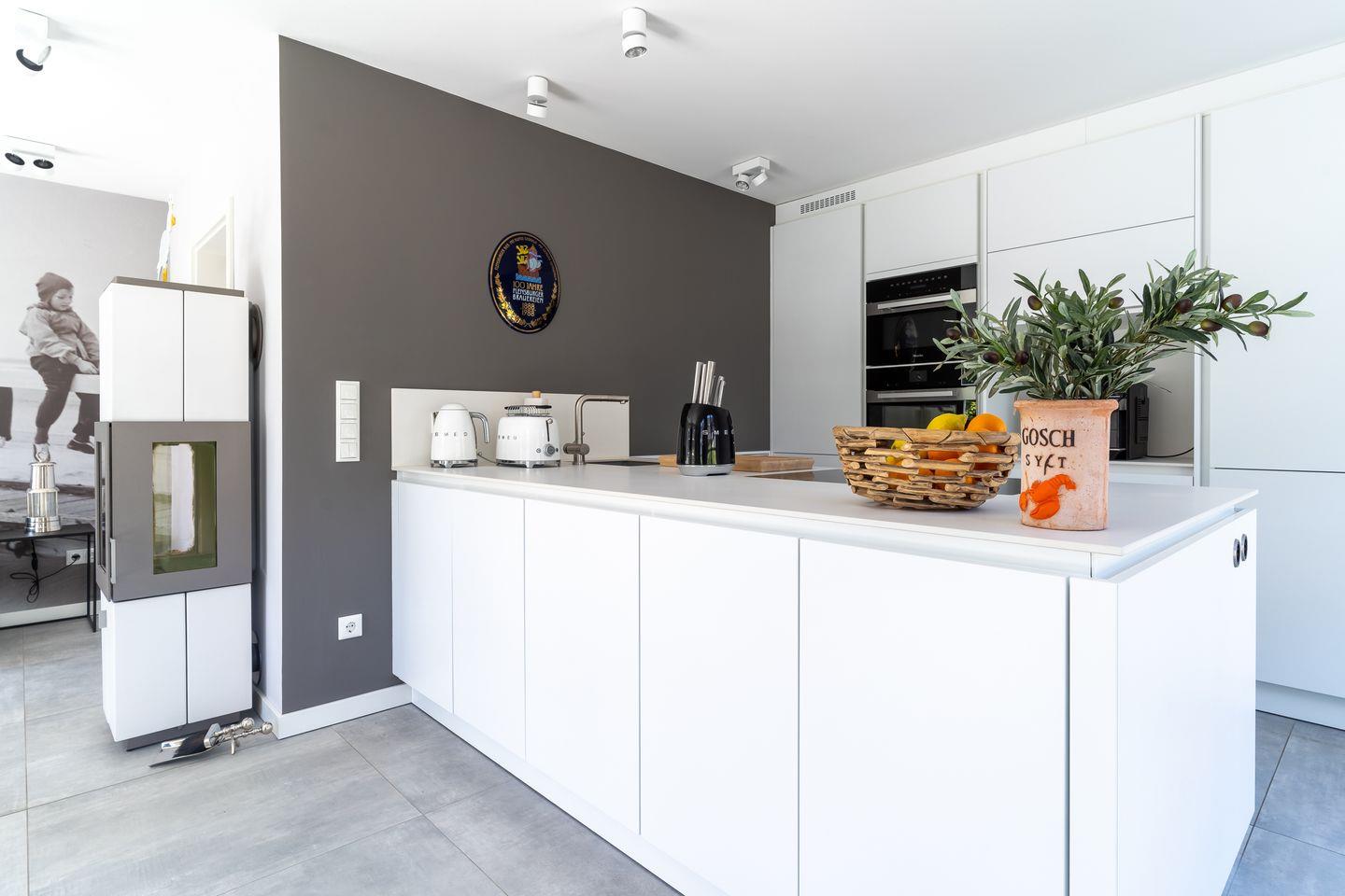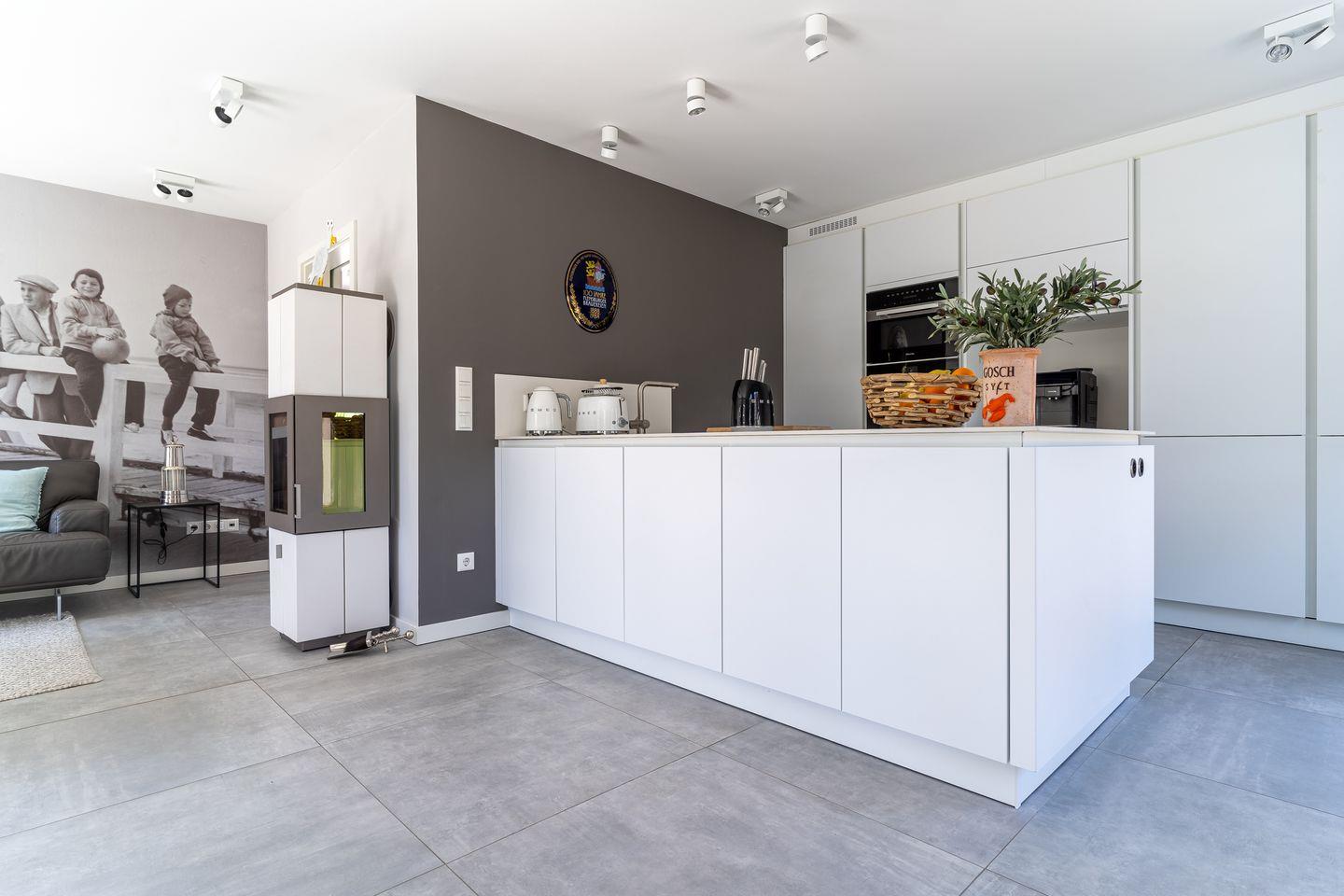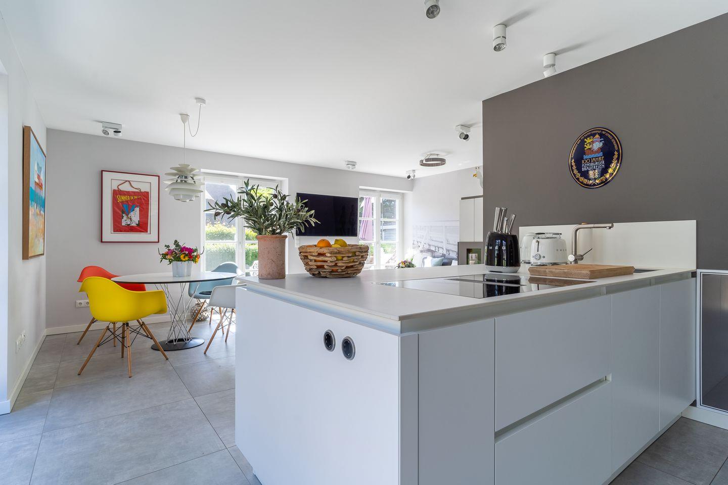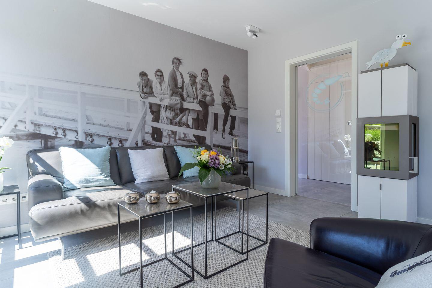 Die wunderschöne Haushälfte unter Reet verfügt über ca. 85 m² Wohnfläche und bietet Platz für 4 Personen. Im Erdgeschoss befindet sich der lichtdurchflutete Wohnraum mit TV, einer luxuriösen, offenen Küche sowie einem stilvollen Essbereich. Der Wohnraum ist mit modernen, stylischen Möbeln und einem wohligen Kamin geschmackvoll eingerichtet. Die Küche verfügt über hochwertige Elektrogeräte und ist voll ausgestattet. An den Wohnbereich schließen sich Flur, Hauswirtschaftsraum und ein Duschbad an.