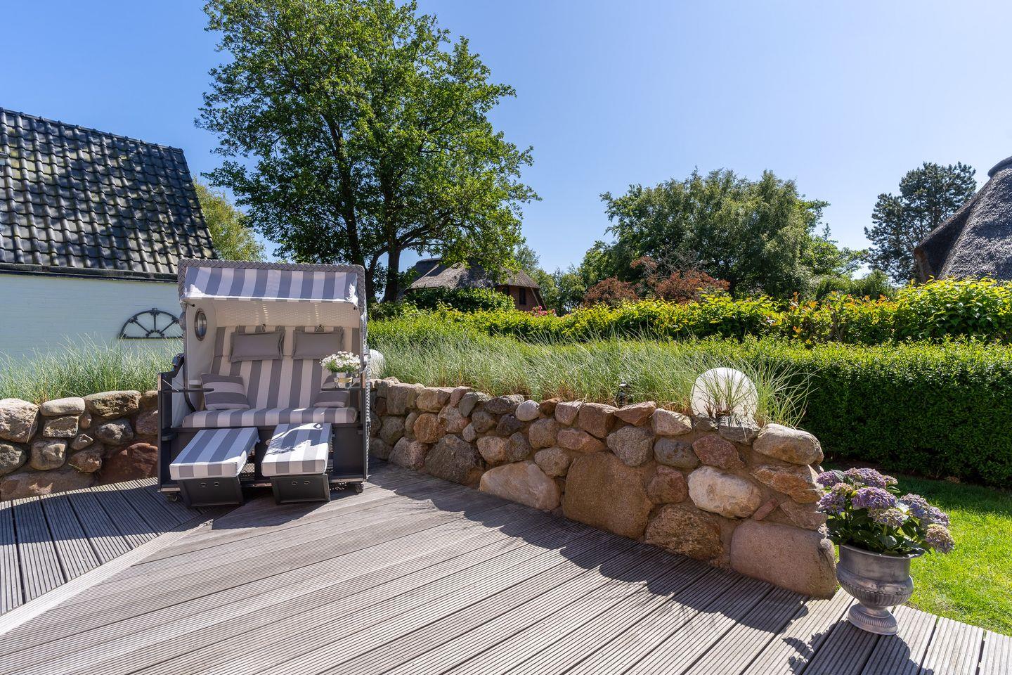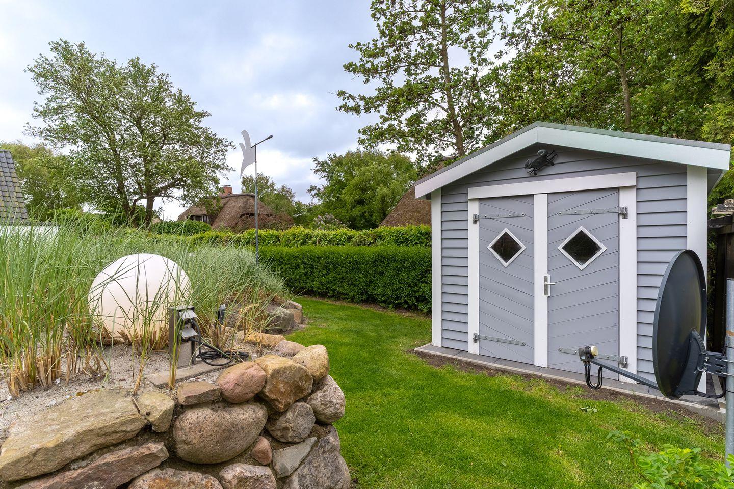 Das Grundstück mit Stellplatz, Rasenfläche und einer großzügigen (59m²) geschützten, sonnigen Süd/West-Terrasse, inklusive edlen Gartenmöbeln ist mit heimischen Pflanzen und einem Friesenwall mit Dünengras angelegt. Eine E-Bike Lademöglichkeit ist vorhanden.