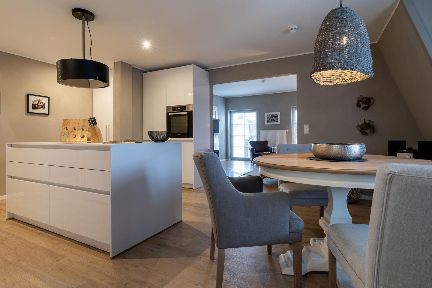In der ersten Etage, die über eine großzügige Außenholztreppe zu erreichen ist, befindet sich der lichtdurchflutete Wohnraum mit TV, Kamin, einer offenen Küche mit Küchenblock sowie einen stilvollen Essbereich. Die Küche ist mit hochwertigen Elektrogeräten ausgestattet und bildet mit seinem angrenzenden Wohnraum das Herzstück des Appartements. Die Wohn- und Schlafräume sind mit exklusiven Möbeln von Riviera Maison ausgestattet. An den Wohnbereich schließen sich ein Windfang mit Garderobe und ein mit edlen Granitfliesen und Fußbodenheizung ausgestattetes Duschbad an. Die Wohnung verfügt über einen geschmackvollen Dekorholzfußboden.