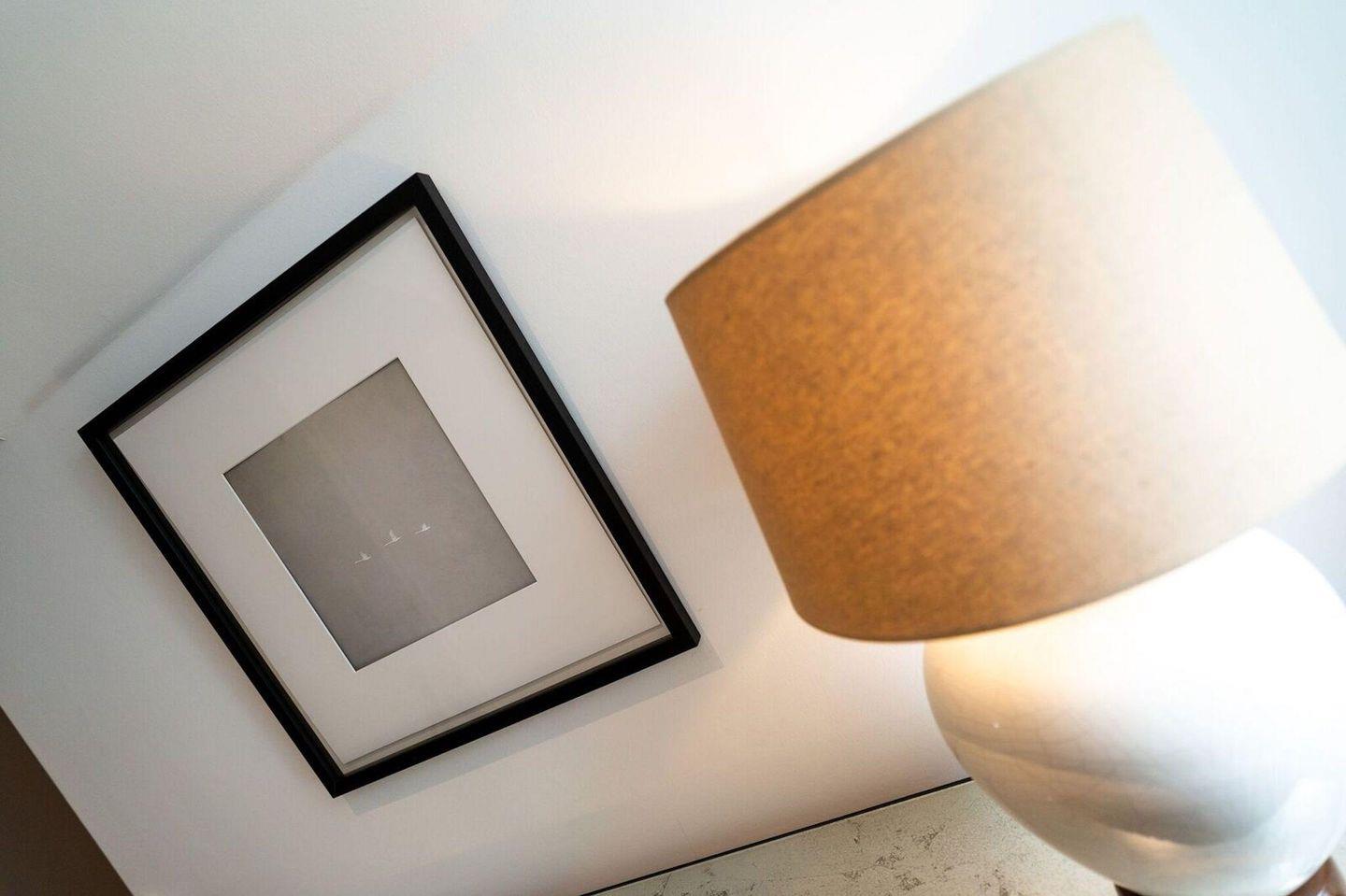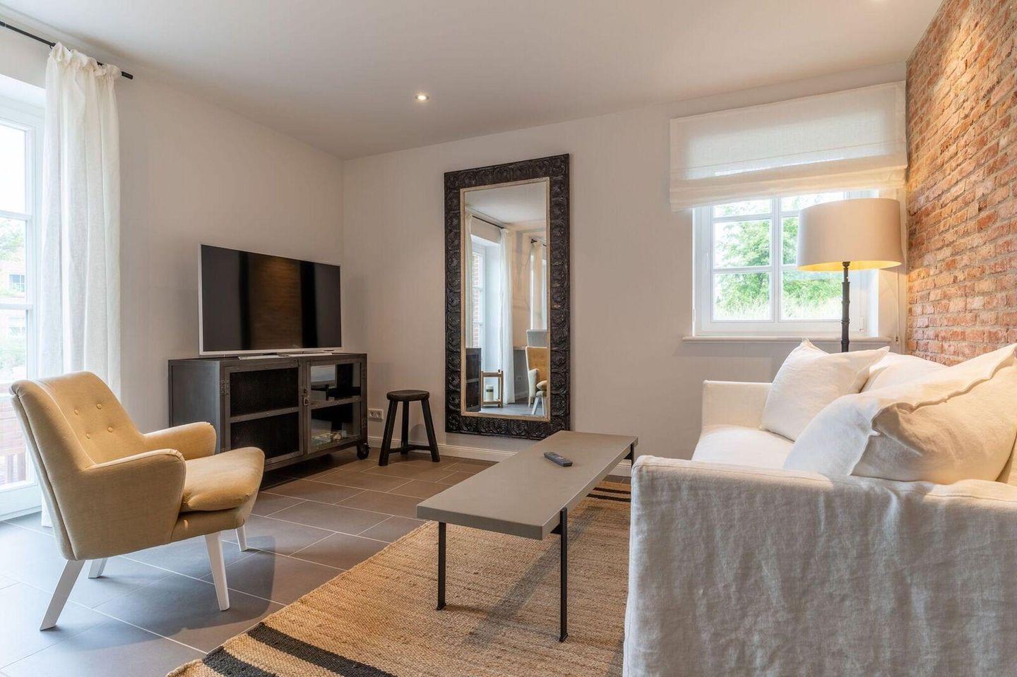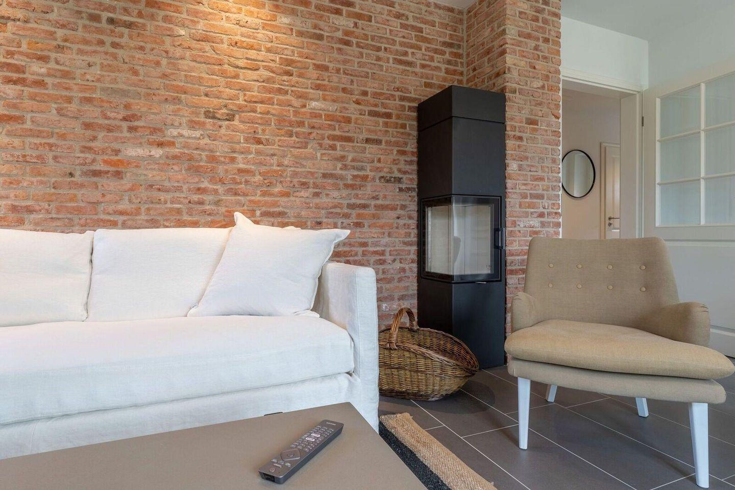 Im Erdgeschoss befindet sich der lichtdurchflutete Wohnraum mit TV und Bluetooth-Stereo-Anlage, einer luxuriösen, angrenzenden Küche sowie einem stilvollen Essbereich. Der Wohnraum ist mit modernen, stylischen Möbeln und einem wohligen Kaminofen geschmackvoll eingerichtet. Die Küche ist hochwertig mit einem Induktionsherd, einer Mikrowellen-/Backofenkombination und einem Kühlschrank mit Eisfach ausgestattet. An den Wohnbereich schließen sich Flur, ein Duschbad und ein Doppelschlafzimmer mit TV an.