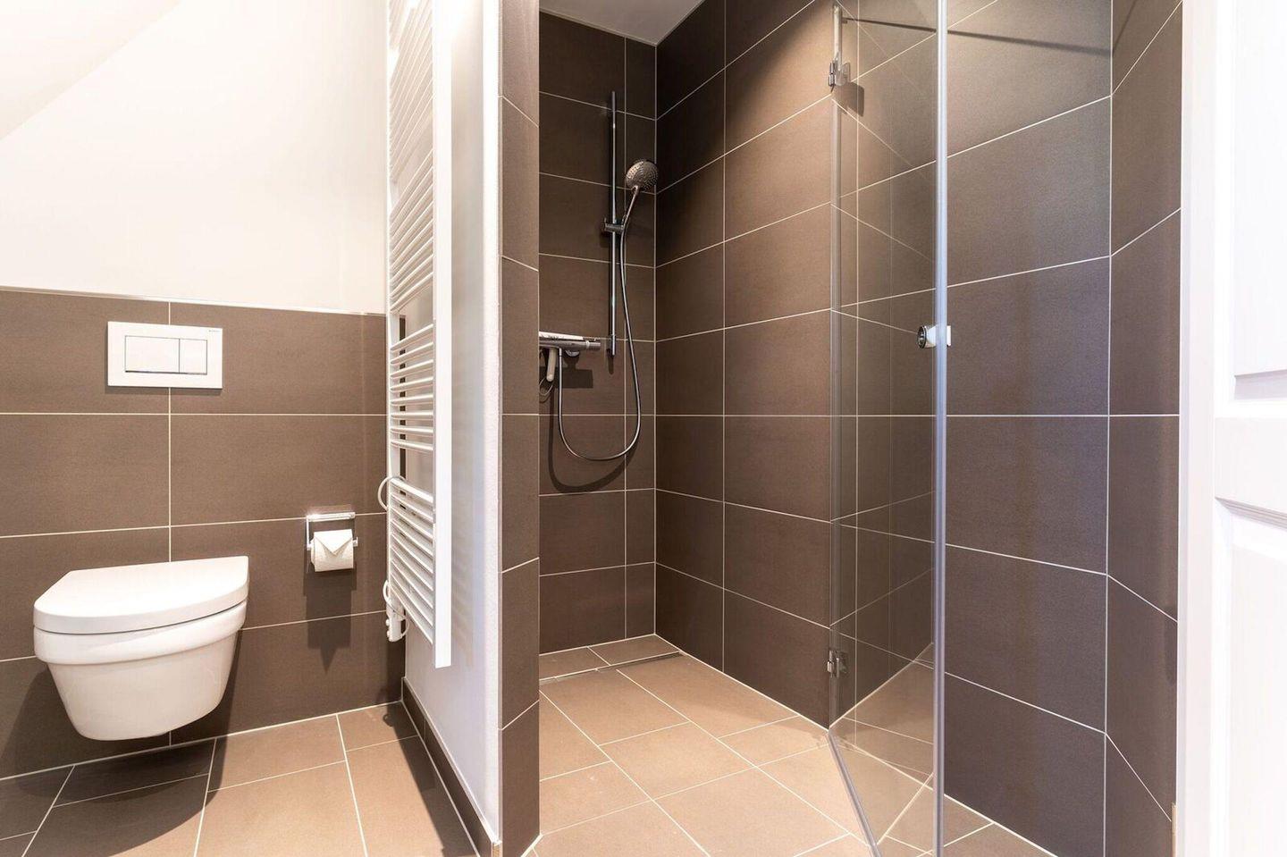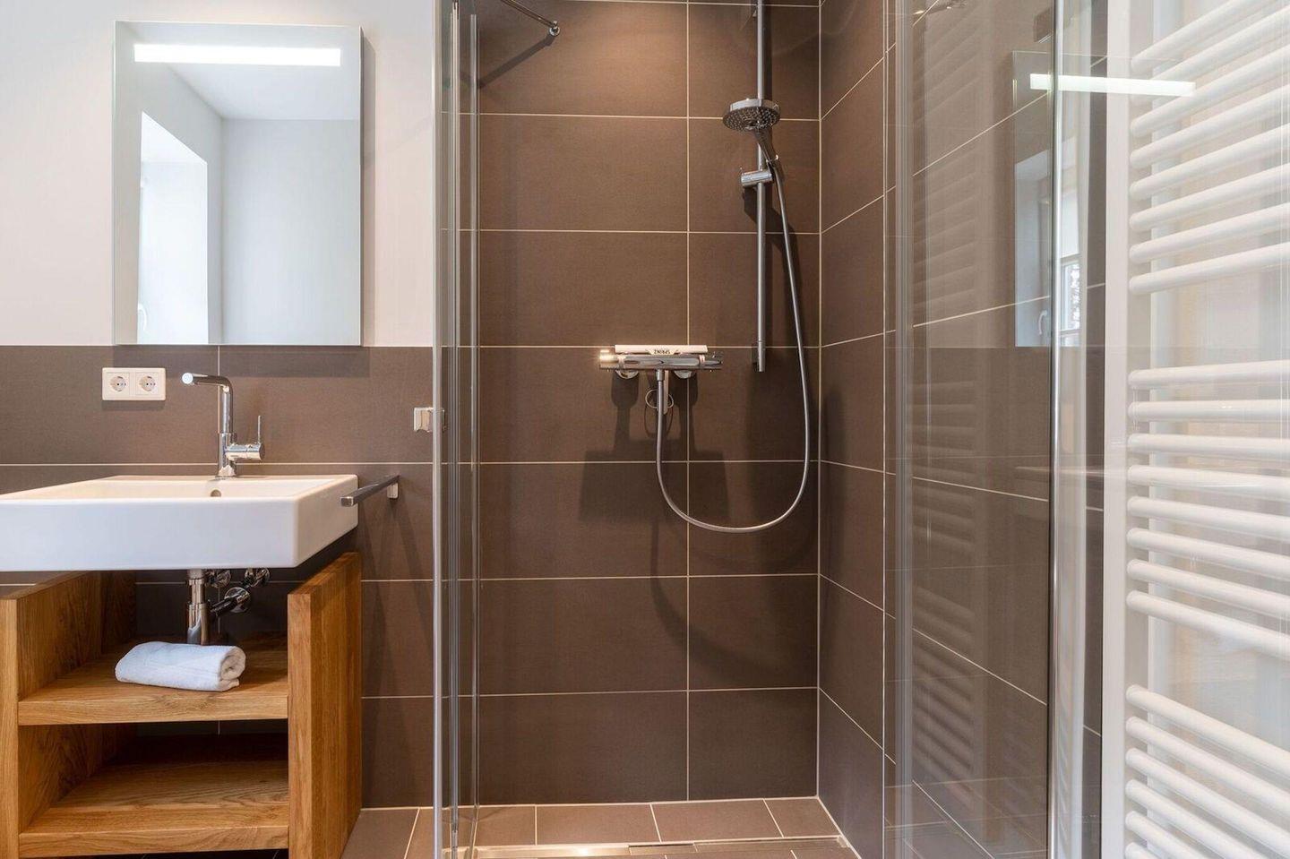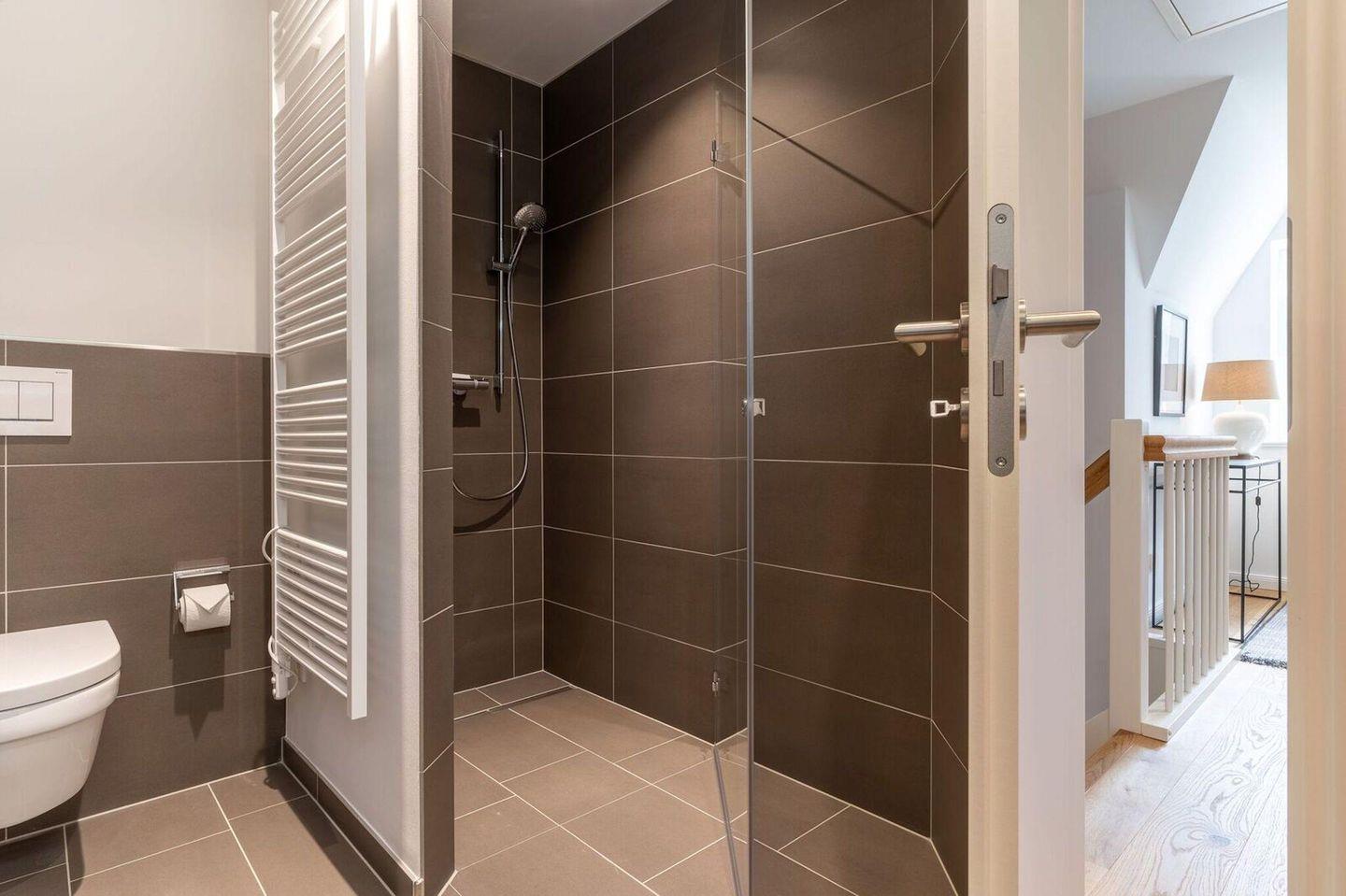 Darüber hinaus befindet sich im Obergeschoss ein weiteres, modernes Bad mit Dusche und einer Wasch-/Trockenmaschine.