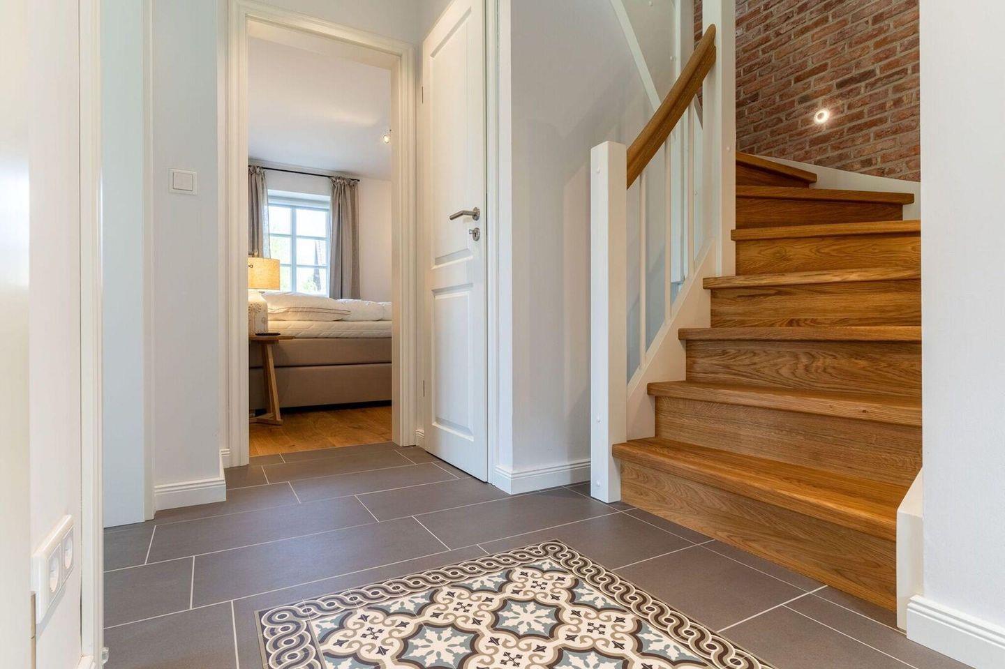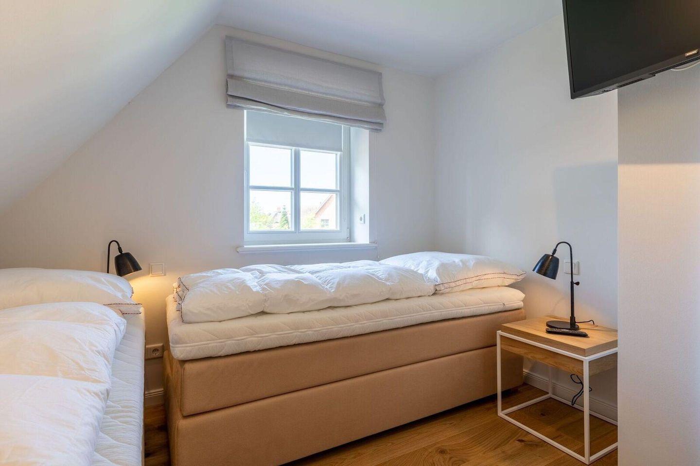 Über eine Holztreppe gelangt man in das Obergeschoss. Die beiden dortigen Schlafzimmer, eines mit Doppelbett und das andere mit 2 Einzelbetten und TV, bieten ruhevolle Erholung.