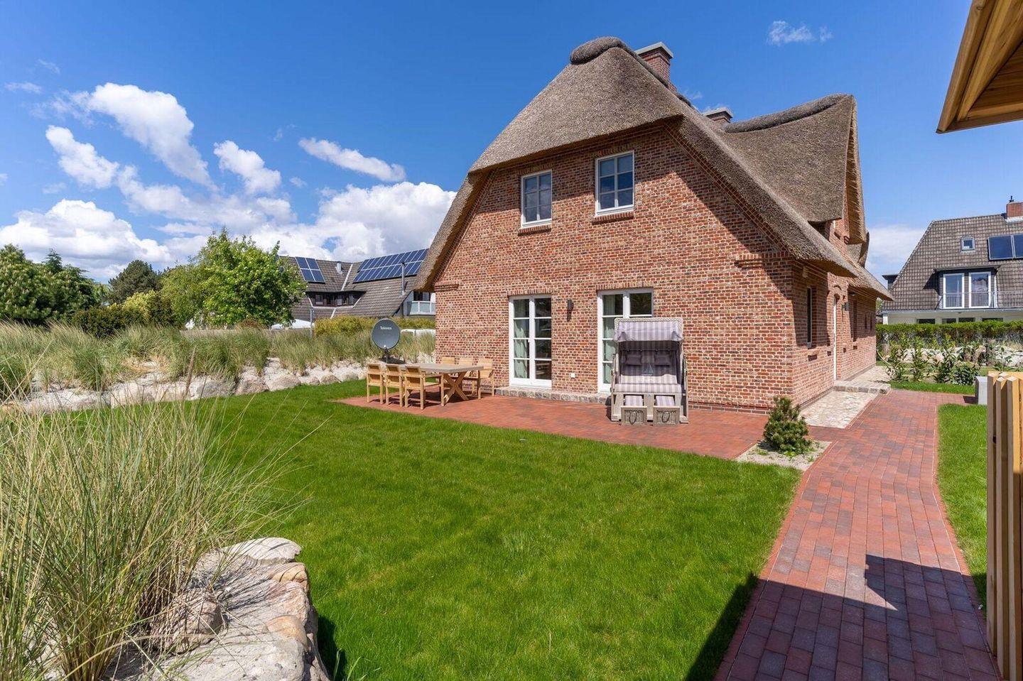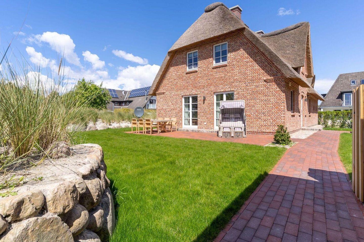 Das Grundstück mit Carport, abschließbarem Fahrradraum, Rasenfläche und einer großzügigen, sonnigen Terrasse, inklusive edler Gartenmöbel, ist mit heimischen Pflanzen und einem Friesenwall mit Dünengras angelegt.