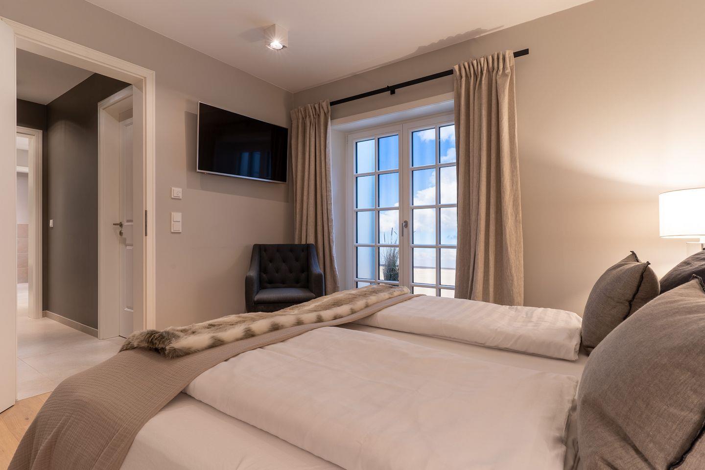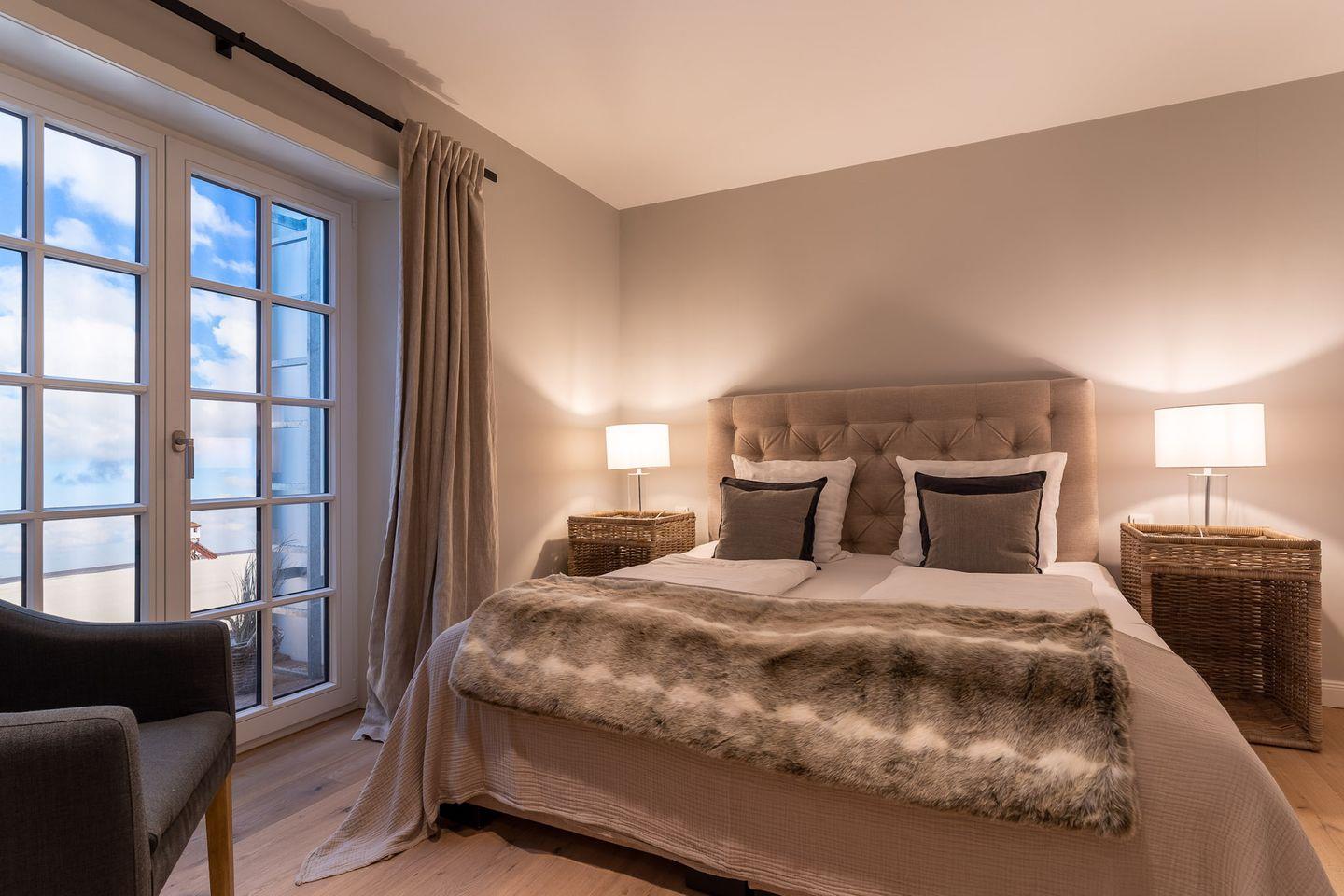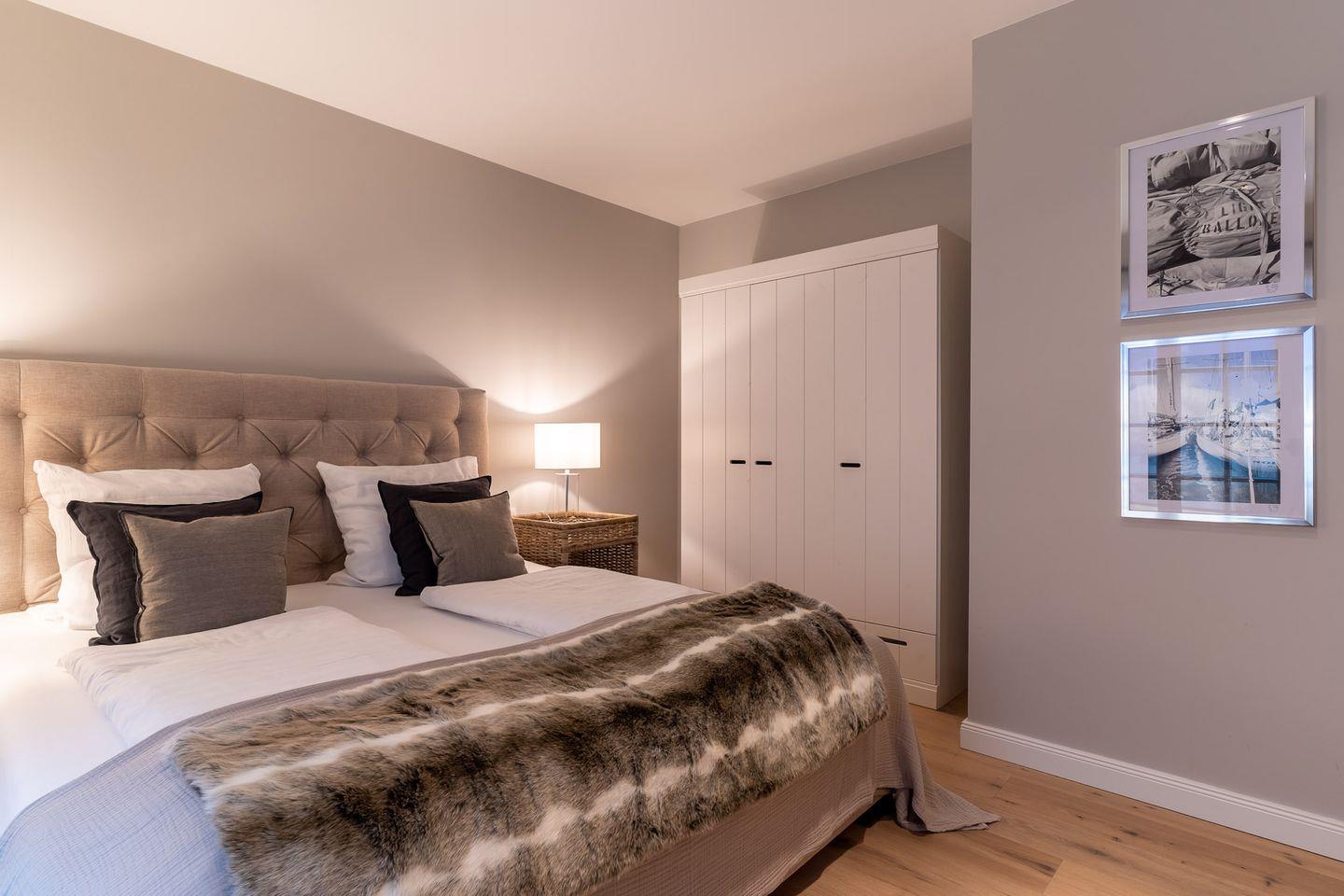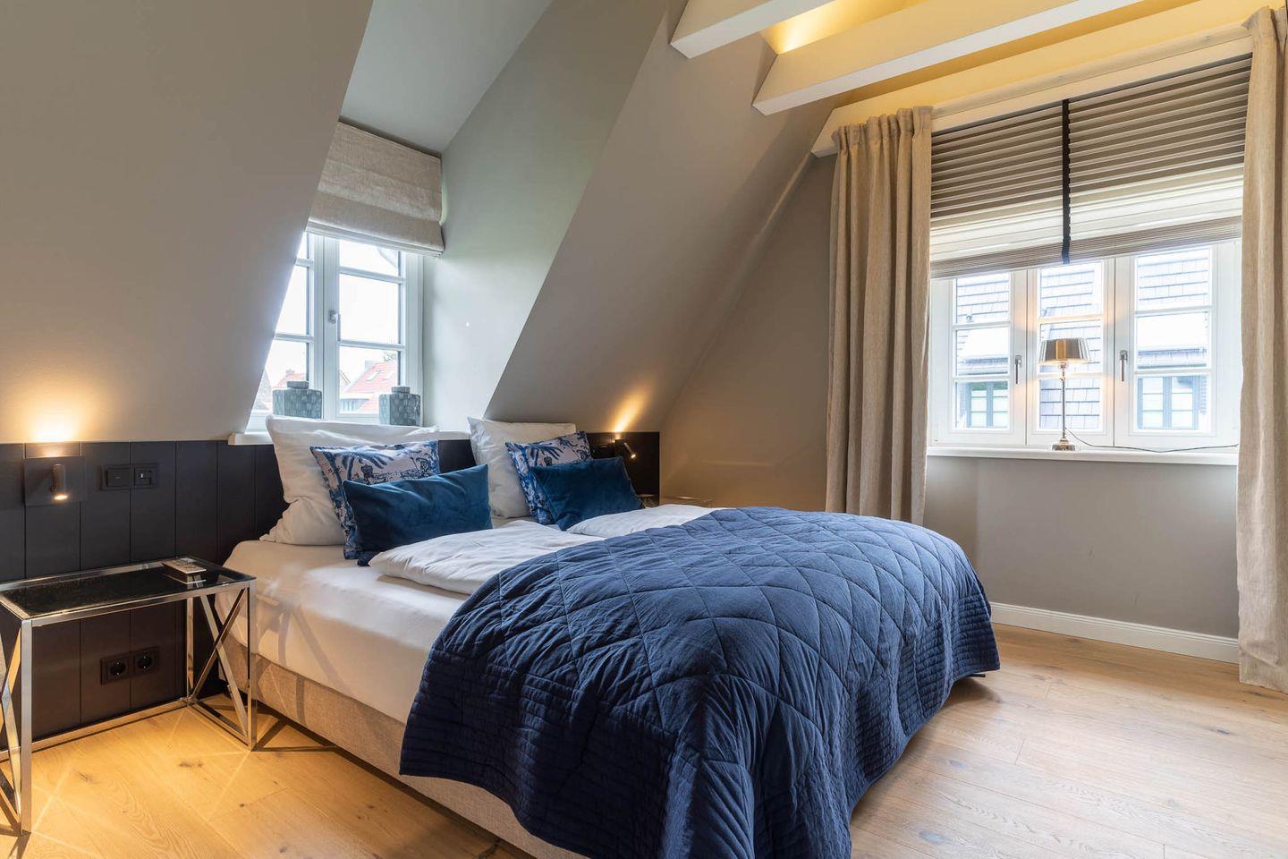 Über eine Holztreppe gelangt man in das Obergeschoss. Die zwei Schlafzimmer, jeweils mit einem Doppelbett ausgestattet, sind bis unter das Dach geöffnet. Dies gibt den Räumen viel Luft und abends durch die indirekte Beleuchtung eine besondere Gemütlichkeit. Die Schlafzimmer sind ebenfalls mit TV ausgestattet. Kleiderschränke und Kommode gewähren Ihnen viel Stauraum.