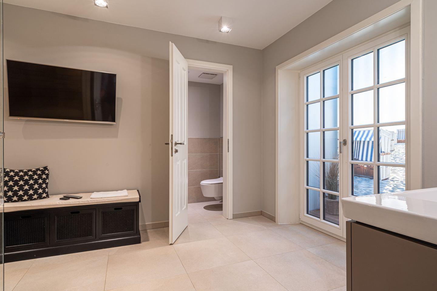 Das volle Wohlfühlprogramm erwartet Sie im Untergeschoss, das sowohl durch natürliches Tageslicht, als auch durch eine Strandbilder-Beleuchtung illuminiert wird. Sie gelangen direkt in den großzügigen Entspannungsbereich mit Sauna, freistehender Badewanne, großer Raindance-Dusche und TV.