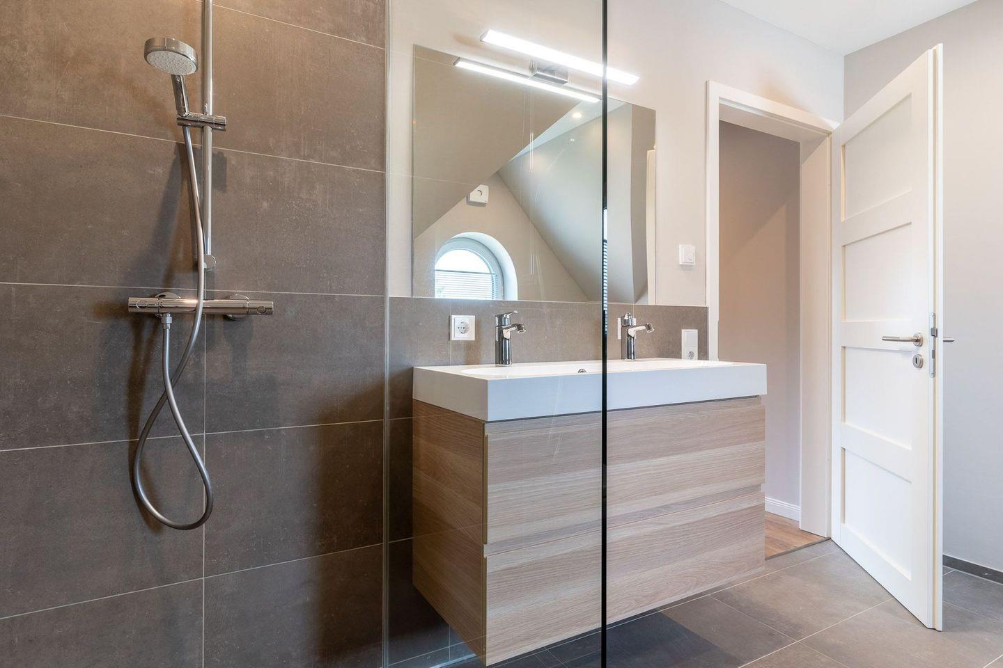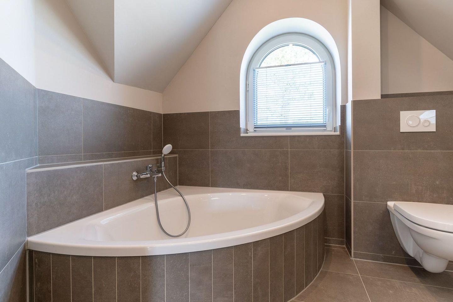 Ein zweites vollausgestattetes Badezimmer im OG, mit einer Dusche, einer Eckbadewanne und zwei einzelnen Waschbecken runden das hochwertige Hauskonzept ab und lassen keine Wünsche offen.