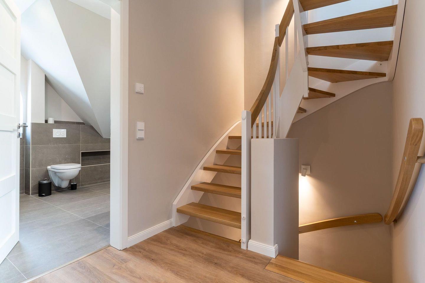Über eine Holztreppe gelangt man in das Obergeschoss.