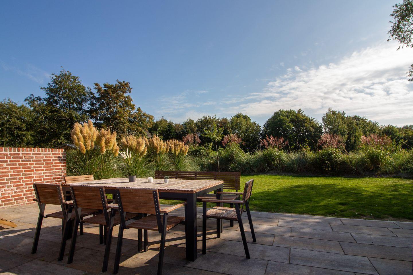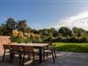 Das große, grün angelegte Grundstück mit Sandspielecke und Blick auf die angrenzende Obstwiese lässt sofort Urlaubsstimmung aufkommen.