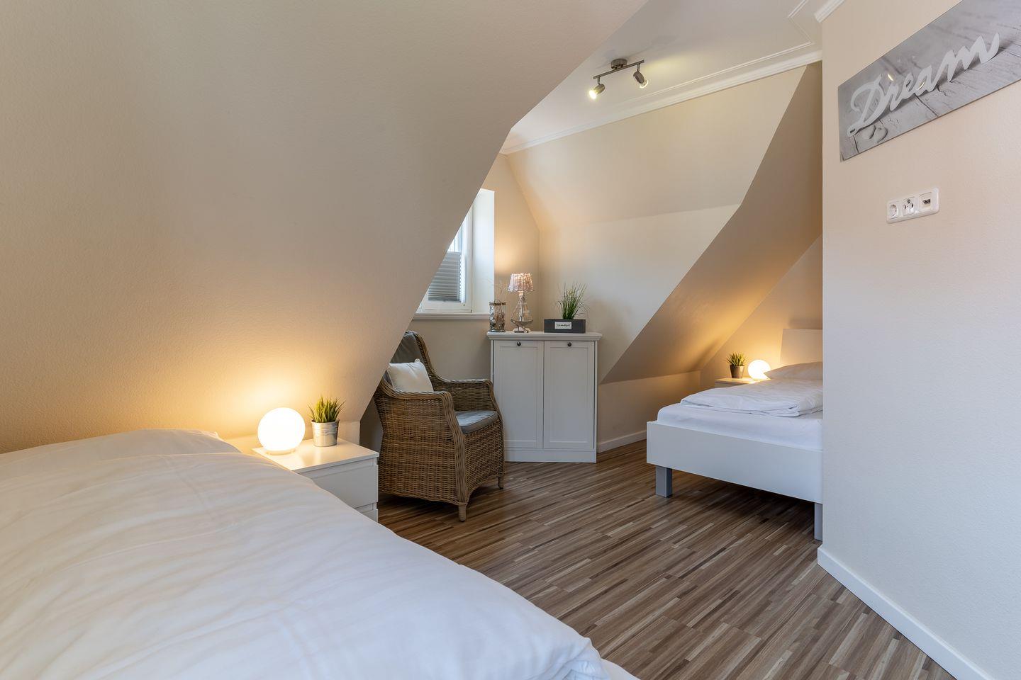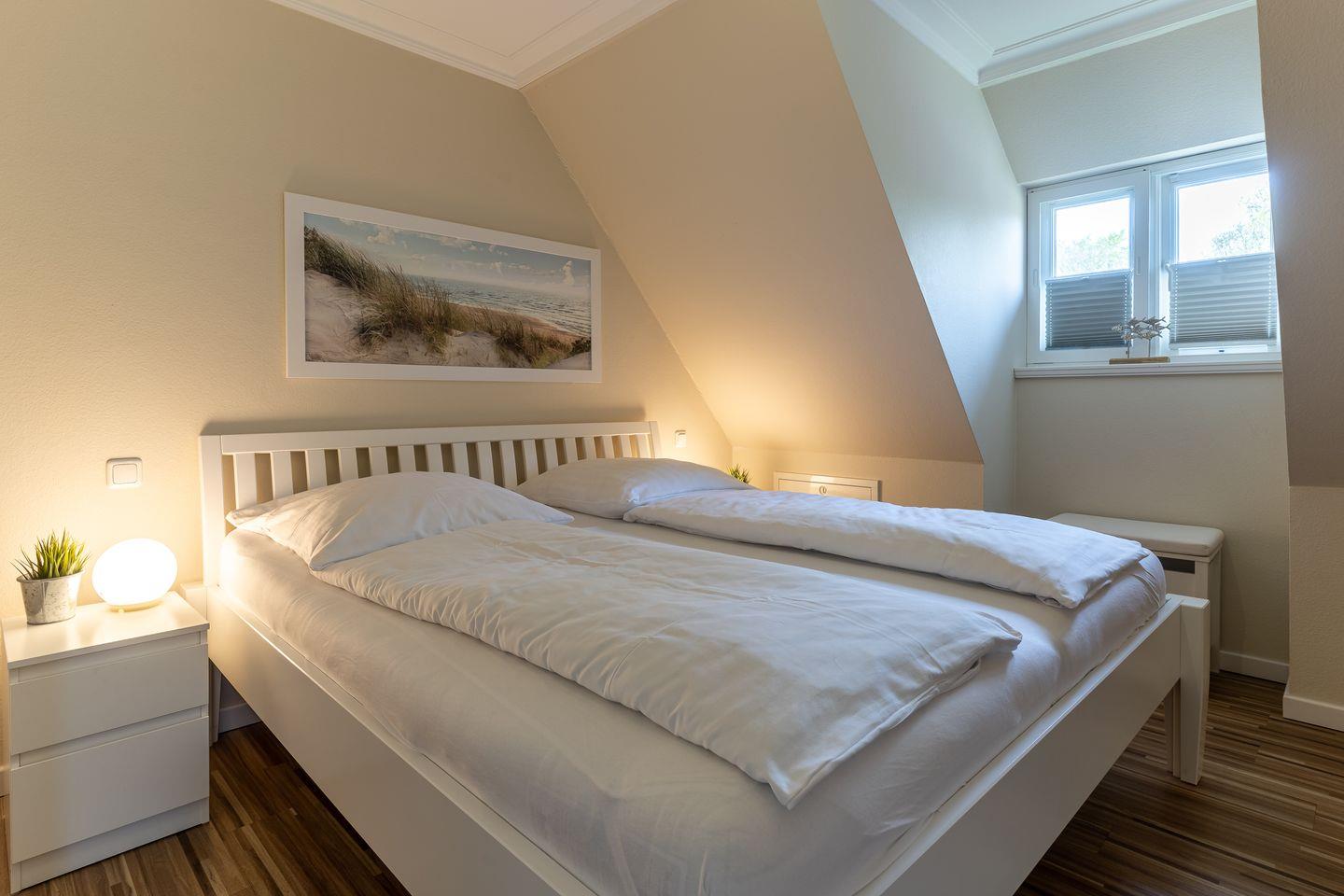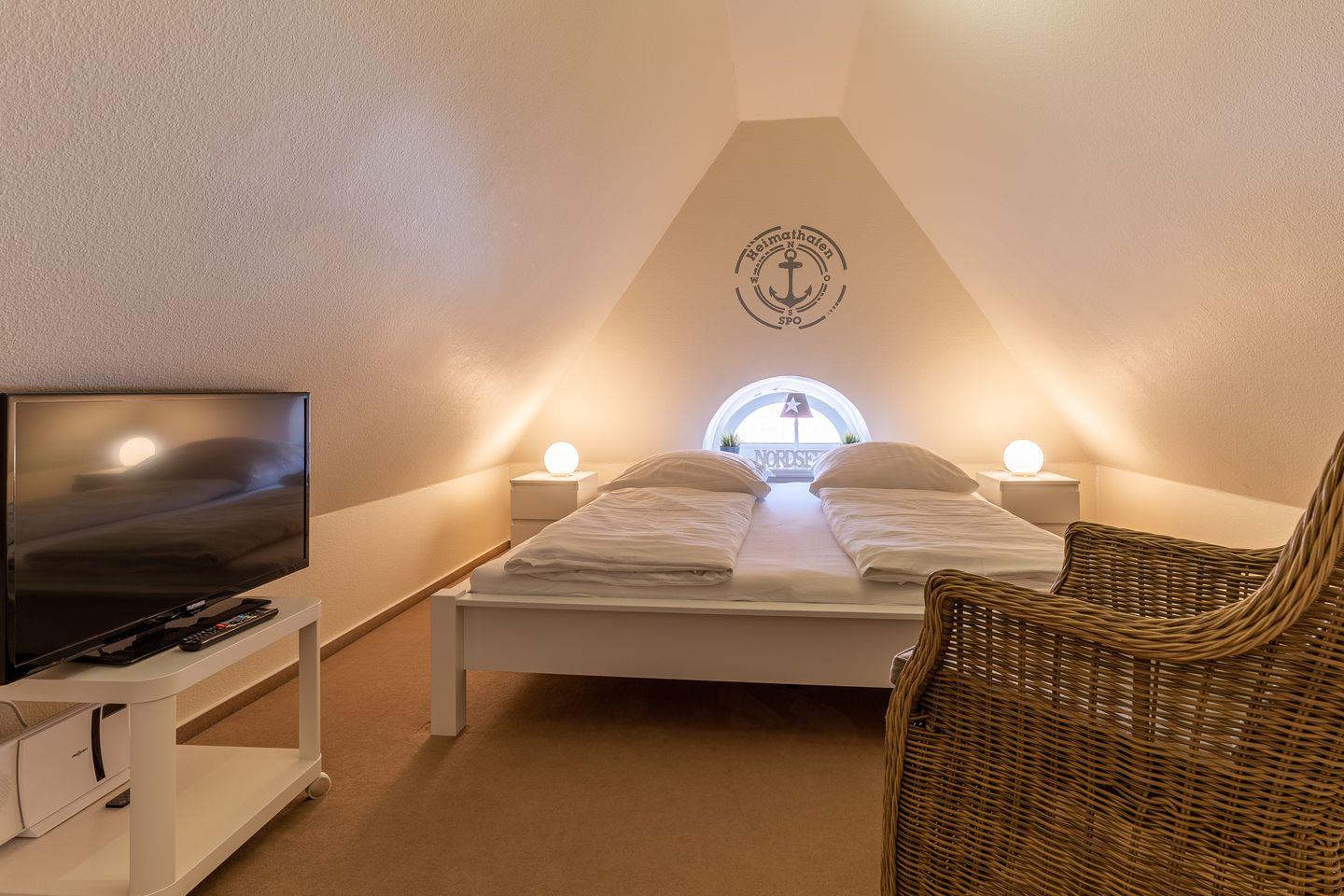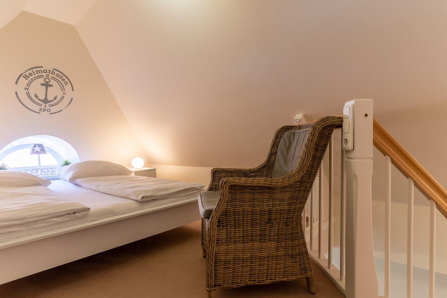 Über eine weitere Holztreppe geht es vom Flur ins Dachgeschoss mit einem gemütlichen Doppelbett.
