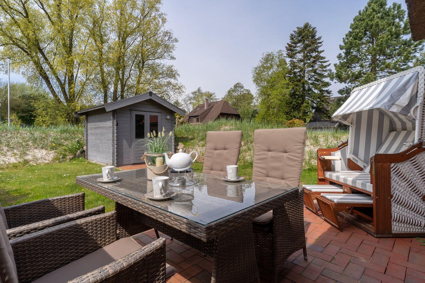 Wunderschön angelegte Terrasse mit einer Sitzgruppe und Strandkorb ausgestattet. In einer Ecke des Gartens befindet sich ein Gartenhaus zum abstellen der Fahrräder. Die außergewöhnlich ruhige Lage in einer Sackgasse ermöglicht Ihnen ungestörte und entspannte Stunden.