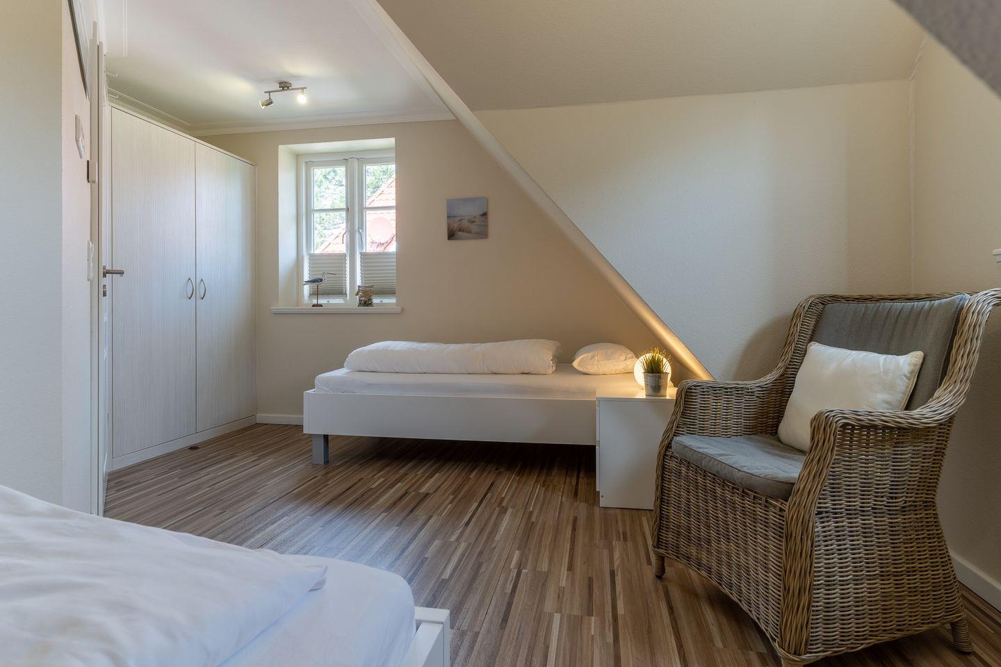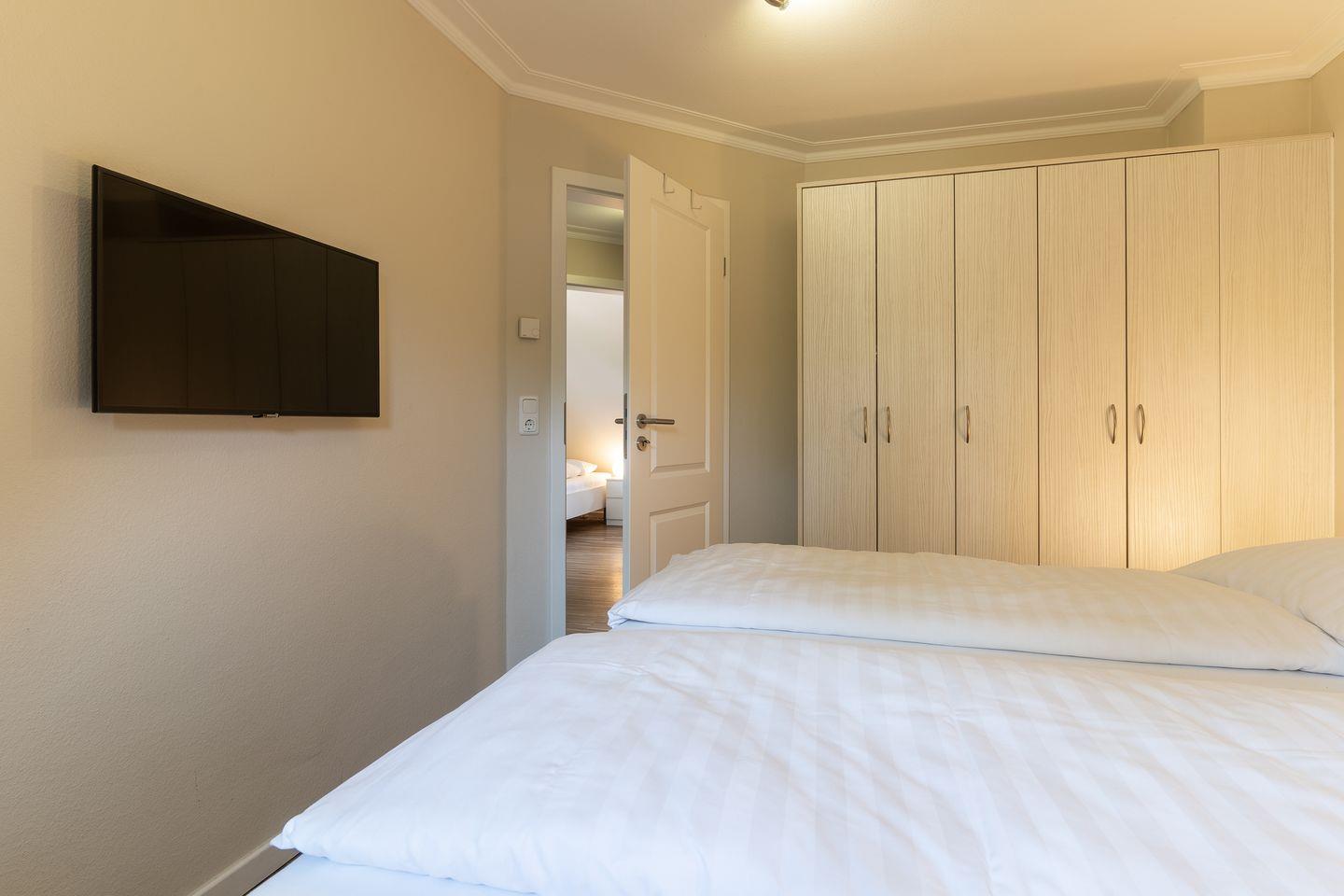 Ein Schlafzimmer ist mit einem großen Doppelbett ( 1,80m x 2,00m ), ein weiteres Schlafzimmer mit zwei Einzelbetten ( 90 cm x 2,00 m ) ausgestattet. Die Schlafzimmerfenster sind mit einem Mückenschutzgitter ausgerüstet.